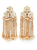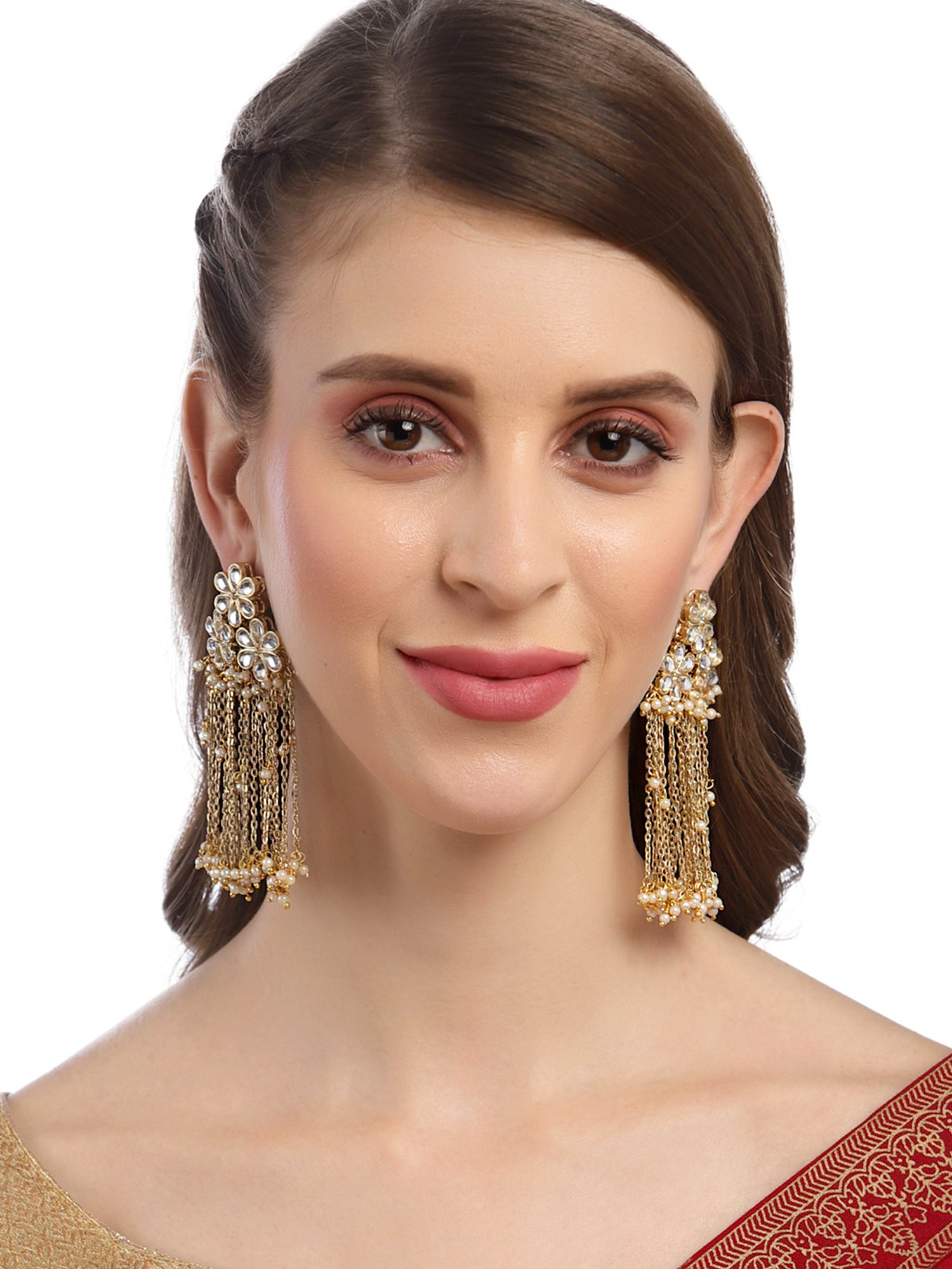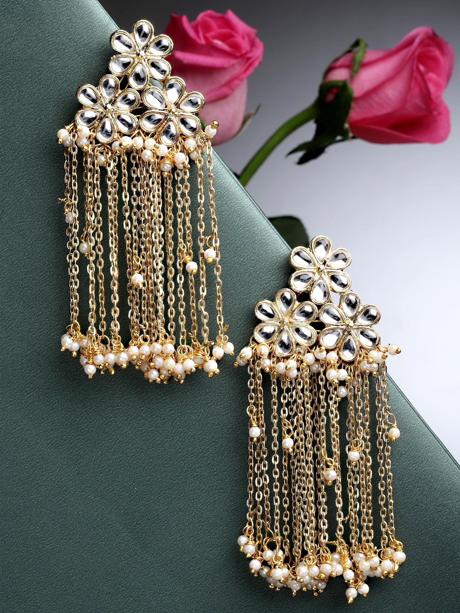 - Karatcart Gold Plated White Pearl Kundan Tassel Earrings for Women .It is made with high-quality Kundan Stones which makes them very skin-friendly. Perfect for Weddings, Parties, Festivals, and Traditional Occasions. Gracefully pair Saree, Kurti, or any Indo-western outfit to enhance your look. These are made from toxic-free materials which are Anti-Allergic and Safe for the skin.