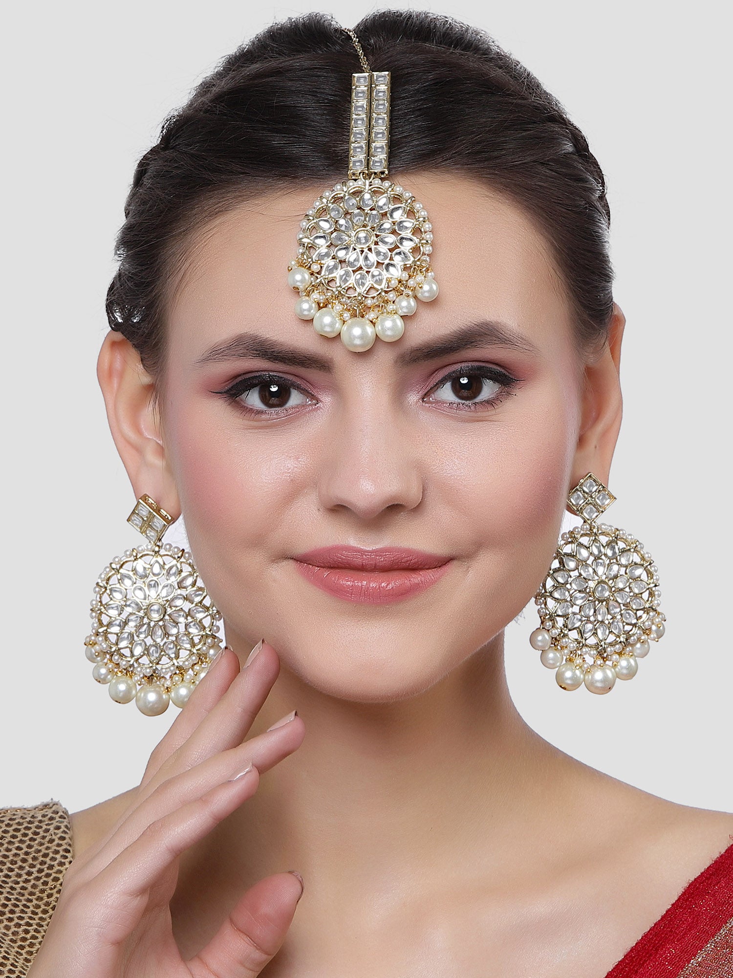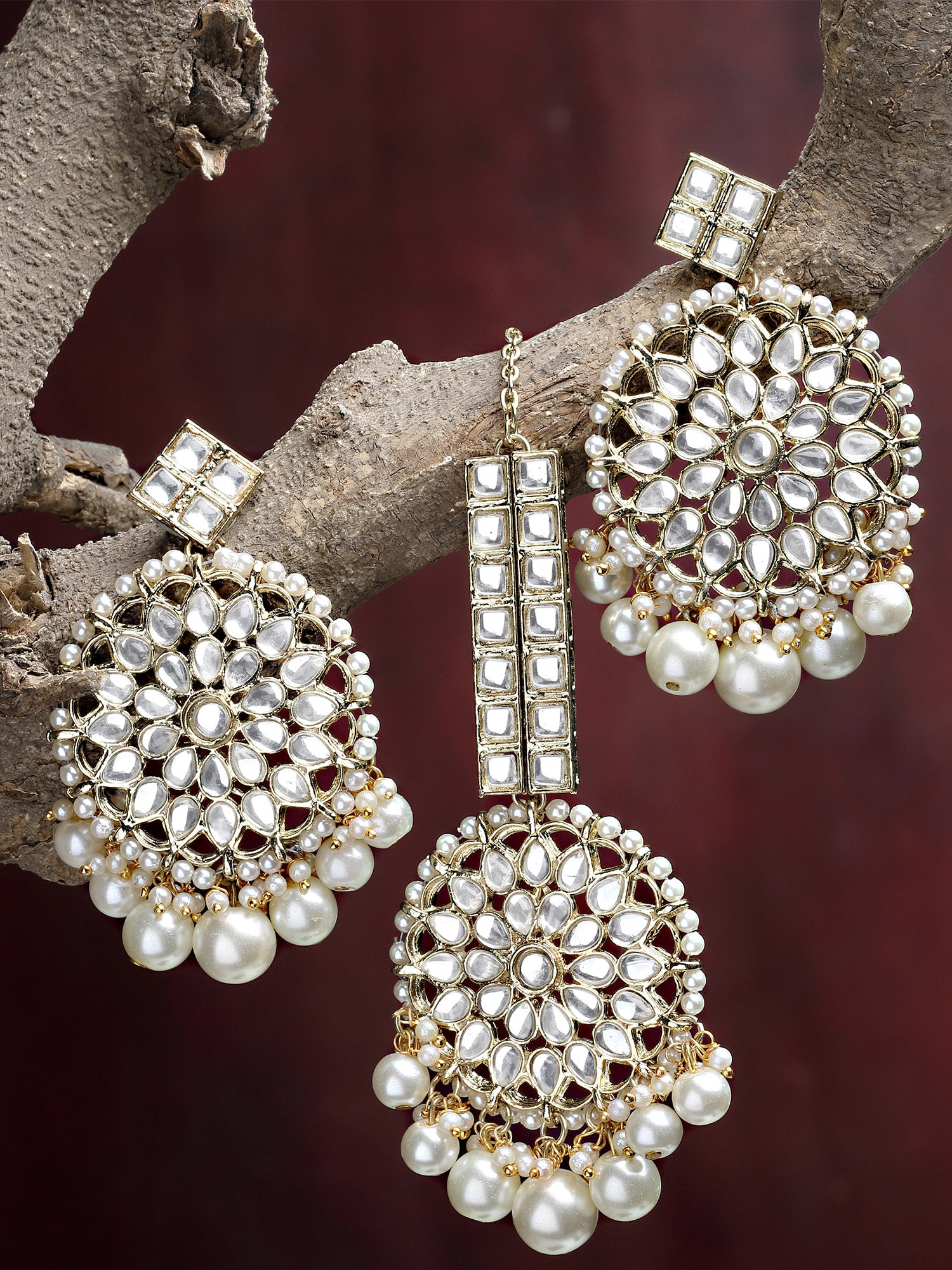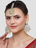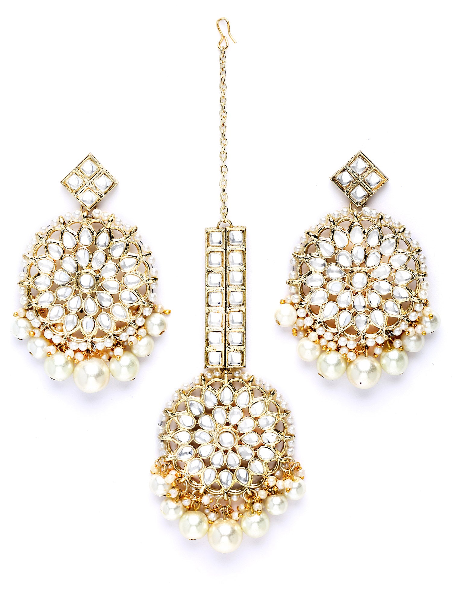 Karatcart Gold Plated White Pearl Beaded Kundan Earrings and Maangtikka Combo Set for Women