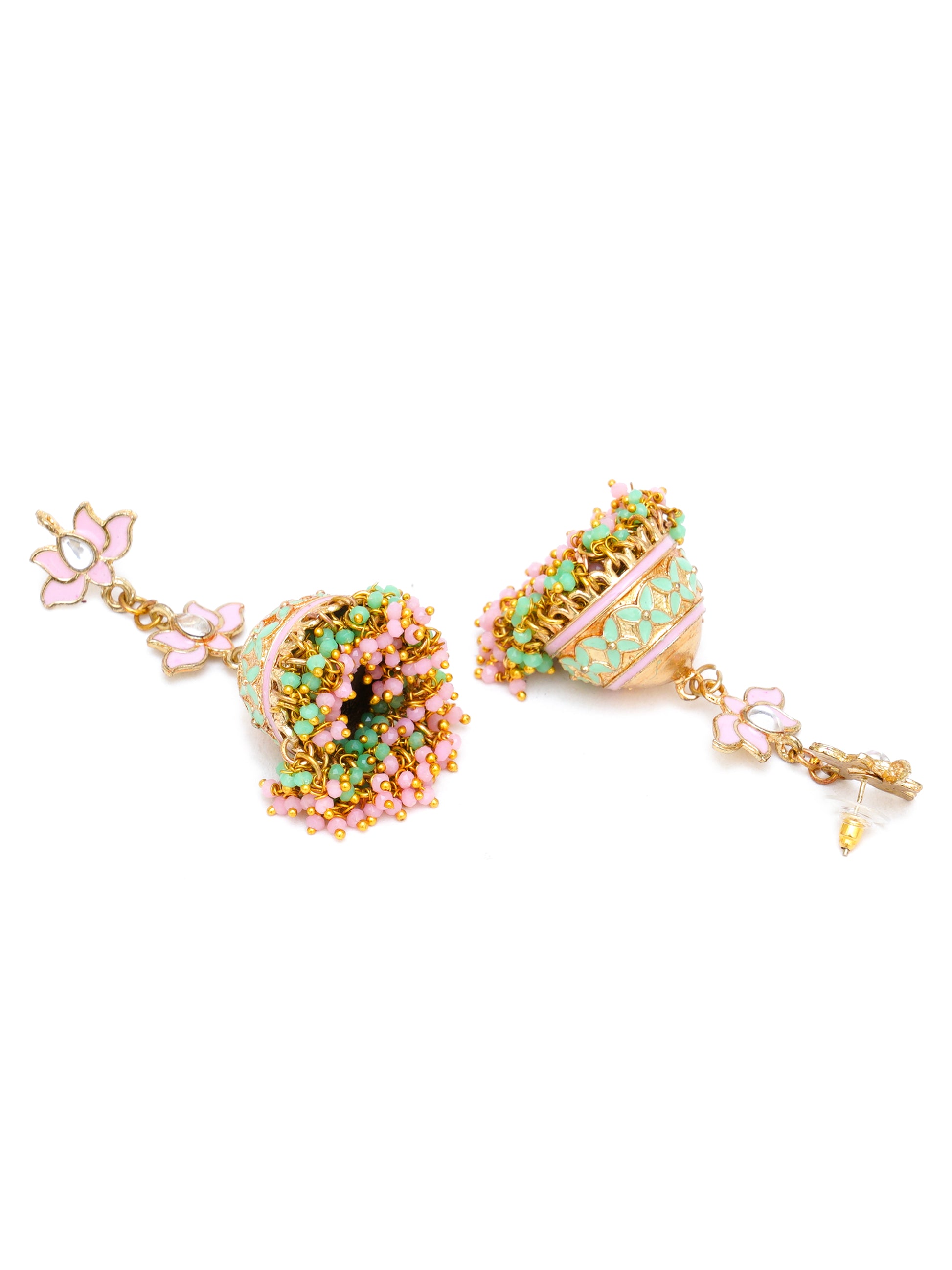 Karatcart Gold Plated Pink and Light Green Crystal Kundan Jhumki Earrings for Women
