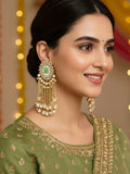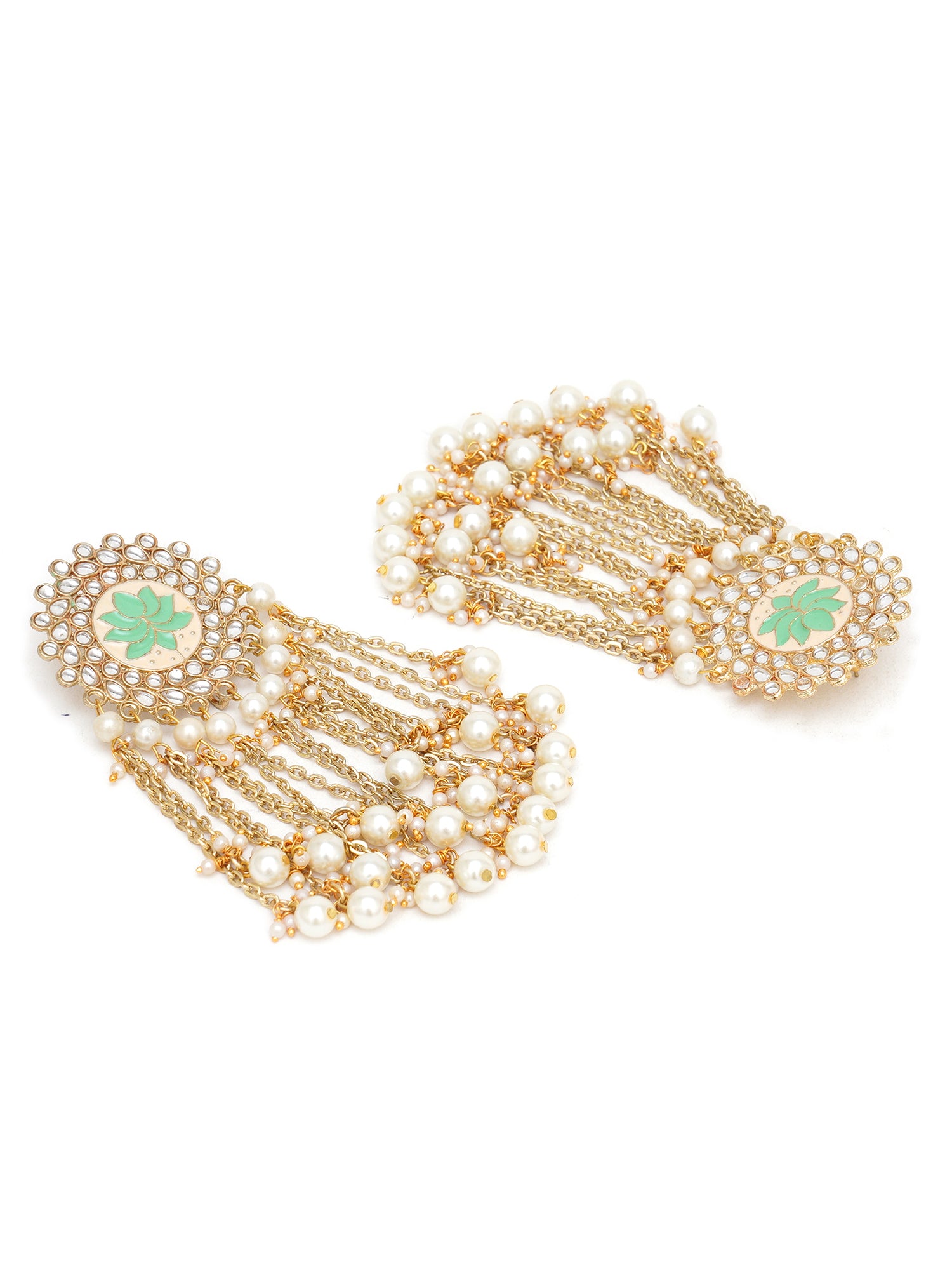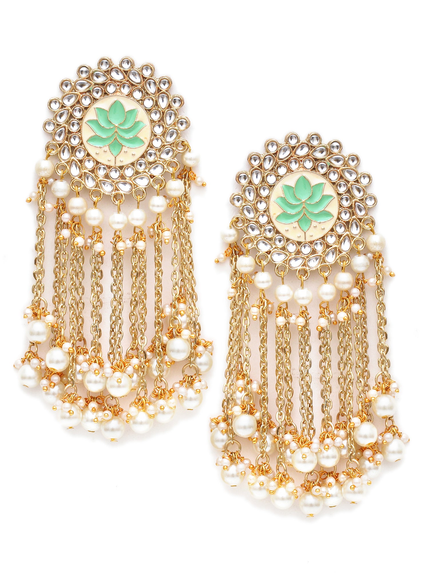 Karatcart Gold Plated Light Green Meena Pearl Beads Kundan Tassel Earrings for Women