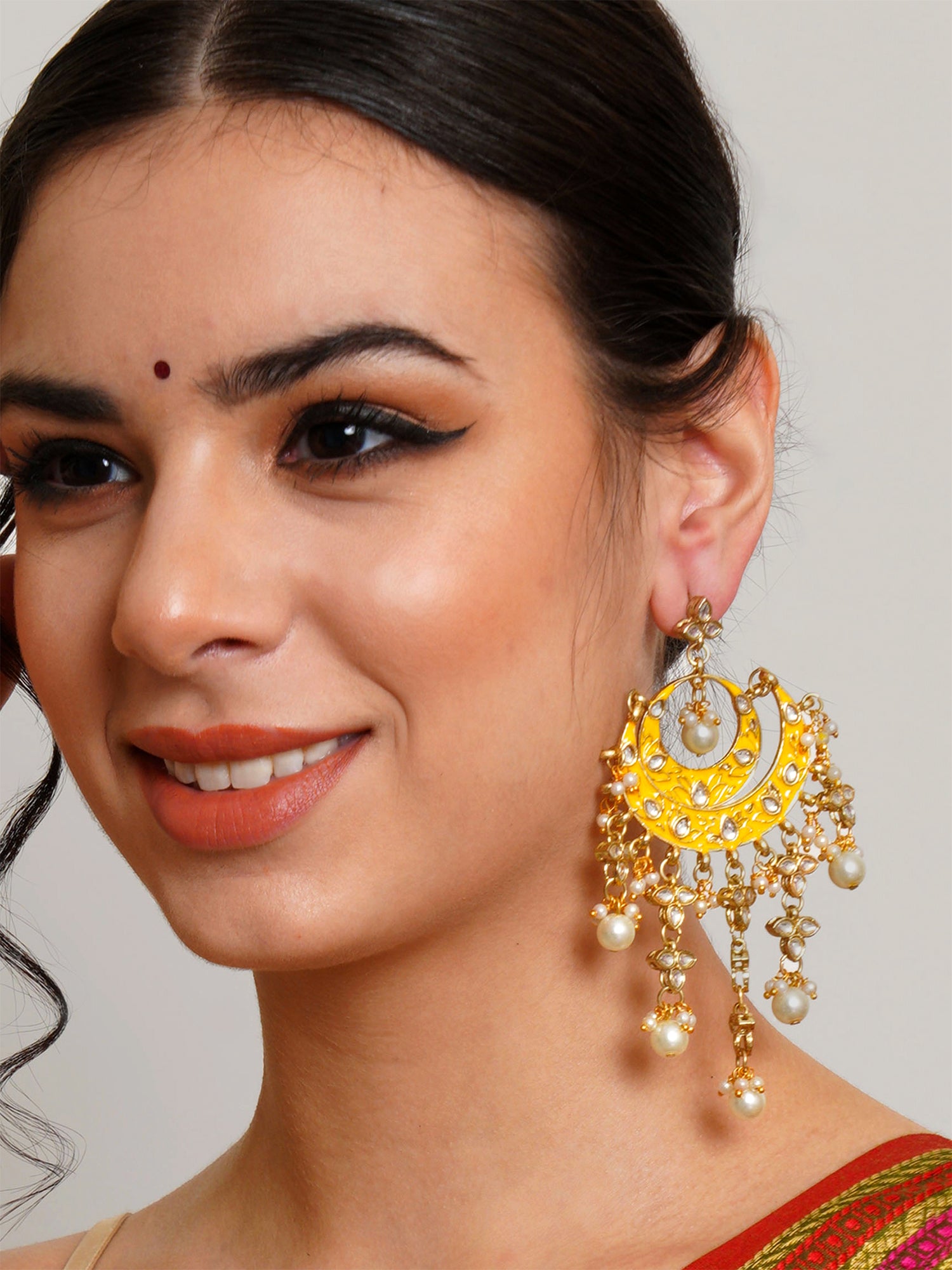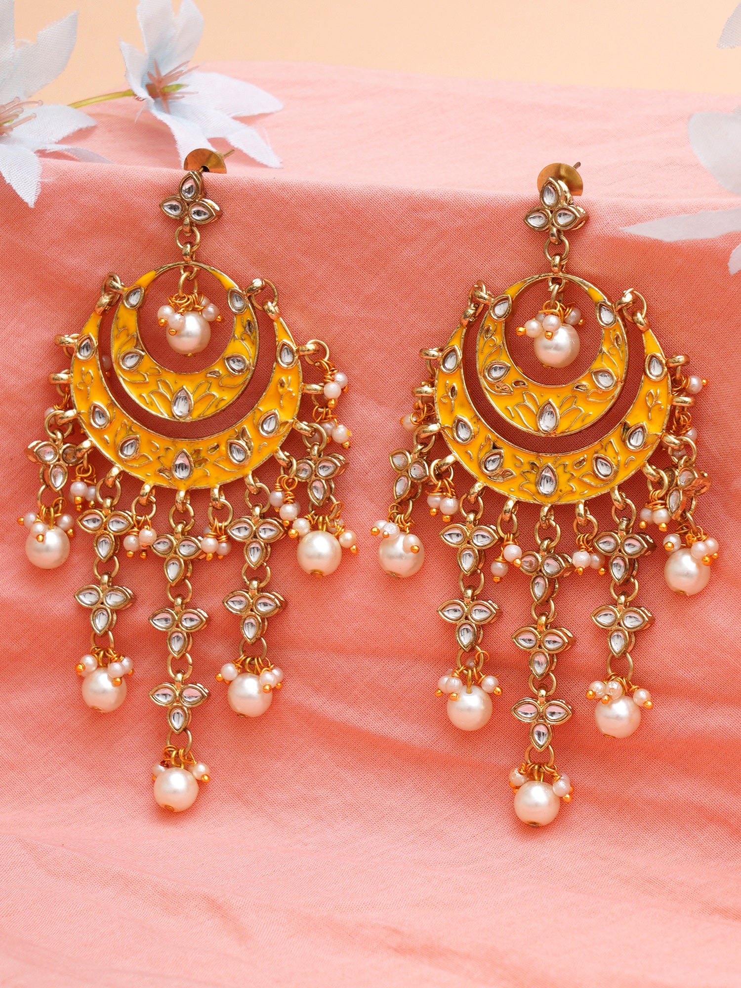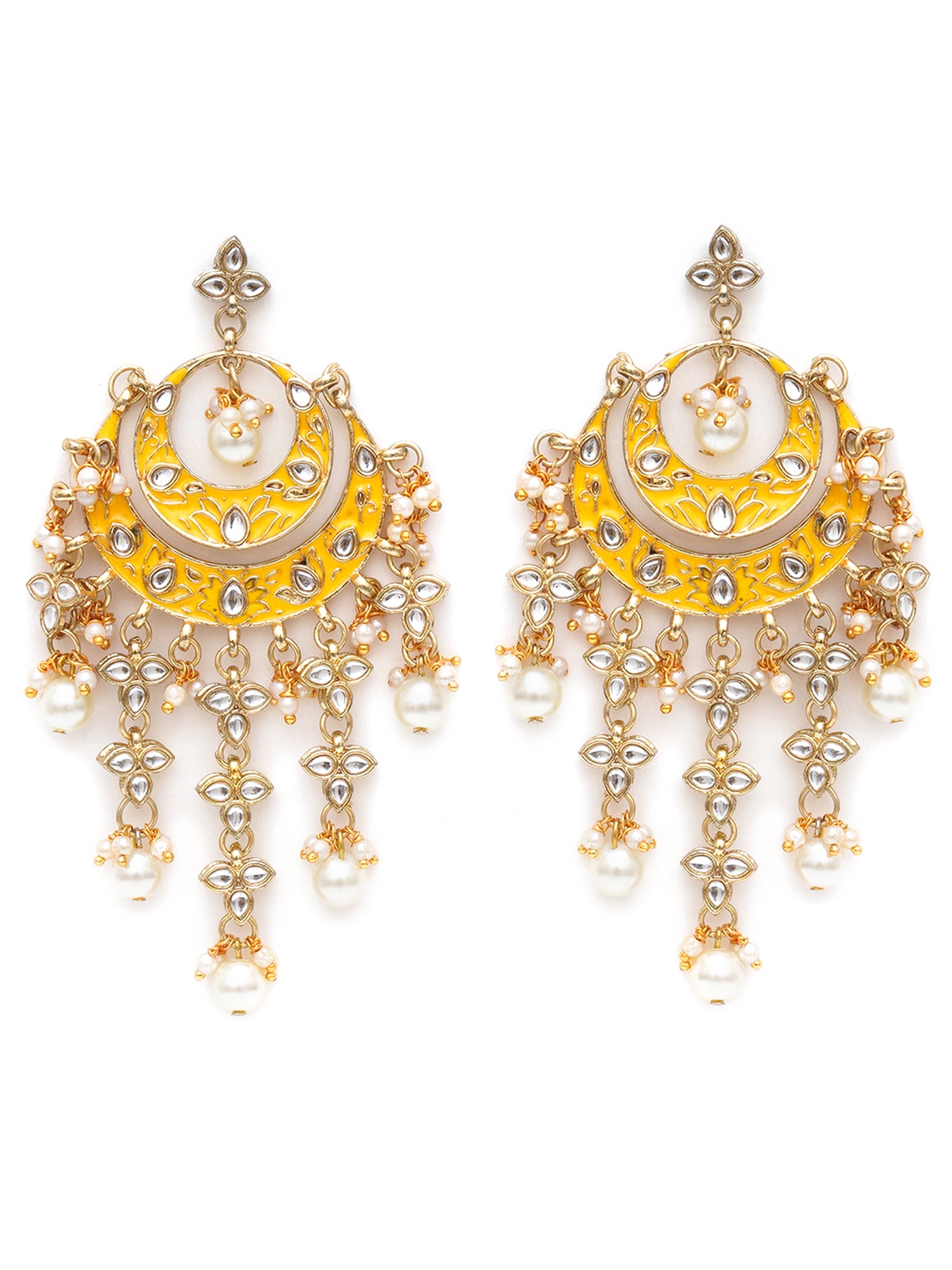 - This is a Yellow Earrings by Brand Karatcart which has Kundan stones.This is Gold Plated. We at KARATCART understand your desire to look the best on any day & we thrive in making any day an occasion. Every individual at Karatcart carries a passion for jewellery and it reflects in our beautiful designs as well as in our breathtaking craftsmanship. We create unique jewellery so you can make heads turn..