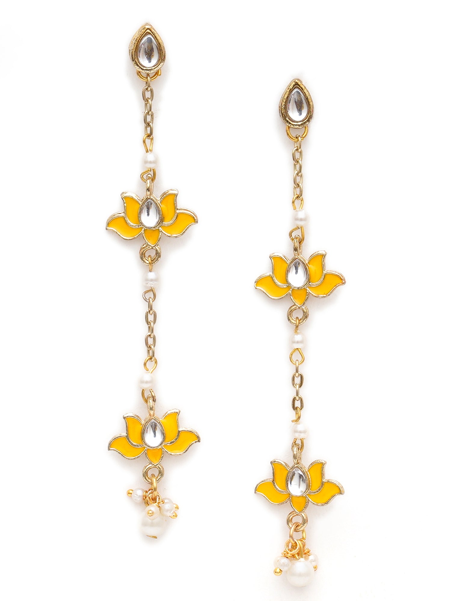 - Karatcart Gold Plated Lotus Shape Yellow Kundan Drop Earrings for Women. Our products are designed with high-quality Kundan Stones and these products are enhanced with plating that are skin-friendly & with love to reach your heart.