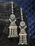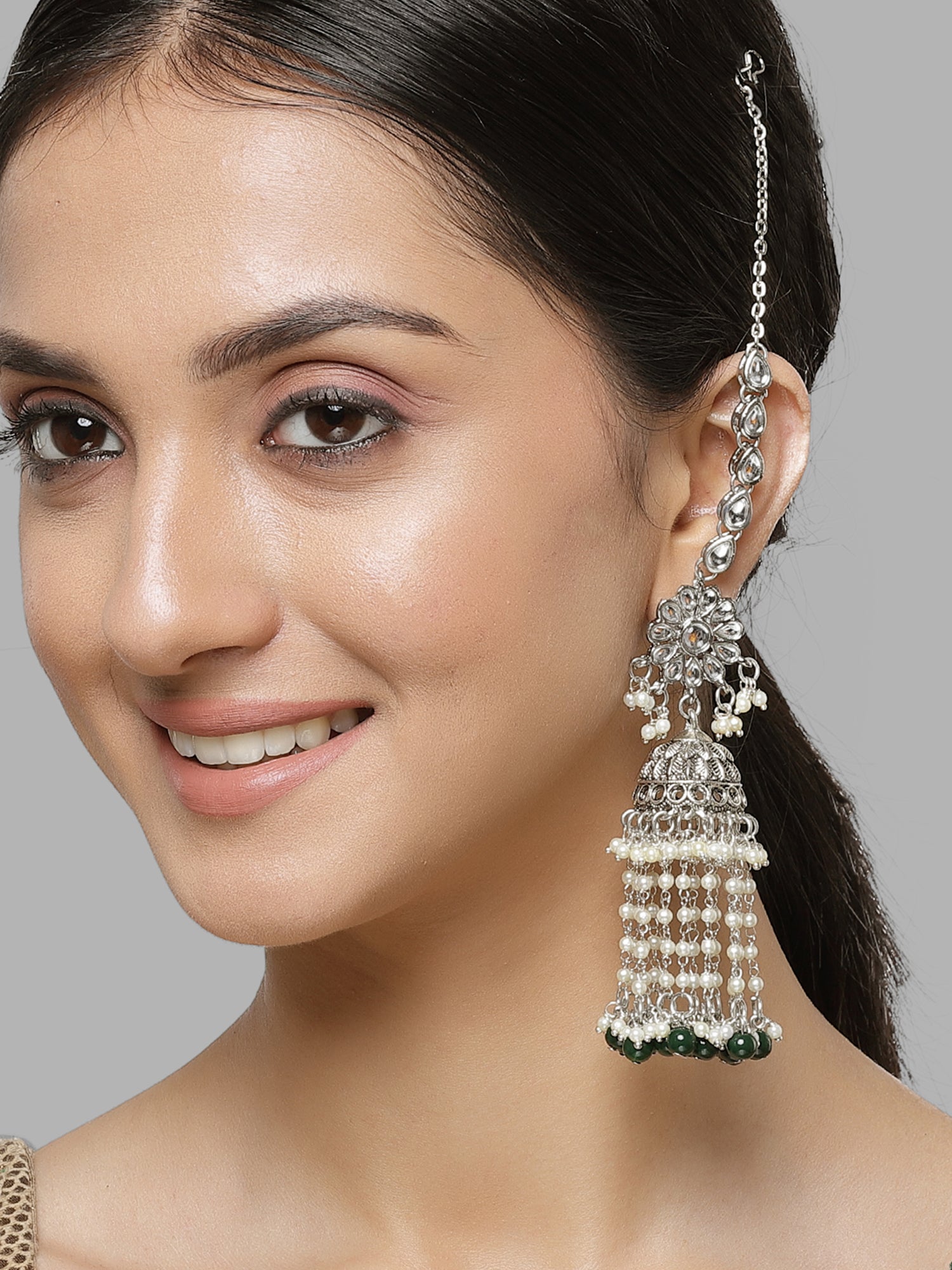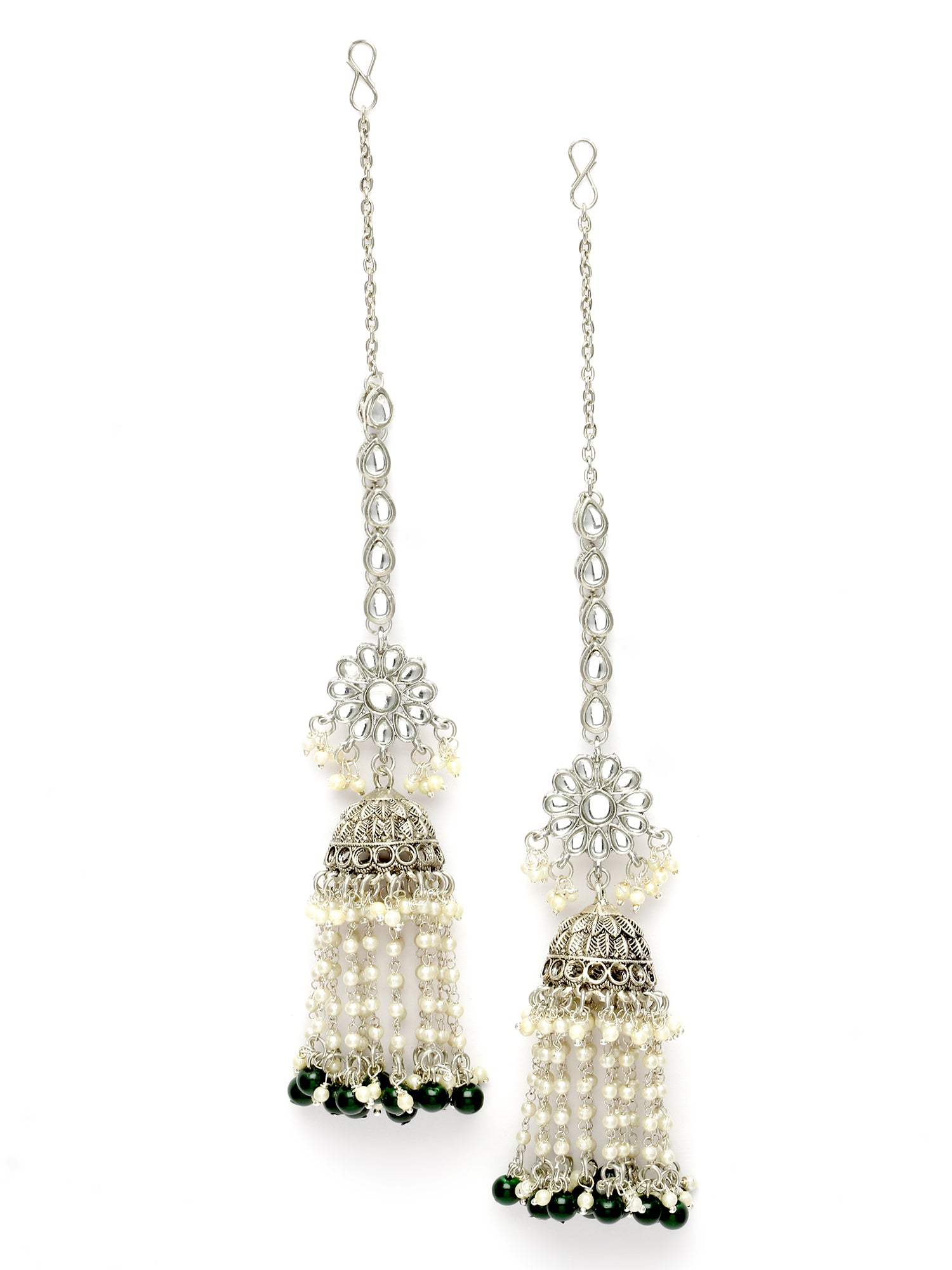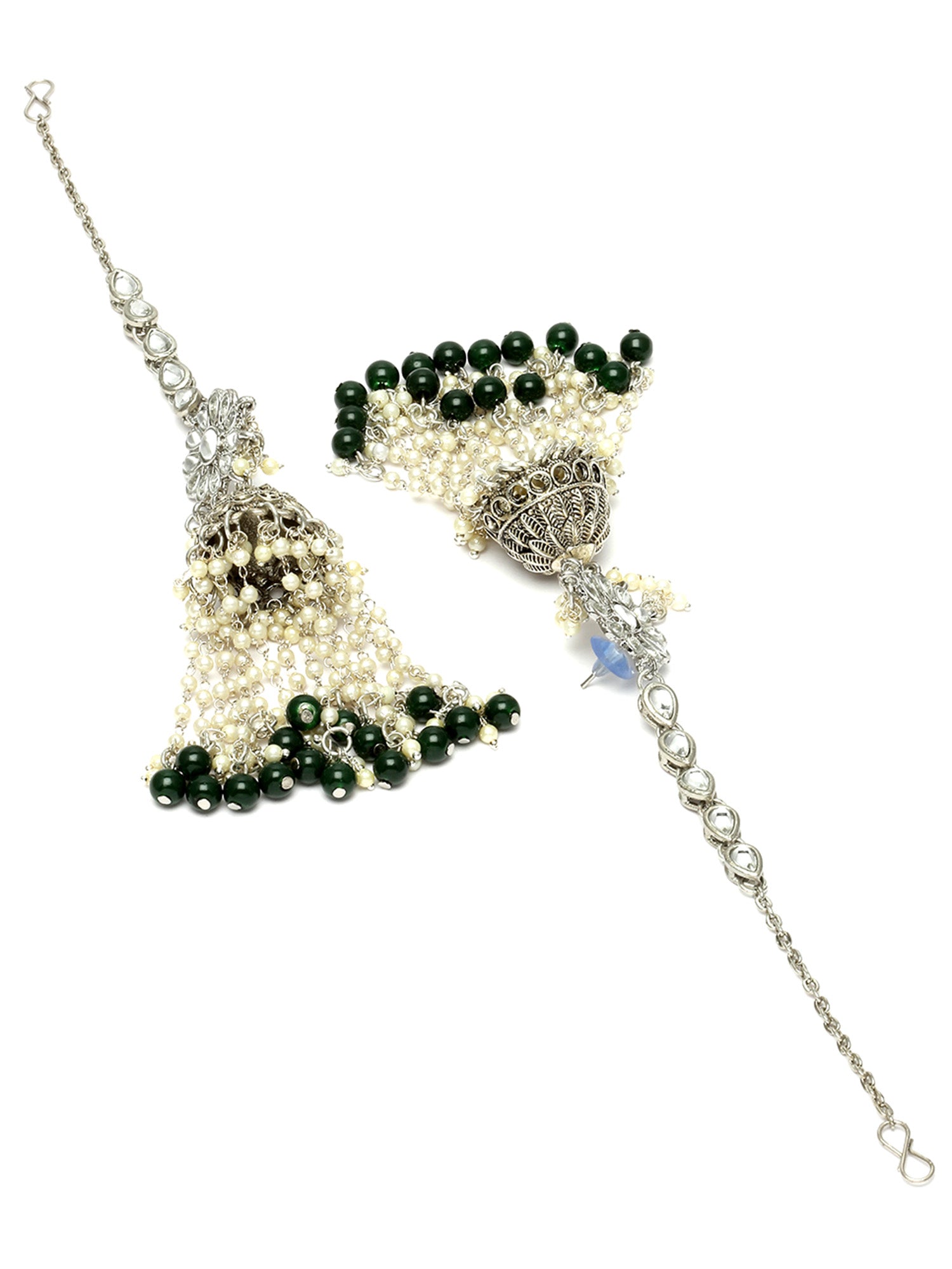 Karatcart Oxidised Silver Green Beads Kundan Jhumki Kaanchain Earrings for Women
