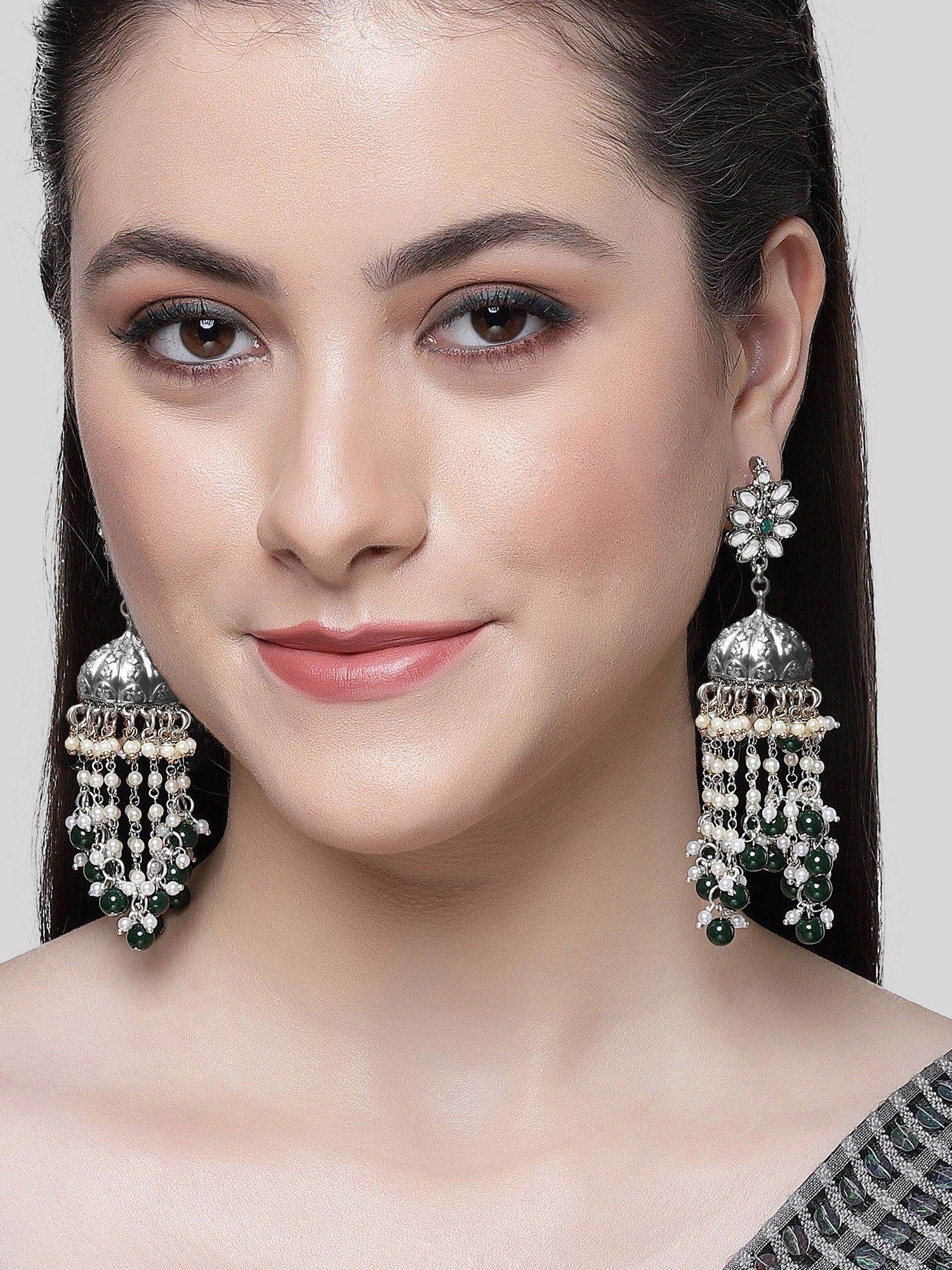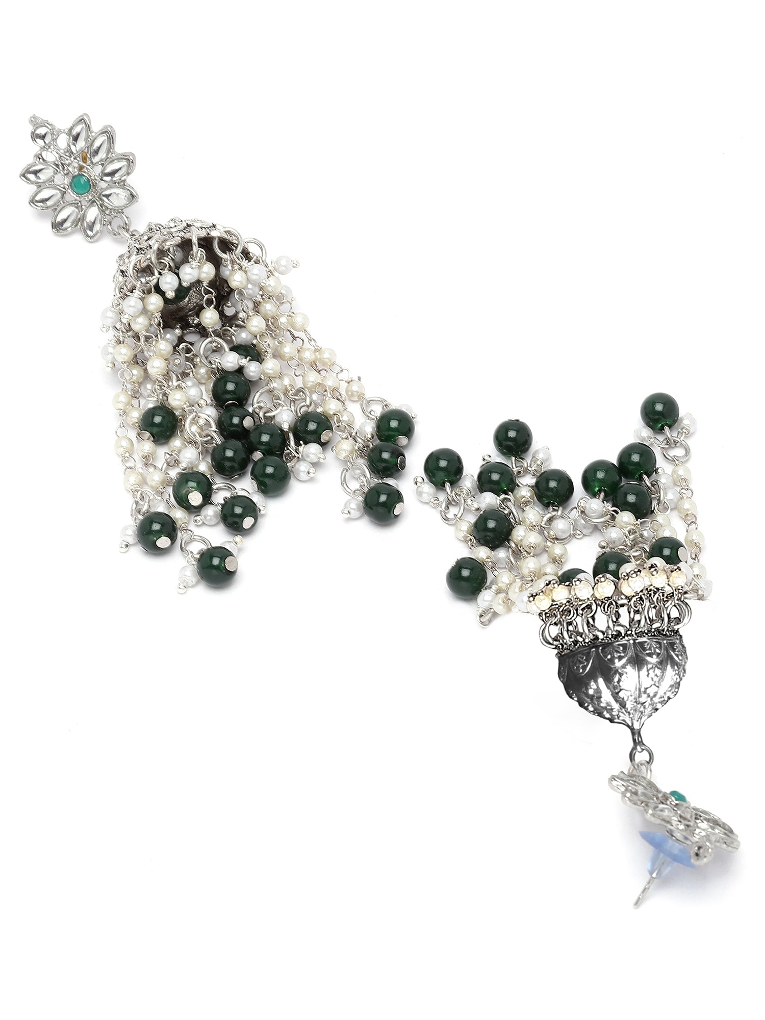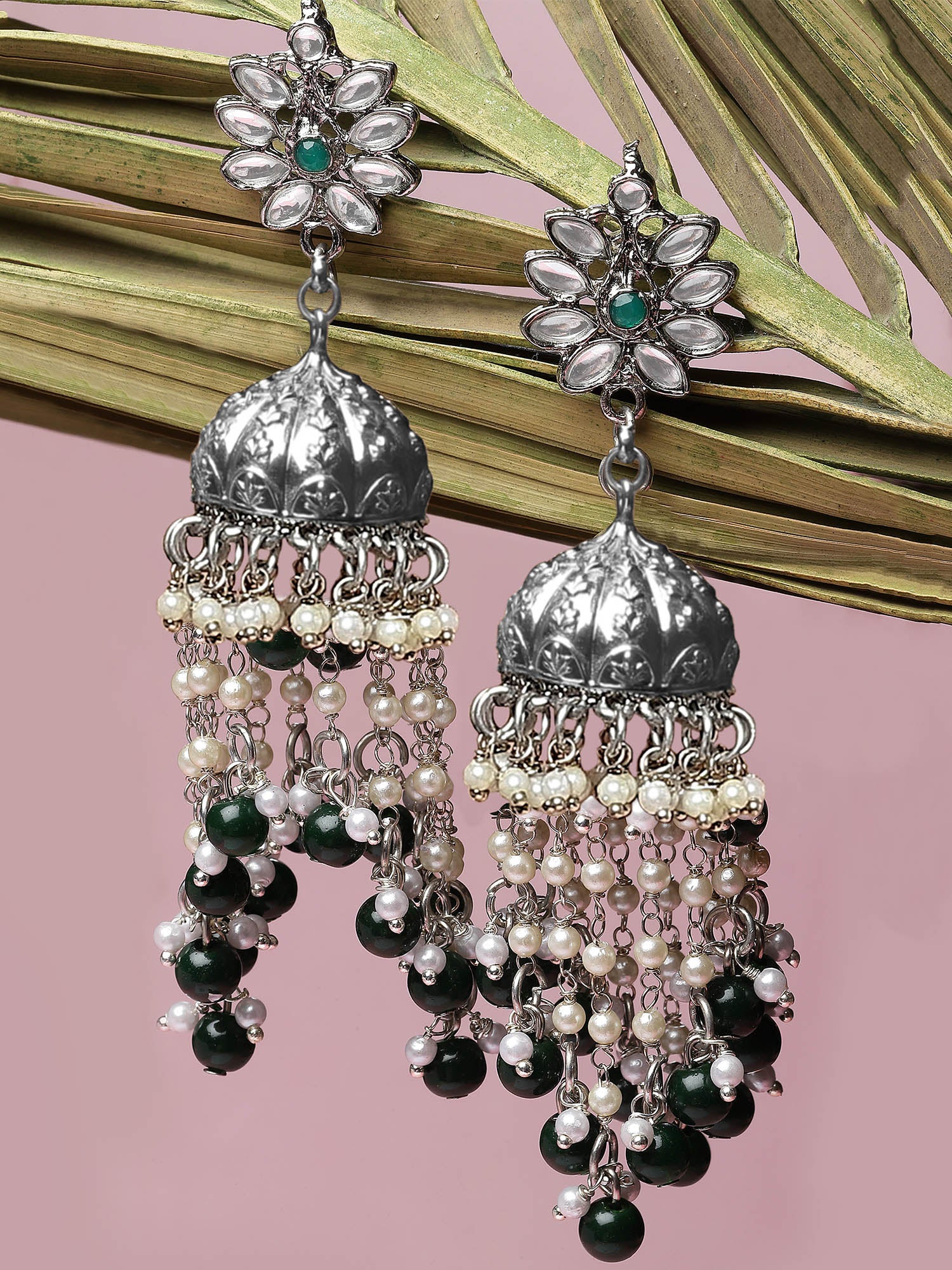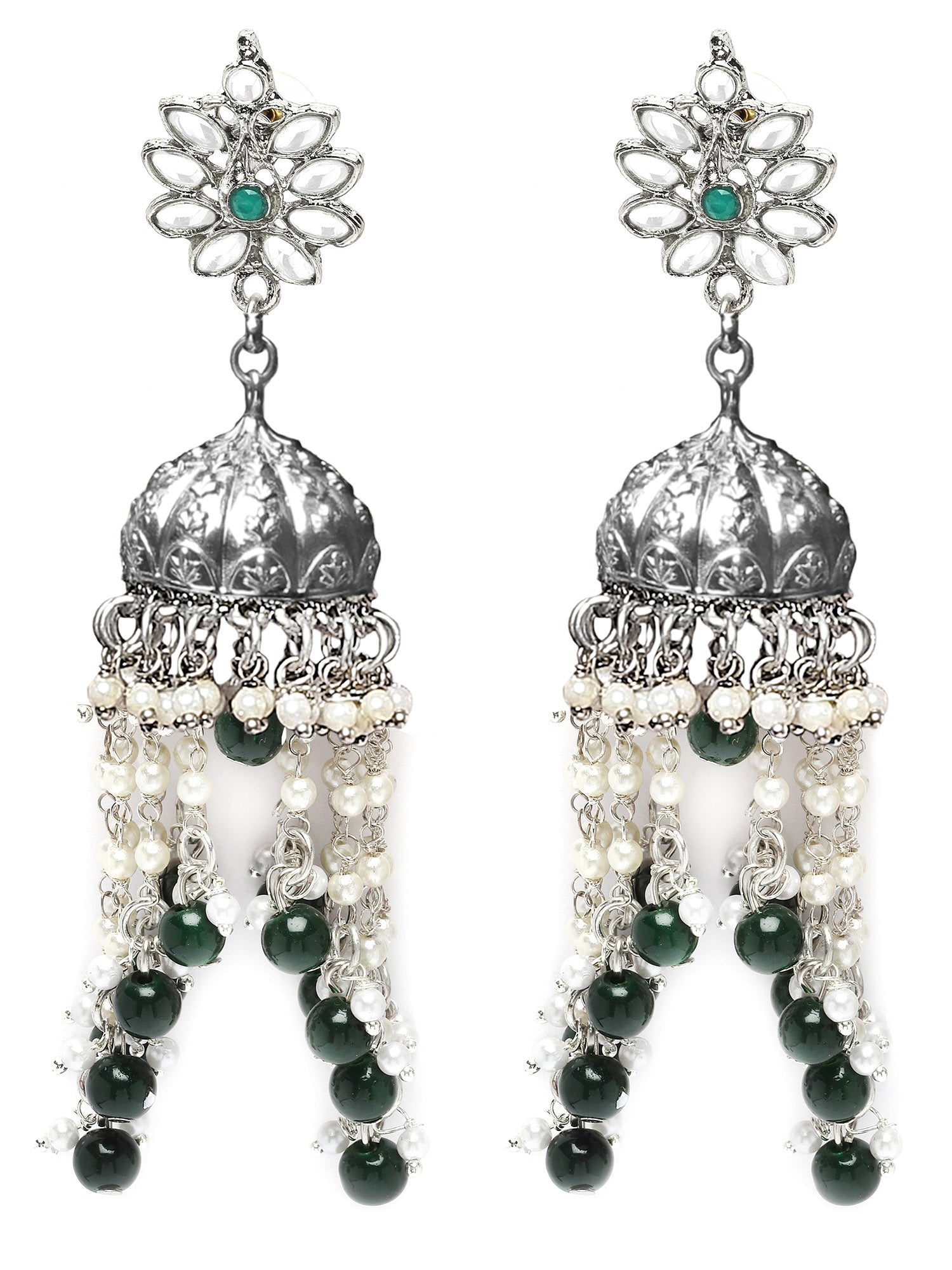 Karatcart Oxidised Silver Plated Green Beads and Kundan Studded Jhumki Earrings for Women