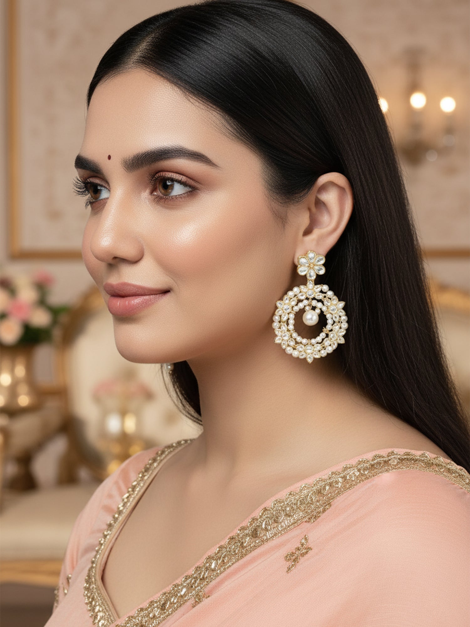 Karatcart Gold-Plated Pearl and Floral Kundan Studded Dangler Hoop Earring for Women