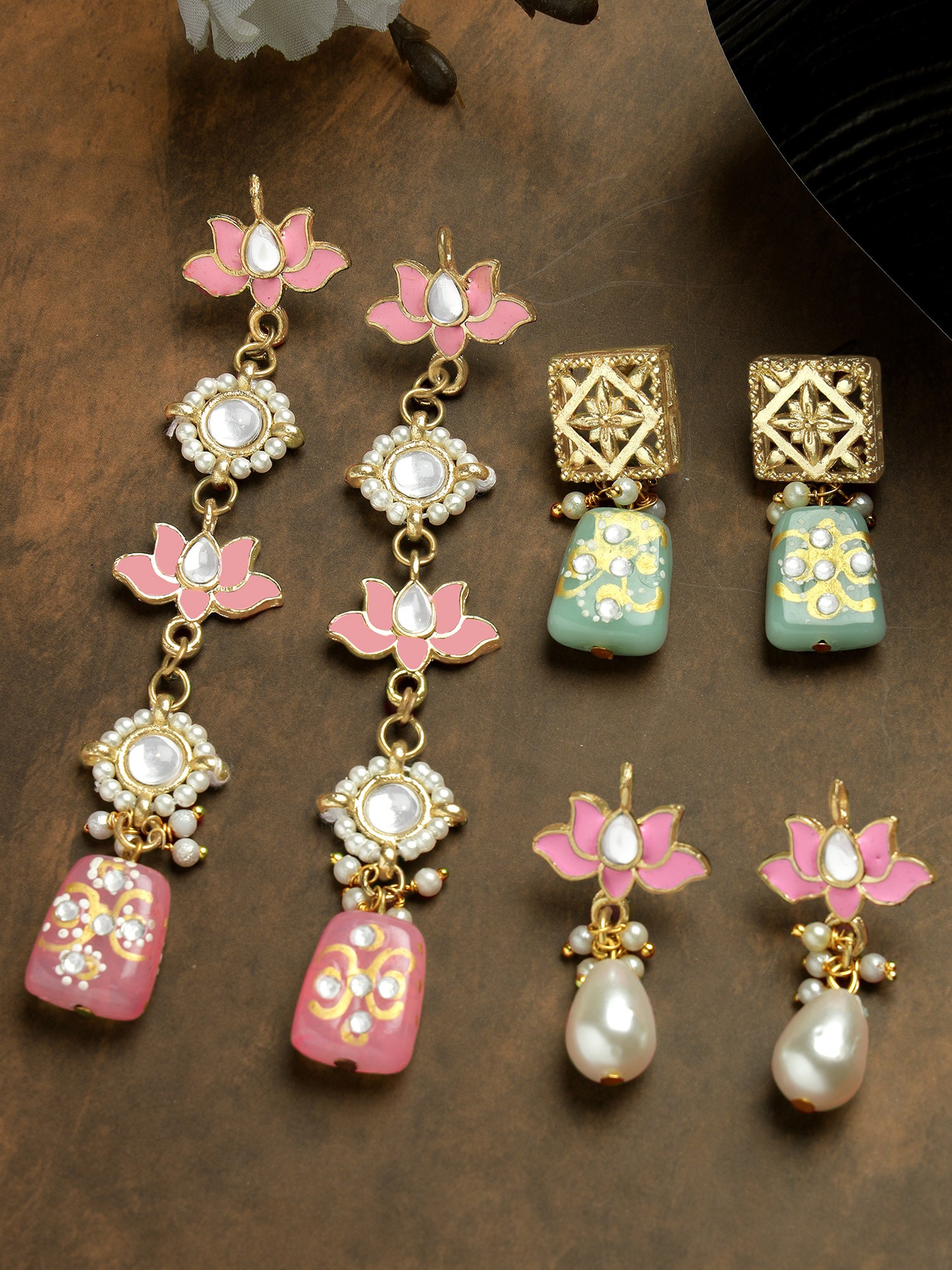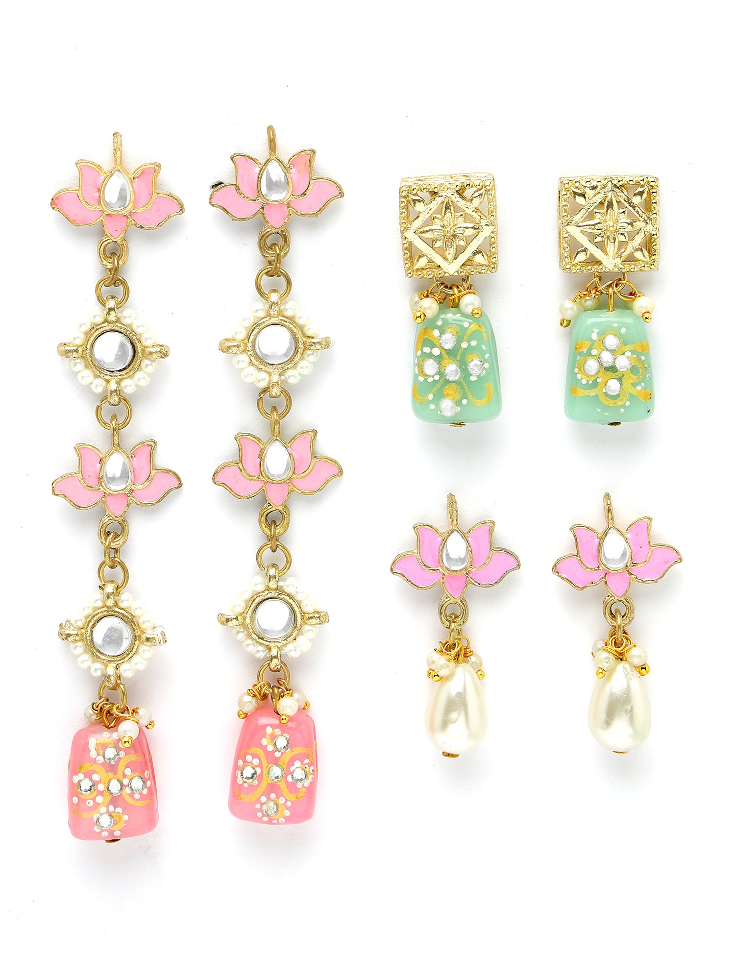 Karatcart Set of 3 Gold Plated Pink Meena Lotus Design Kundan Drop Earrings for Women