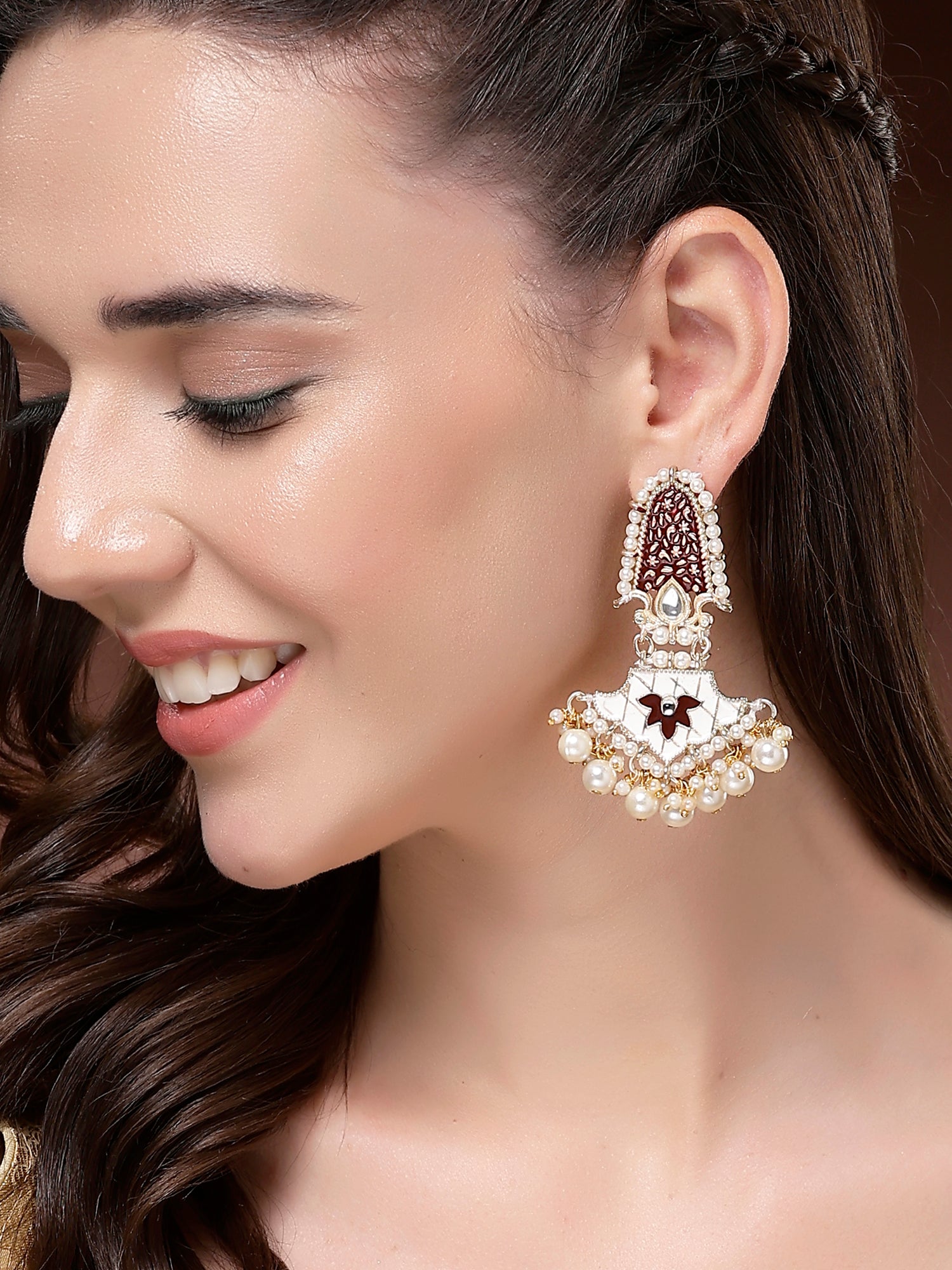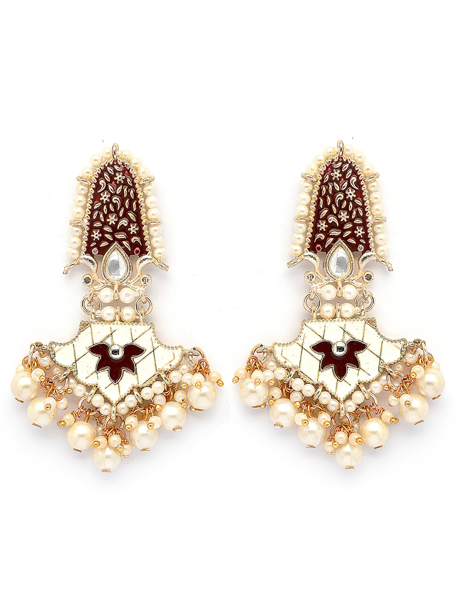 Karatcart Designer Gold Plated Maroon Meenakari Floral Kundan Dangler Earrings with Pearls
