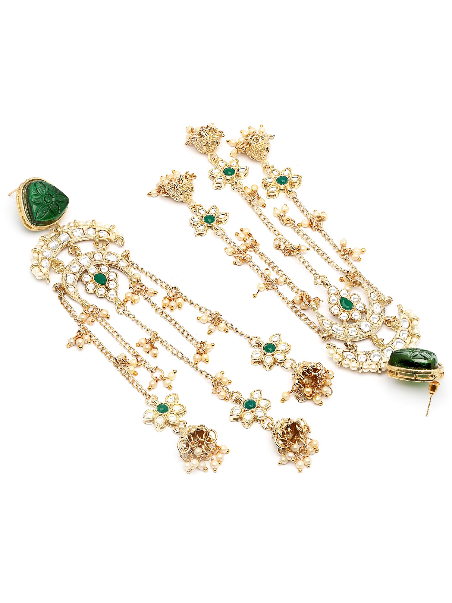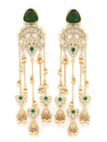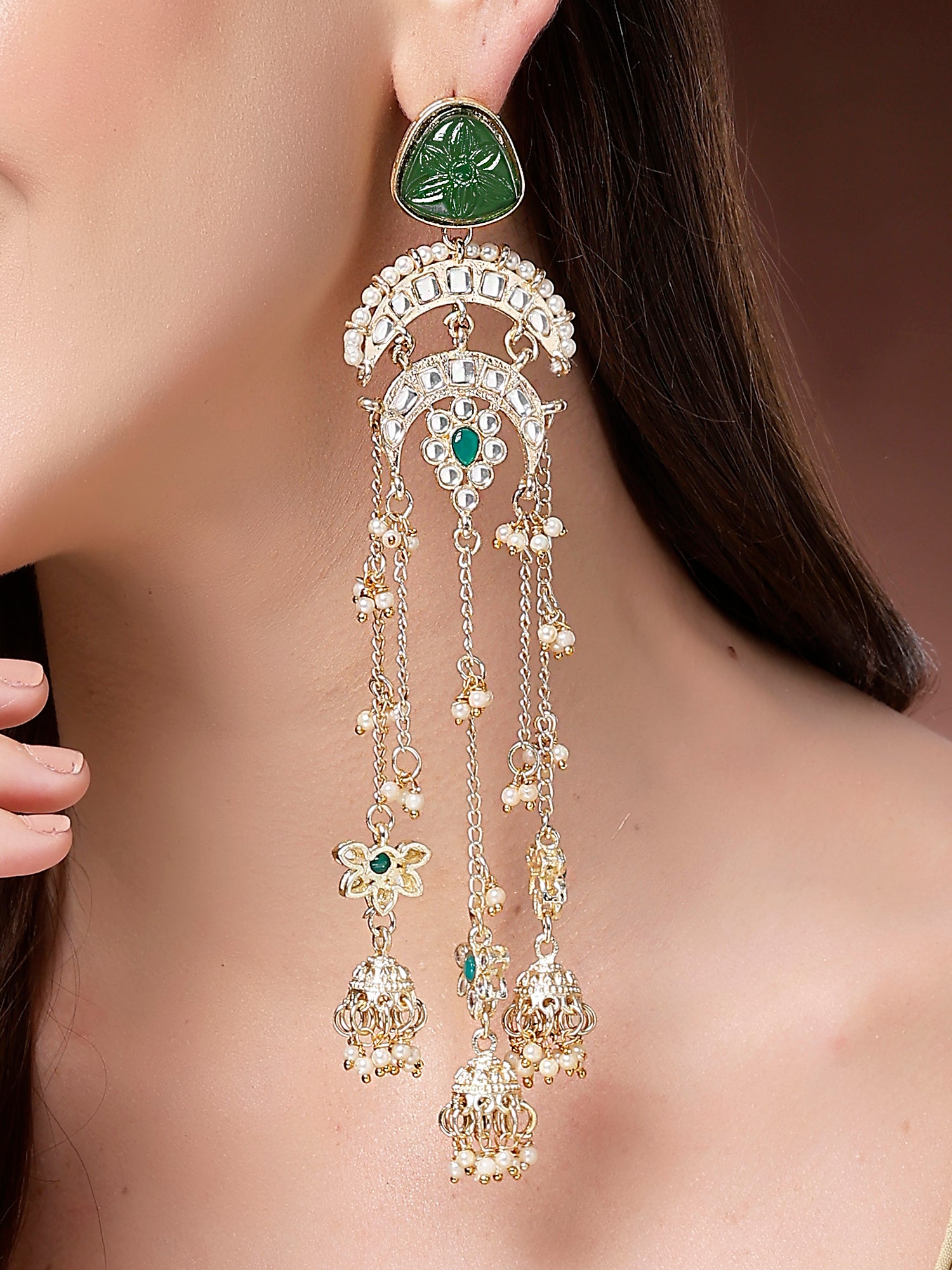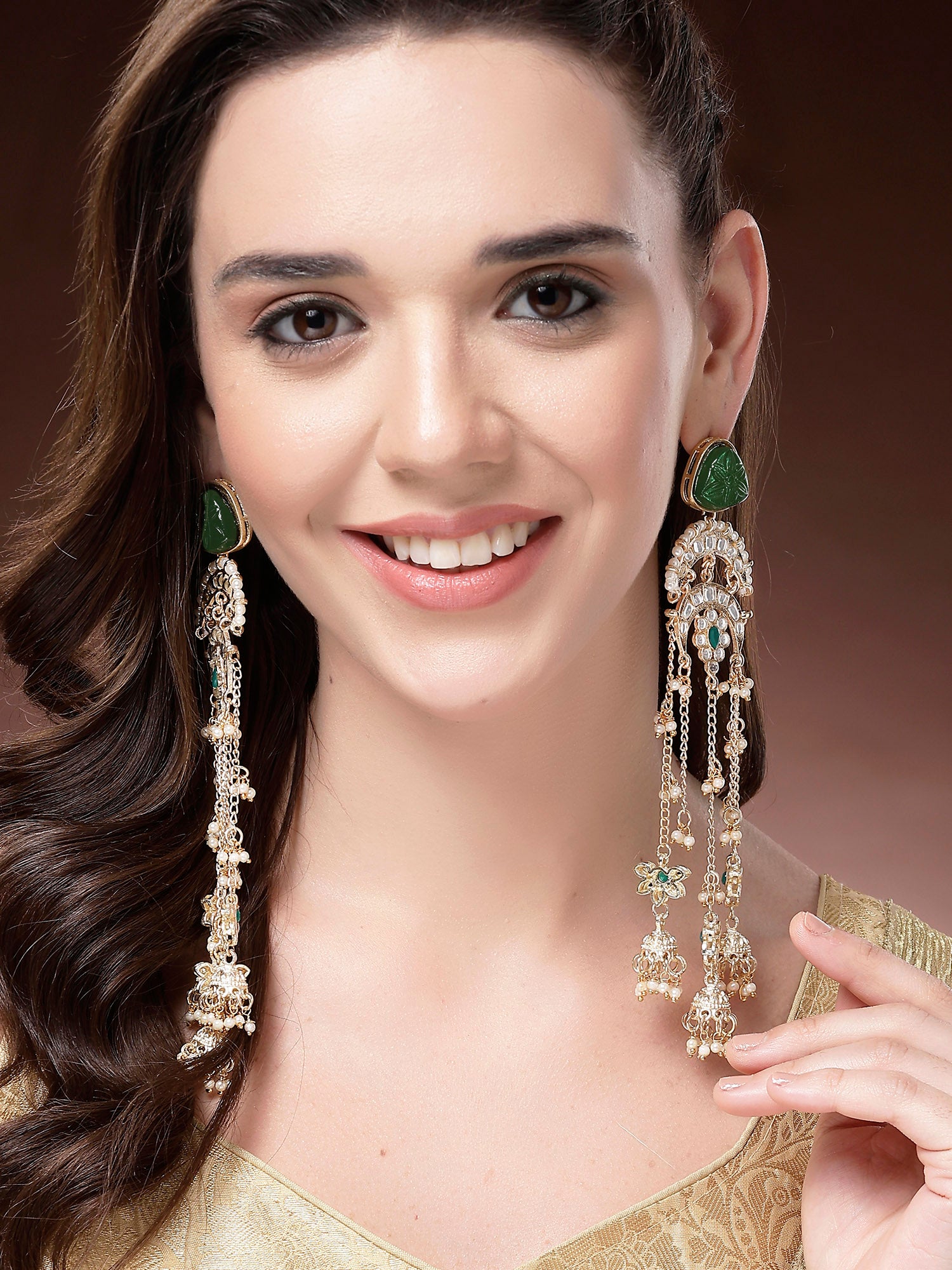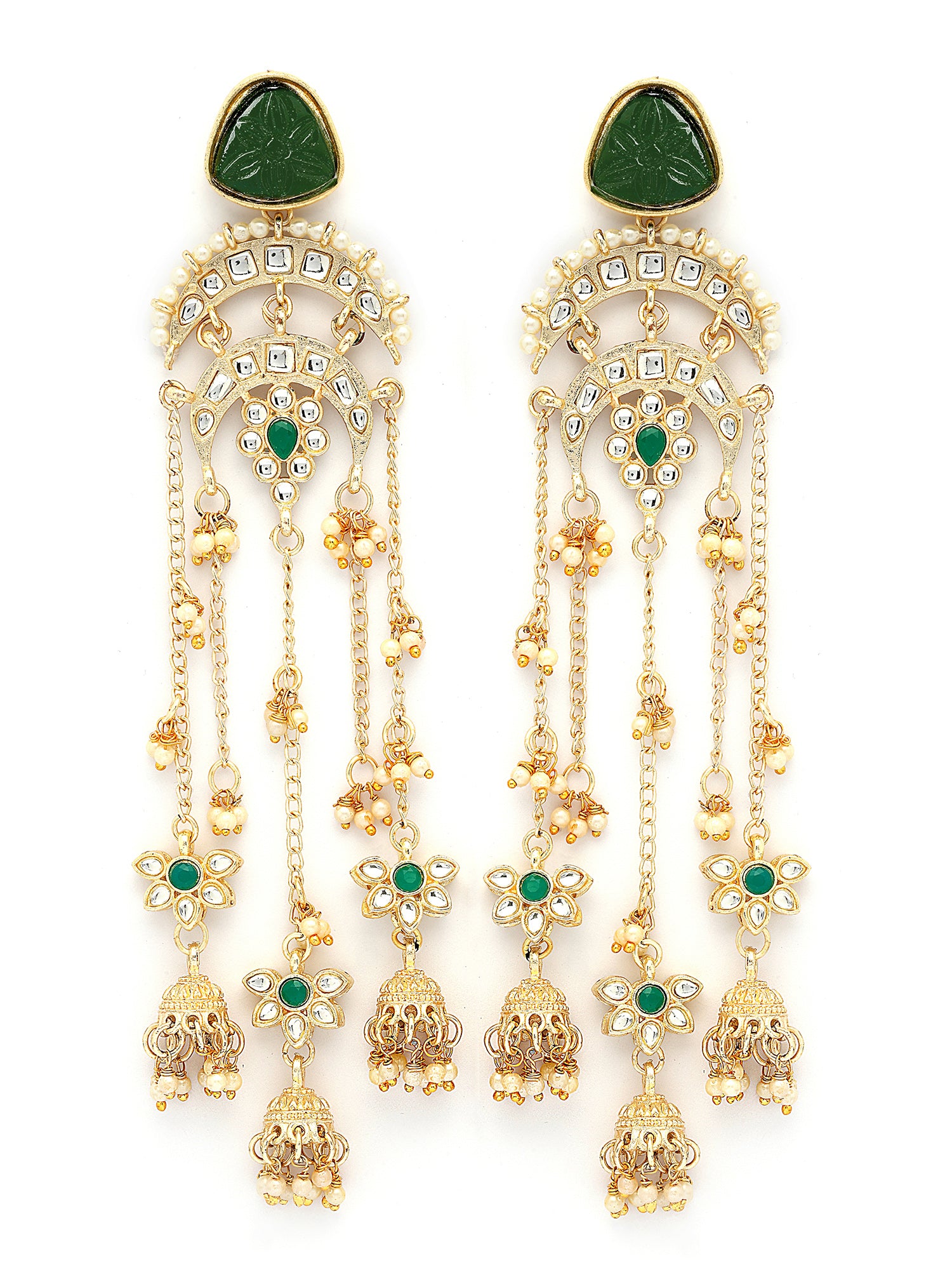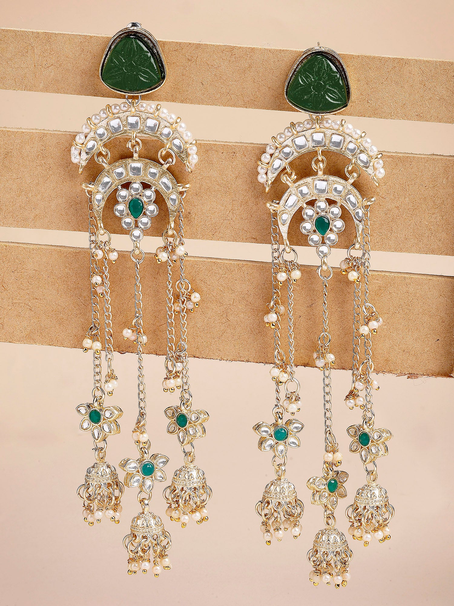 Karatcart Ethnic Gold Plated Green Carved Stone Long Dangler Earrings with Jhumkis
