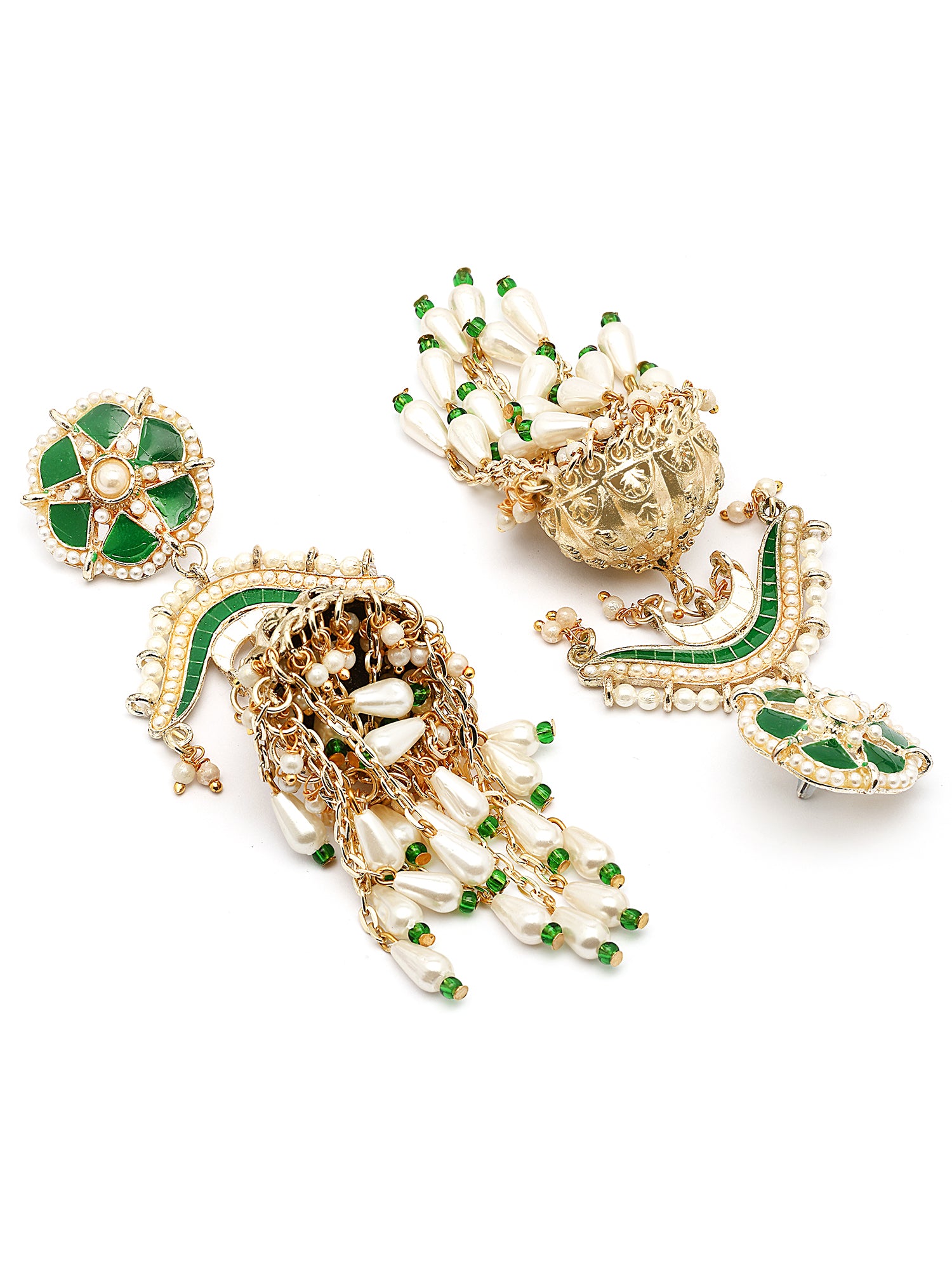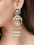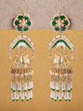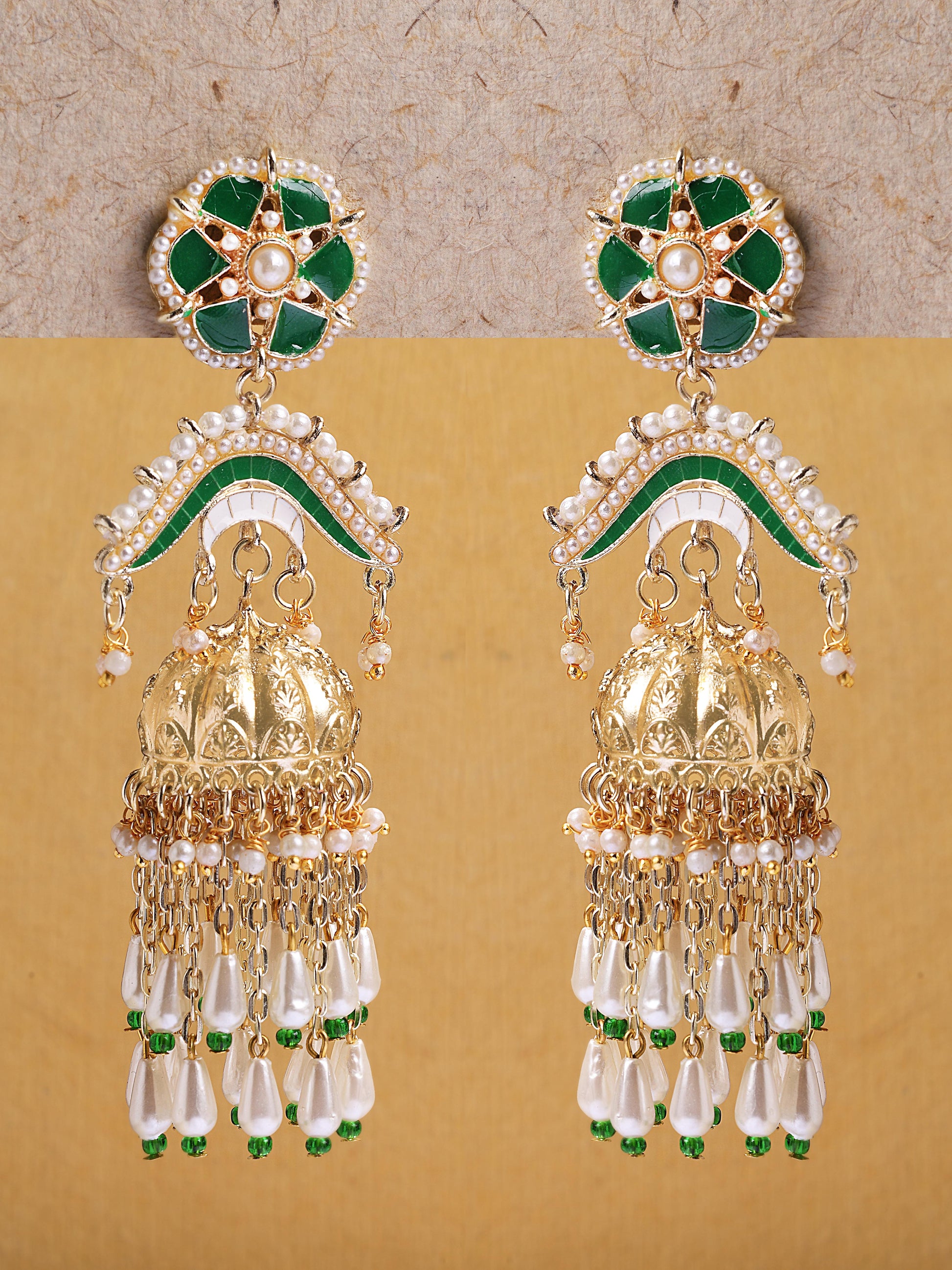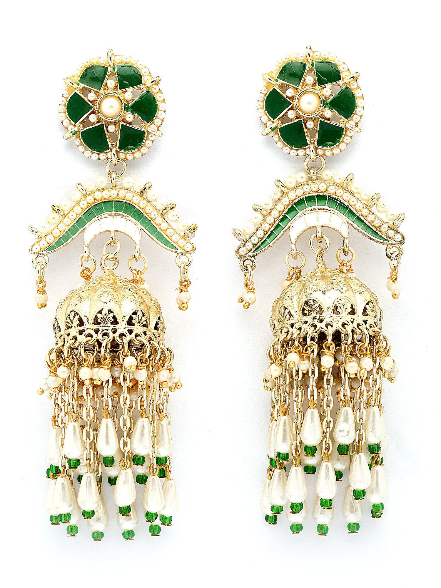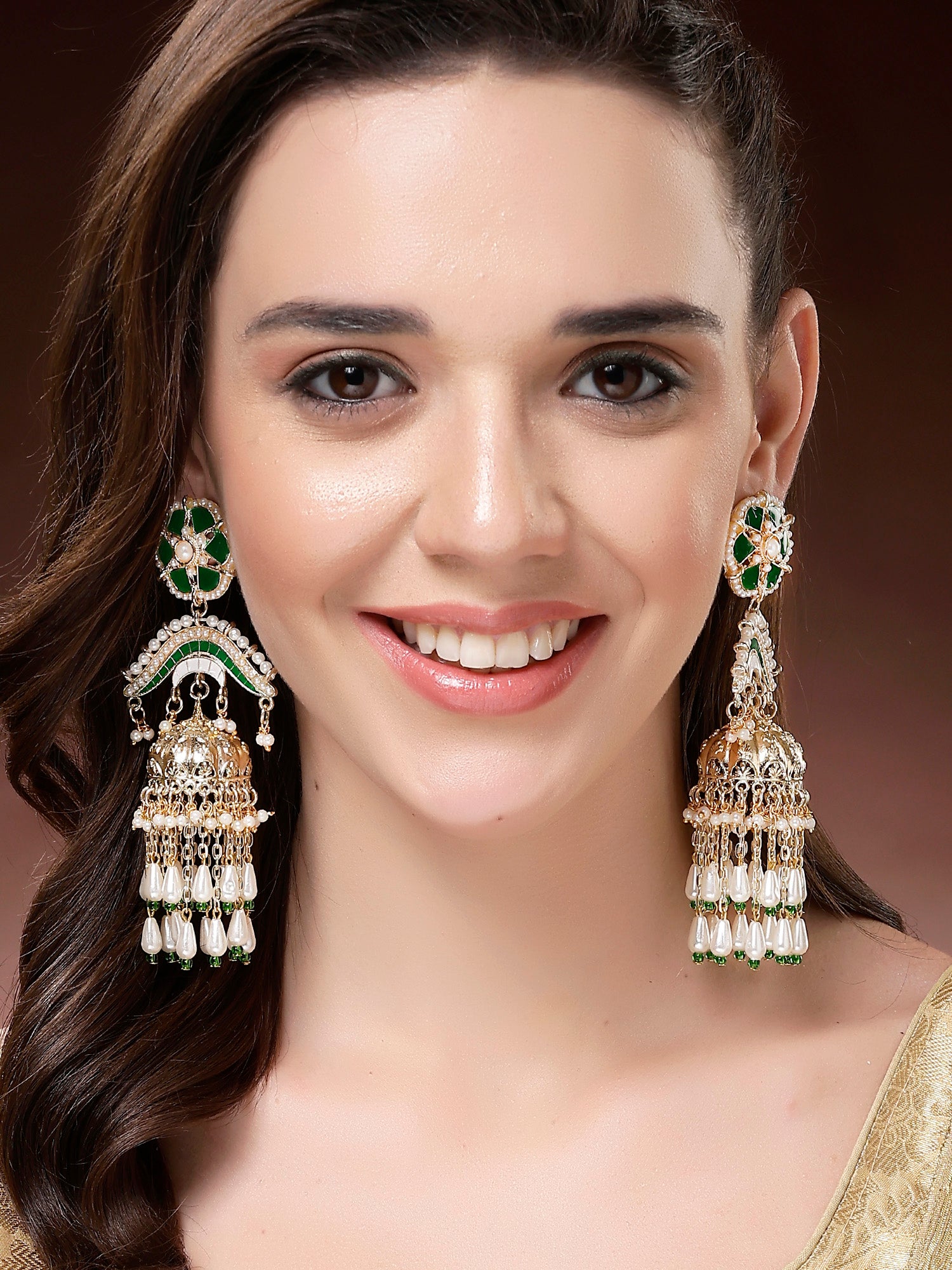 Karatcart Traditional Gold-Plated Green Enamel Kundan Dome Jhumka Earrings with Drop Pearls
