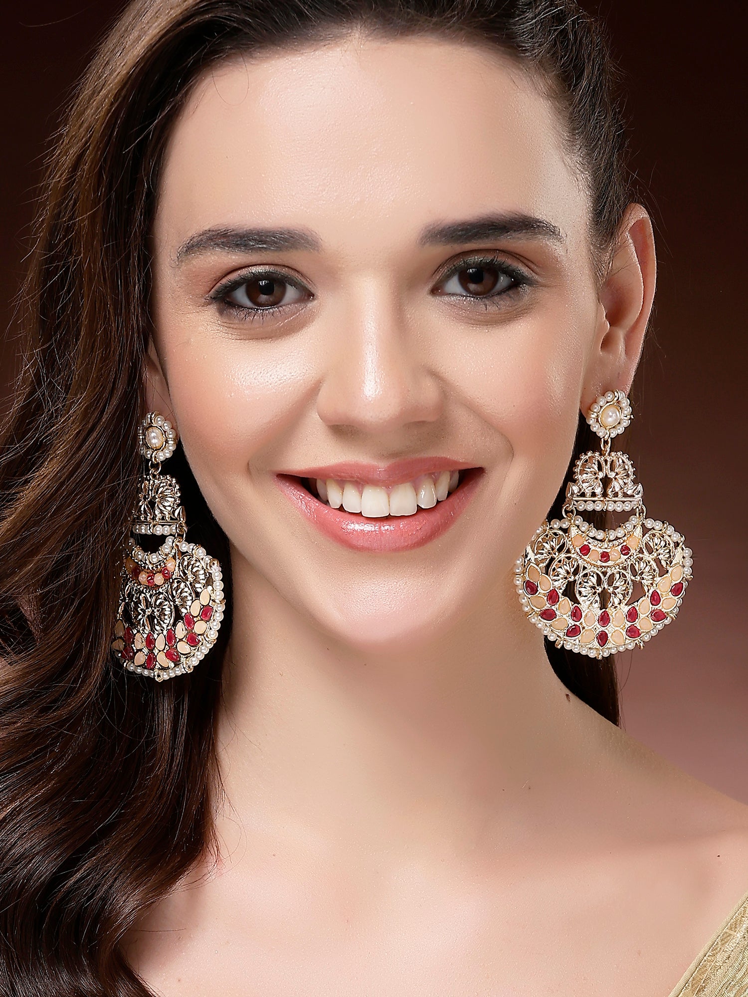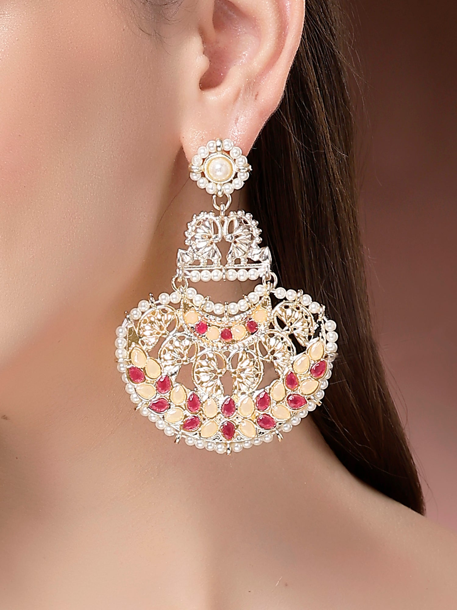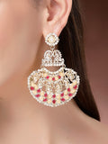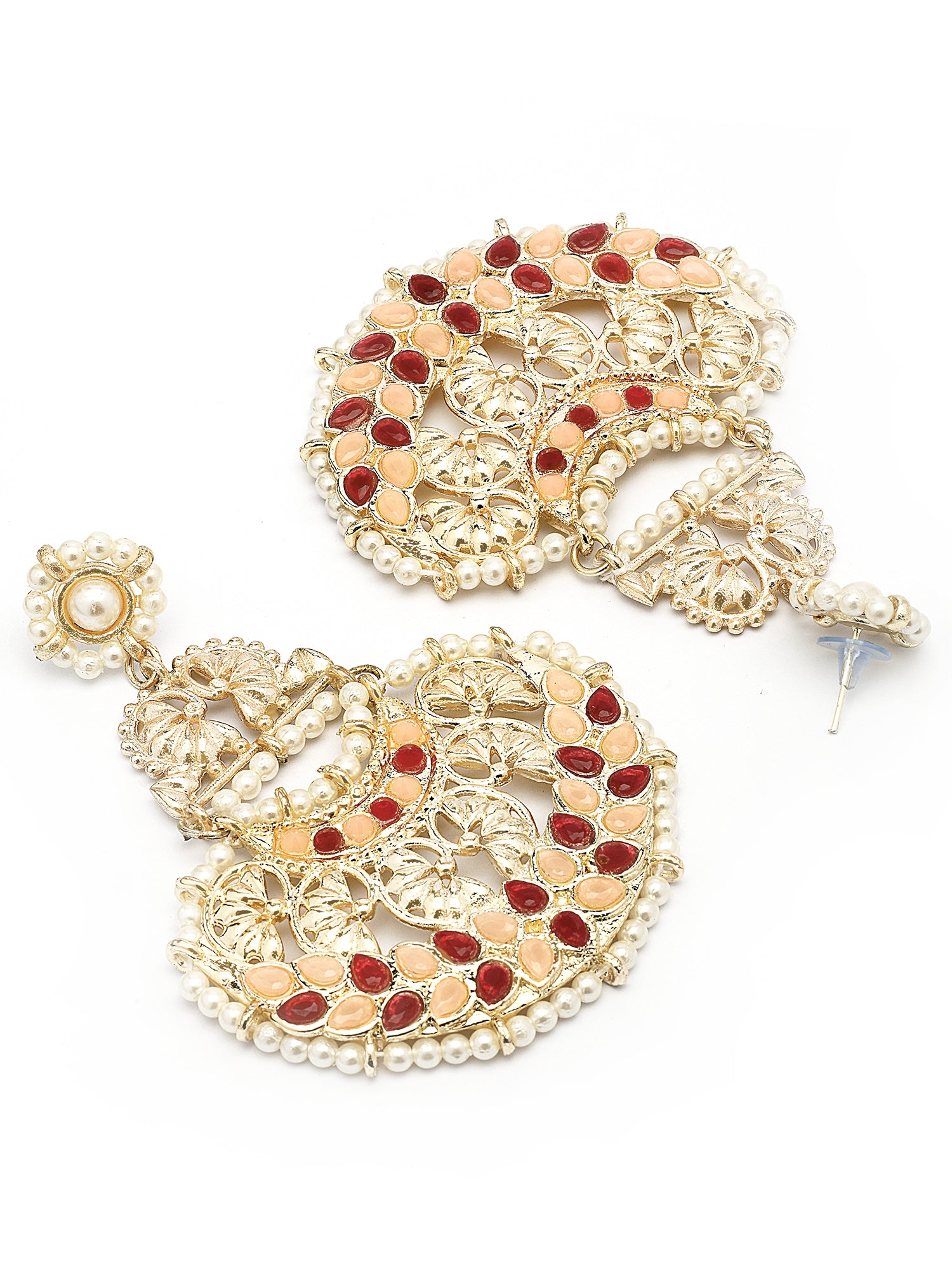 Karatcart Traditional Gold-Plated Red and Peach Kundan Dangler Earrings for Women