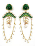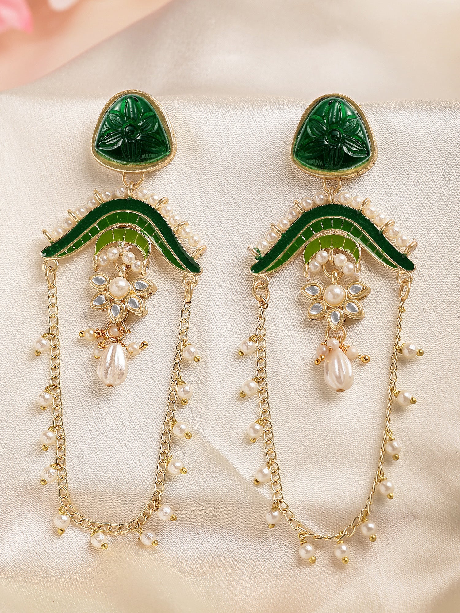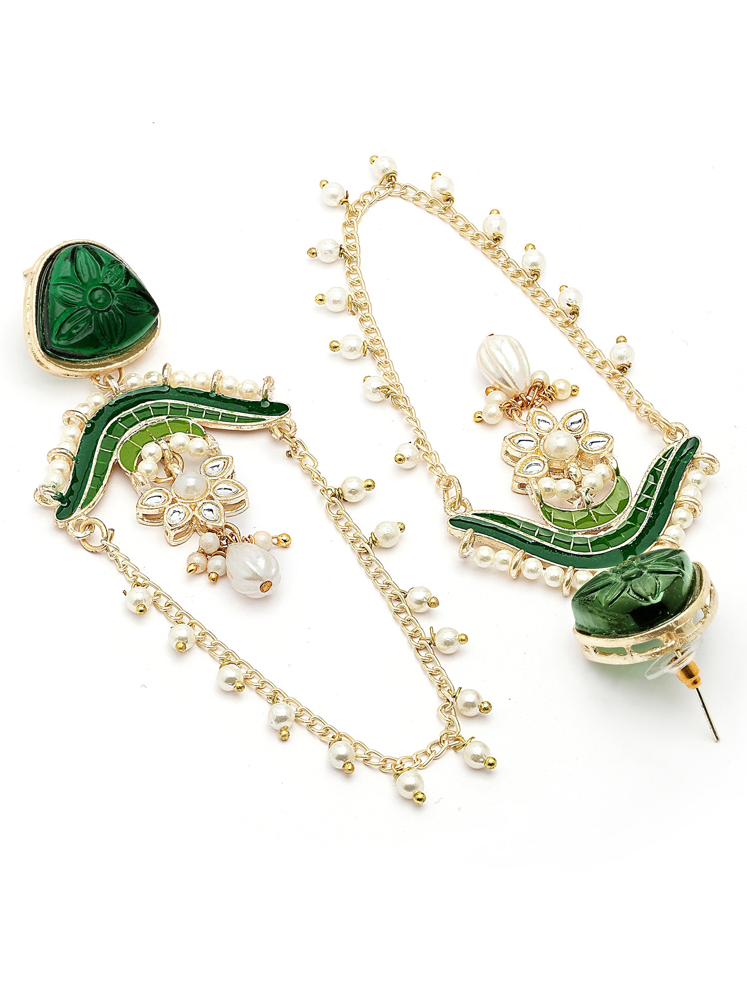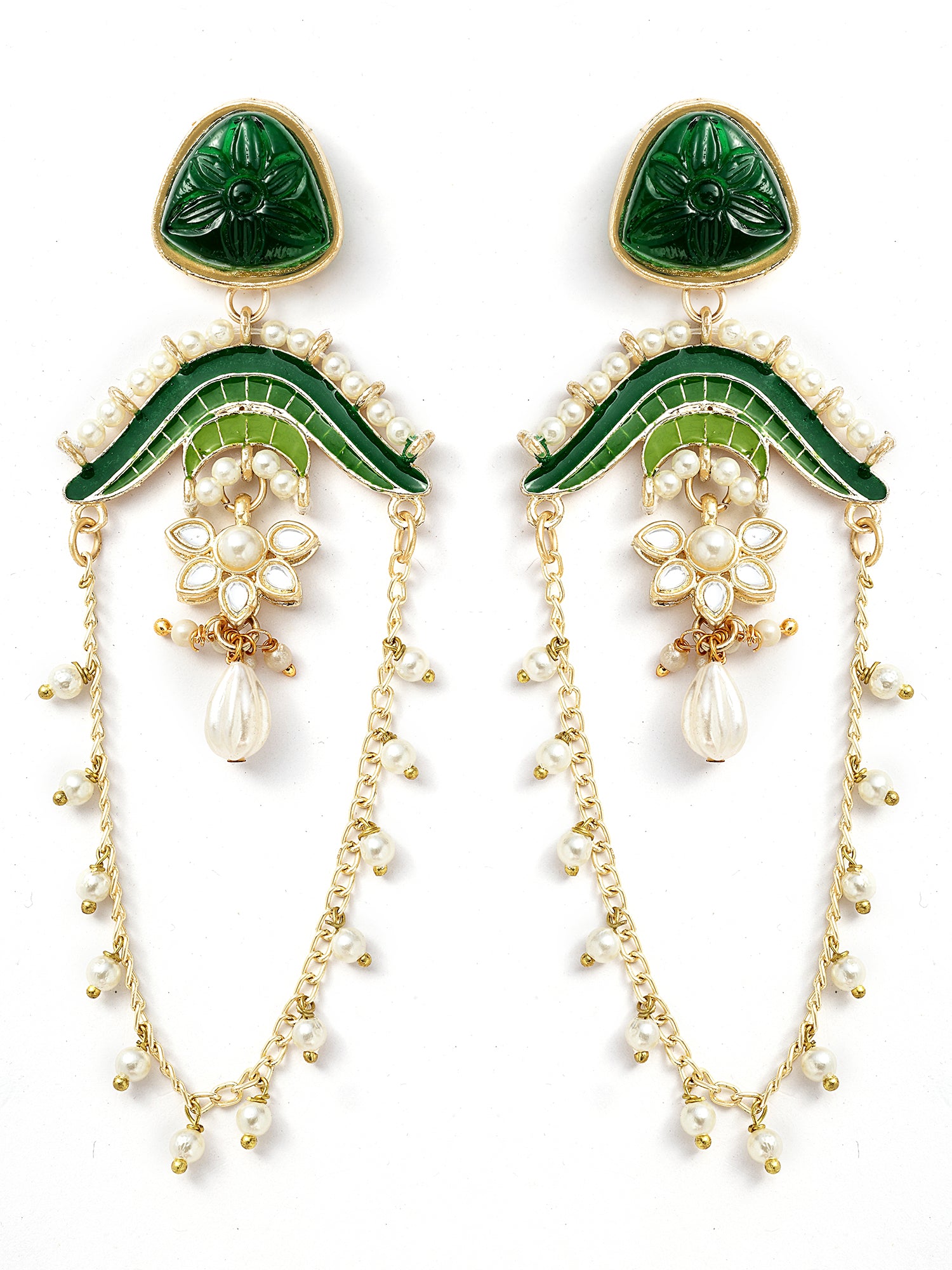 KARATCART Designer Gold-Plated Green Enamel and Carved Stone Studded Kundan Drop Earrings for Women