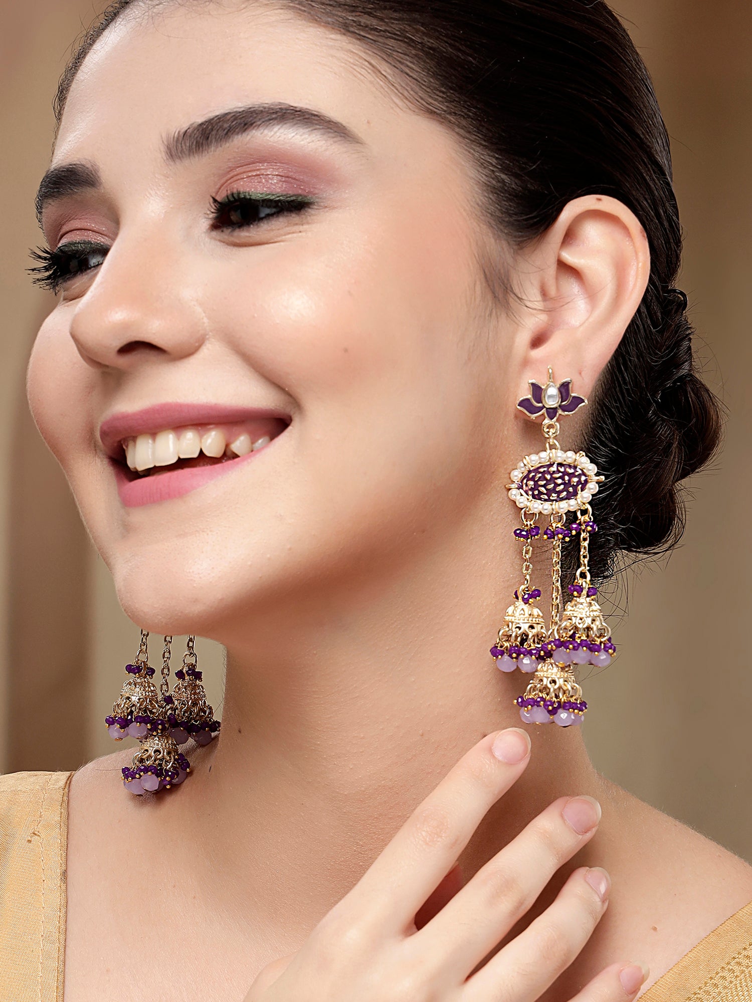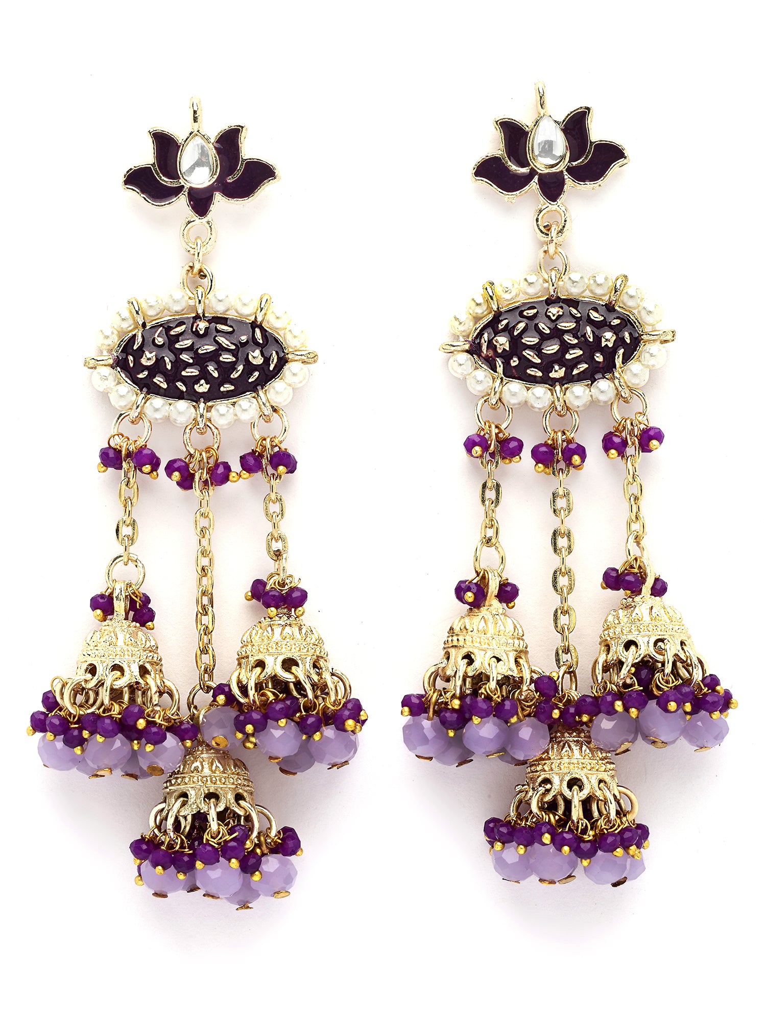 KARATCART Gold-Plated Purple Enamel Crystal-Studded Kundan Tassel Earrings for Women