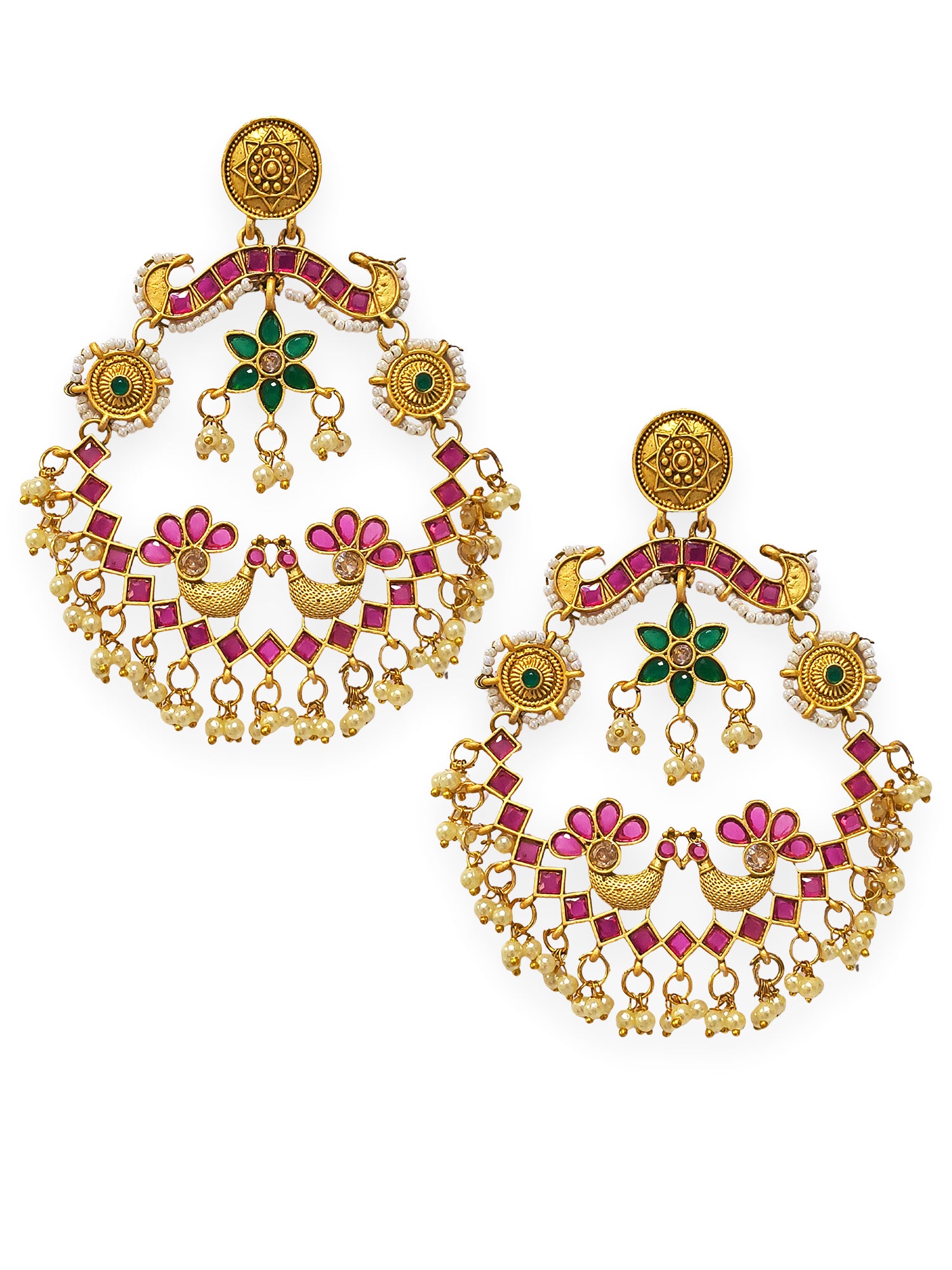 KARATCART Designer Peacock Motif Pink & Green Stone Gold-Plated Temple Chandbali Earrings for Women