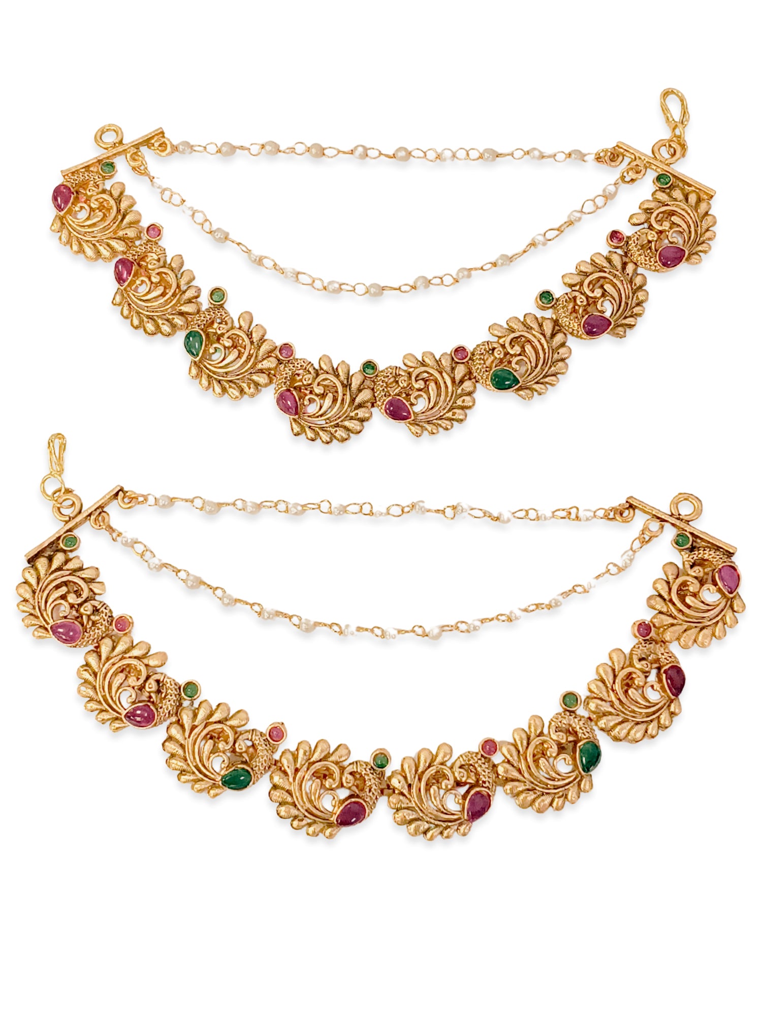KARATCART Designer Gold-Plated Red and Green Stone Studded Peacock Kaanchain Earrings for Women