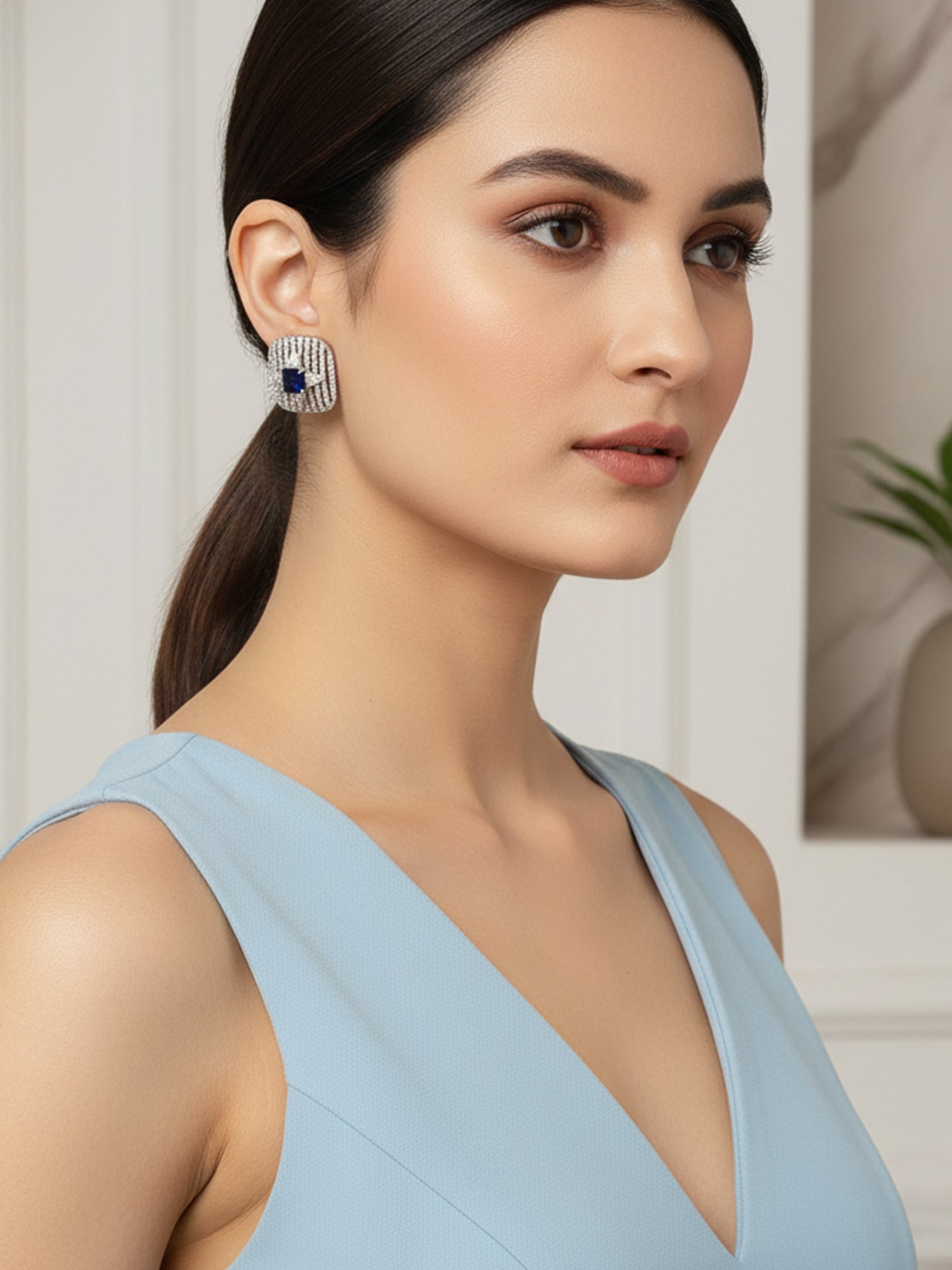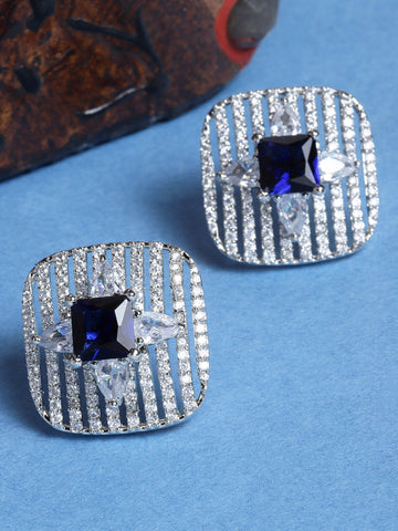 Silver Tone Blue Square American Diamond Drop Earrings for Women