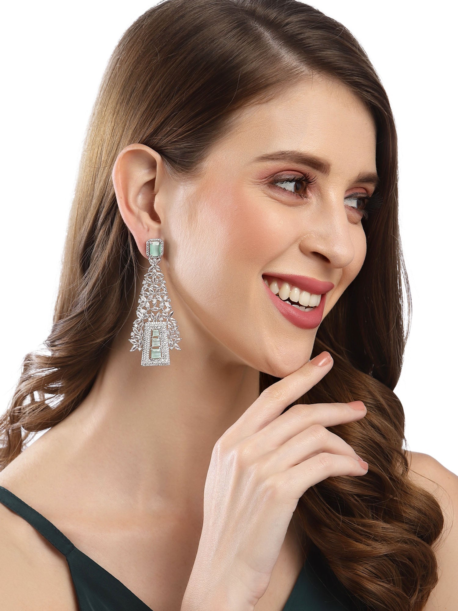 - Karatcart Silver Tone Light Green Cubic Zirconia Tree Shape Dangler Earrings for Women .It is made with high-quality Kundan Stones which makes them very skin-friendly. Perfect for Weddings, Parties, Festivals, and Traditional Occasions. Gracefully pair Saree, Kurti, or any Indo-western outfit to enhance your look. These are made from toxic-free materials which are Anti-Allergic and Safe for the skin.