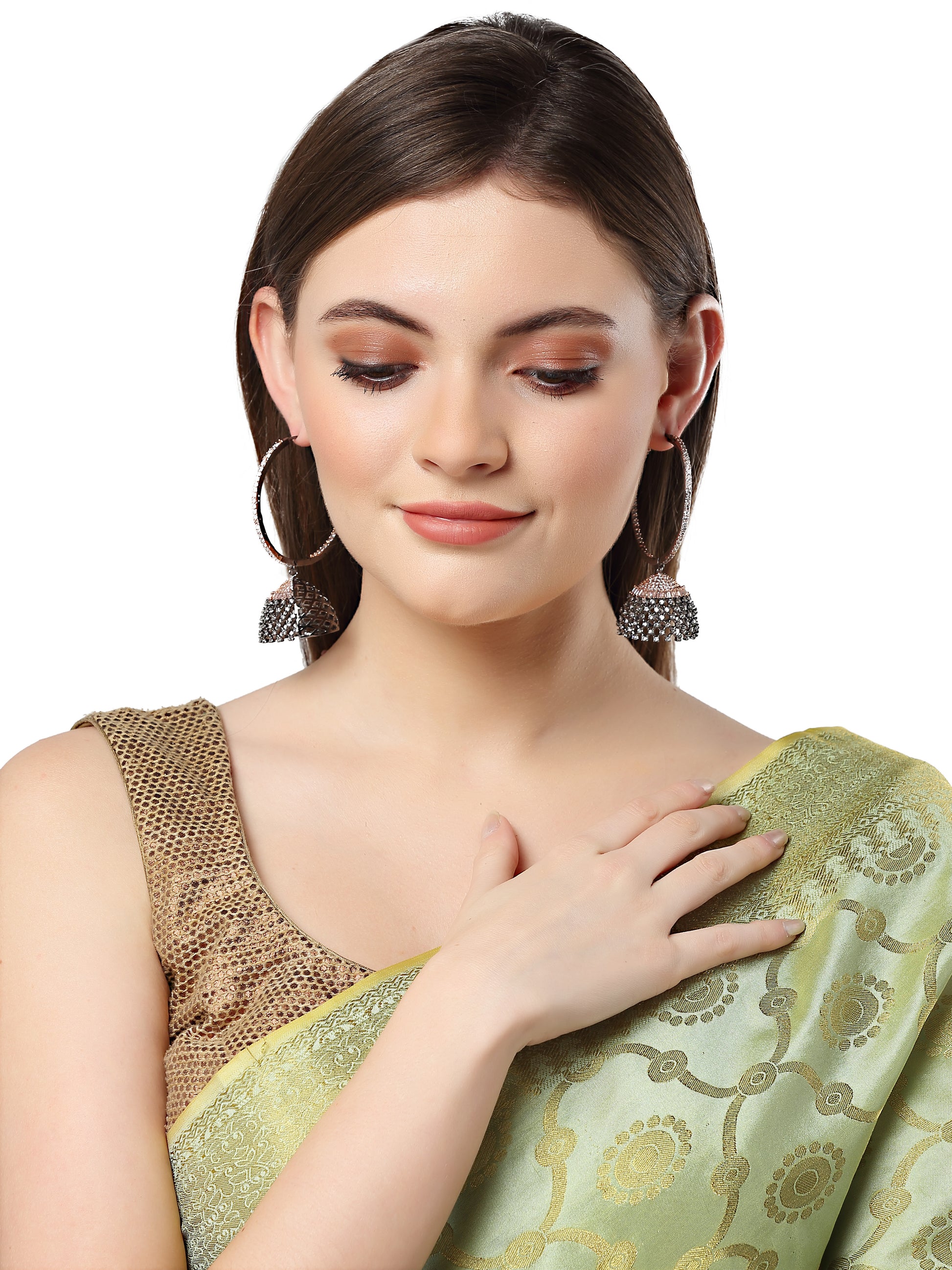 - Karatcart Rose Gold Plated Black Finished Cubic Zirconia Studded Jhumki Earrings for Women .It is made with high-quality Kundan Stones which makes them very skin-friendly. Perfect for Weddings, Parties, Festivals, and Traditional Occasions. Gracefully pair Saree, Kurti, or any Indo-western outfit to enhance your look. These are made from toxic-free materials which are Anti-Allergic and Safe for the skin.
