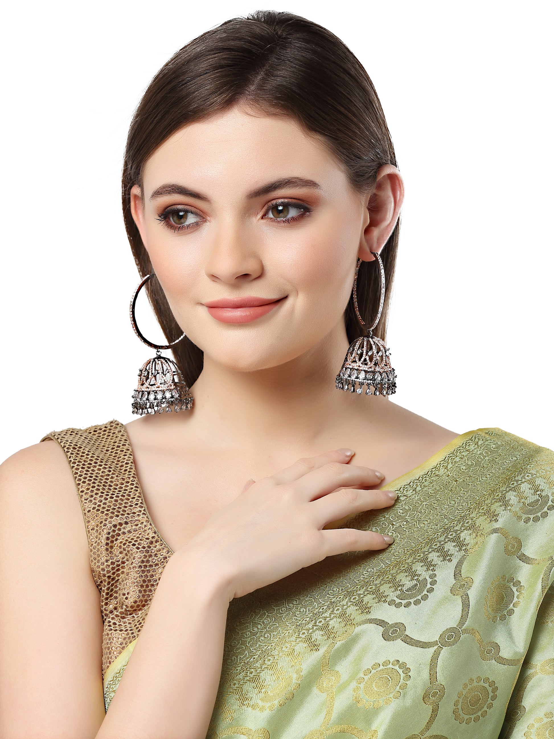 • Karatcart Rose Gold Plated Black Finished Cubic Zirconia Studded Jhumki Earrings for Women .It is made with high-quality Kundan Stones which makes them very skin-friendly. Perfect for Weddings, Parties, Festivals, and Traditional Occasions. Gracefully pair Saree, Kurti, or any Indo-western outfit to enhance your look. These are made from toxic-free materials which are Anti-Allergic and Safe for the skin.