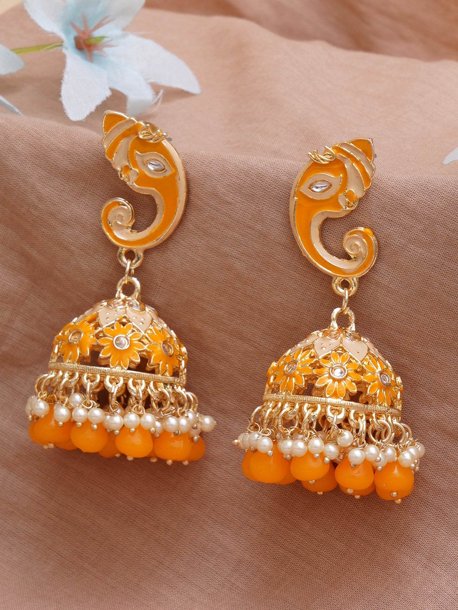 - Karatcart Gold Plated Yellow Lord Ganesha Jhumki Earrings for Women. Our products are designed with high-quality material and these products are enhanced with plating that are skin-friendly & with love to reach your heart.