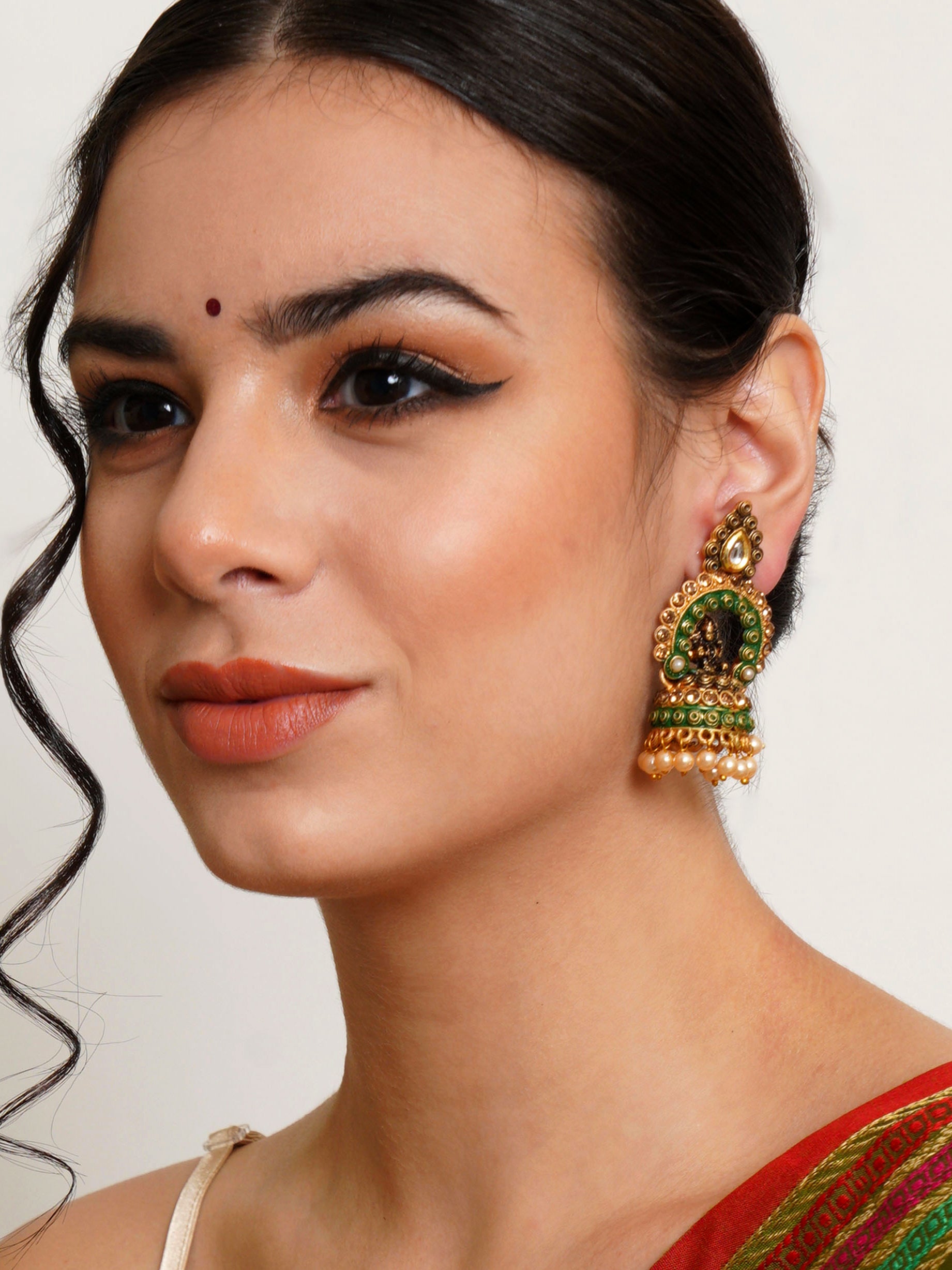 - Karatcart Gold Plated Green Mata Laxmi Jhumki Earrings for Women. Our products are designed with high-quality material and these products are enhanced with plating that are skin-friendly & with love to reach your heart.