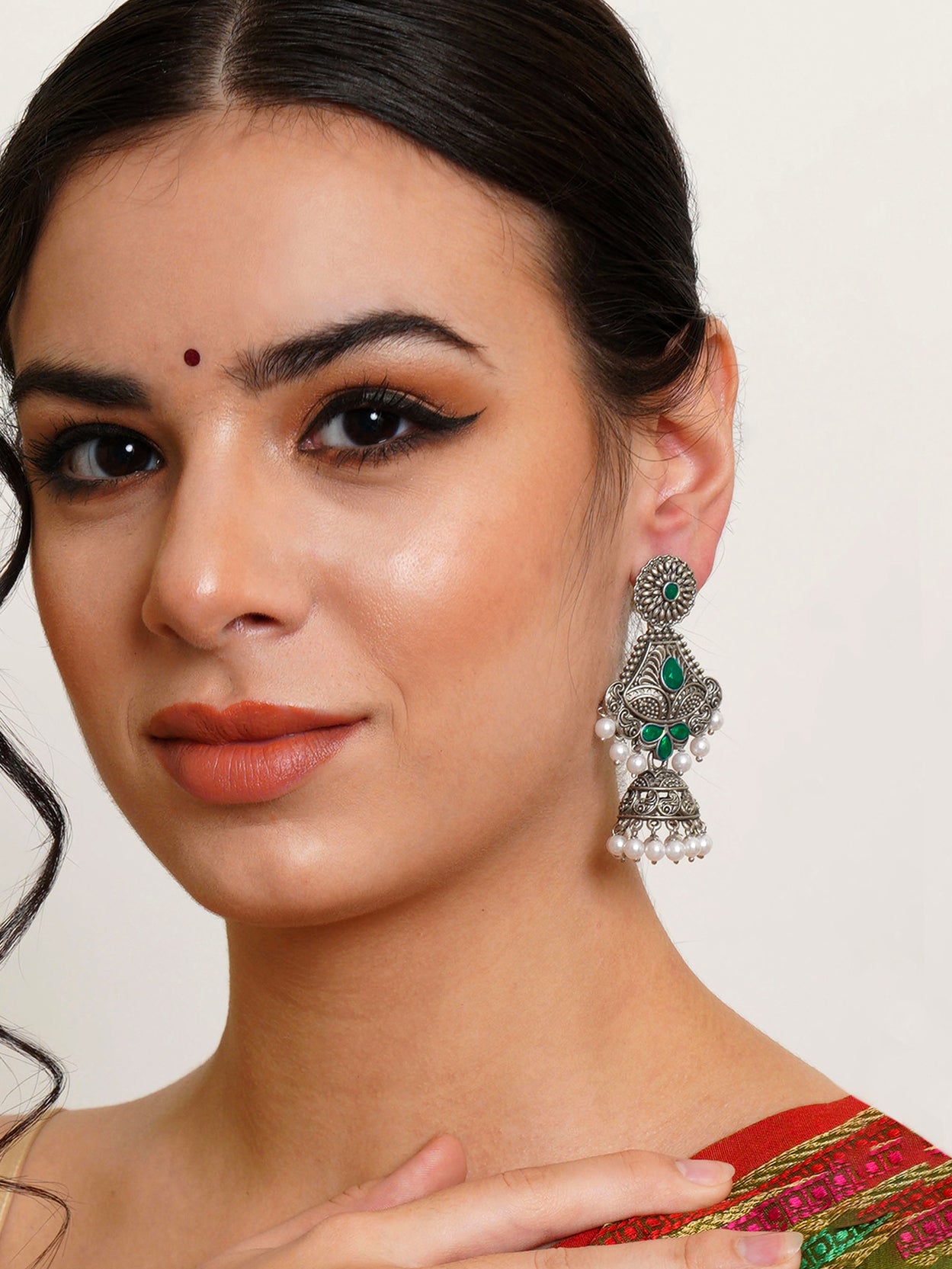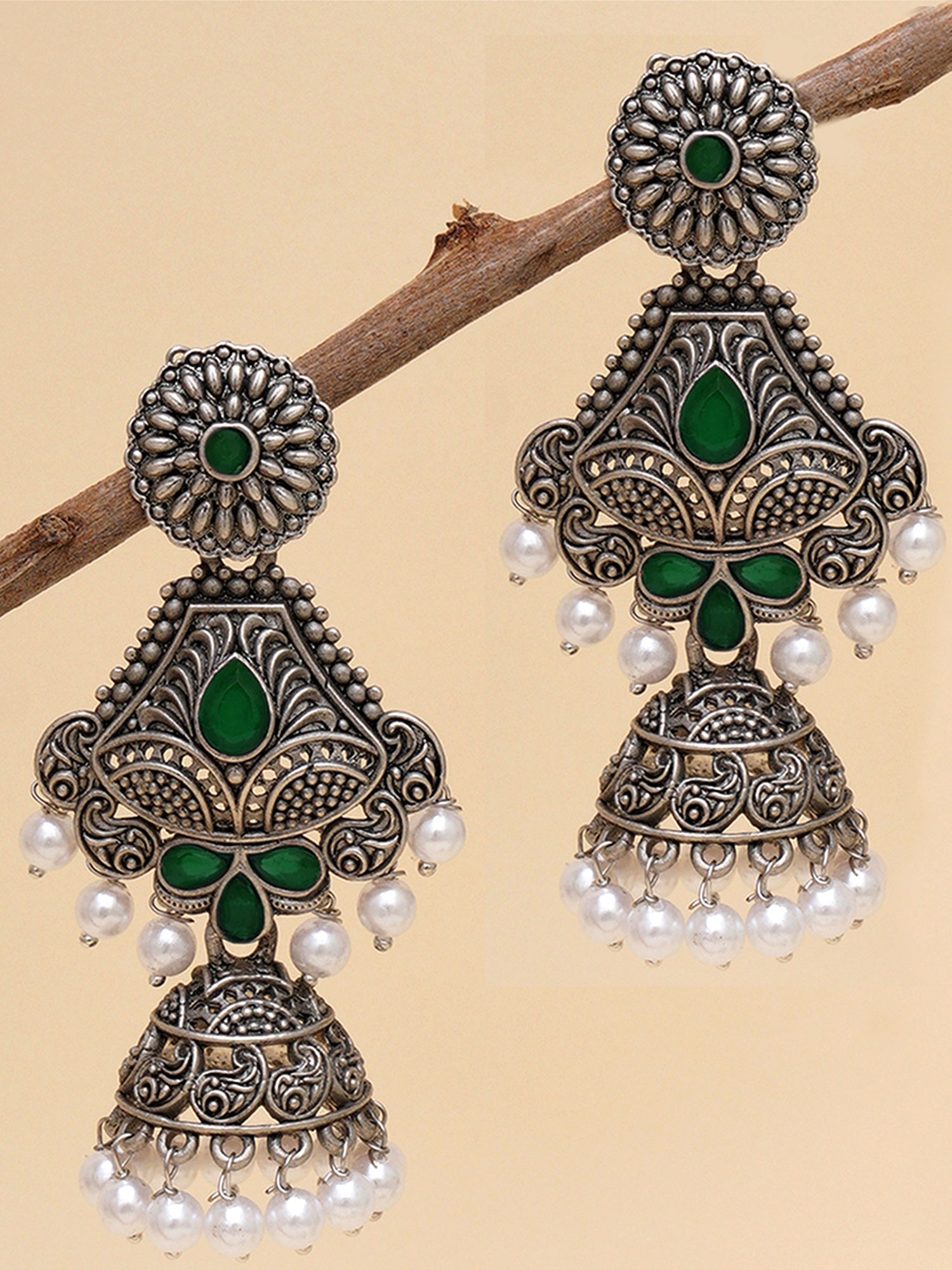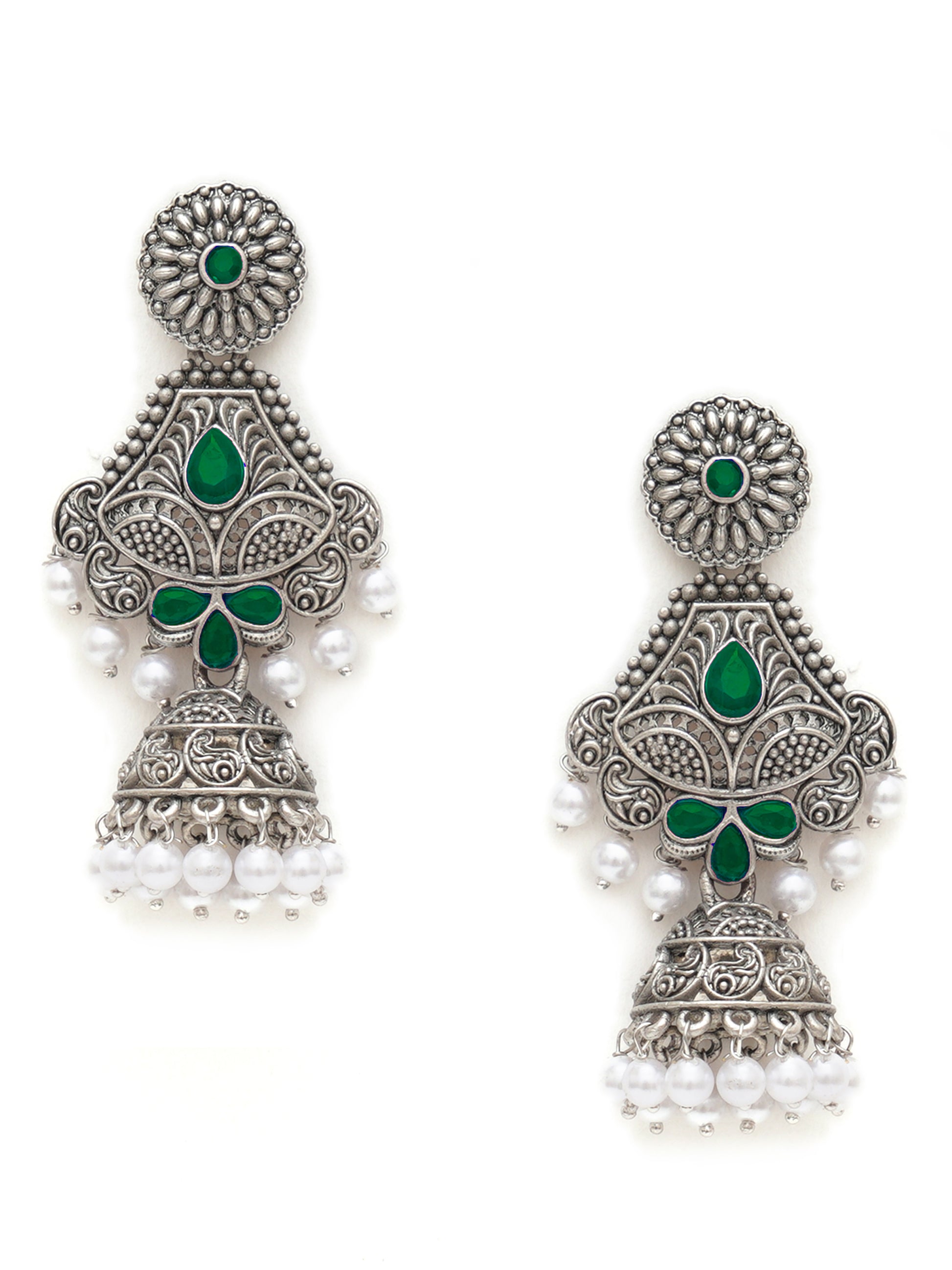 - Karatcart Oxidised Silver Handcrafted Green Long Dangler Jhumki Earrings for Women. Our products are designed with high-quality material and these products are enhanced with plating that are skin-friendly & with love to reach your heart.