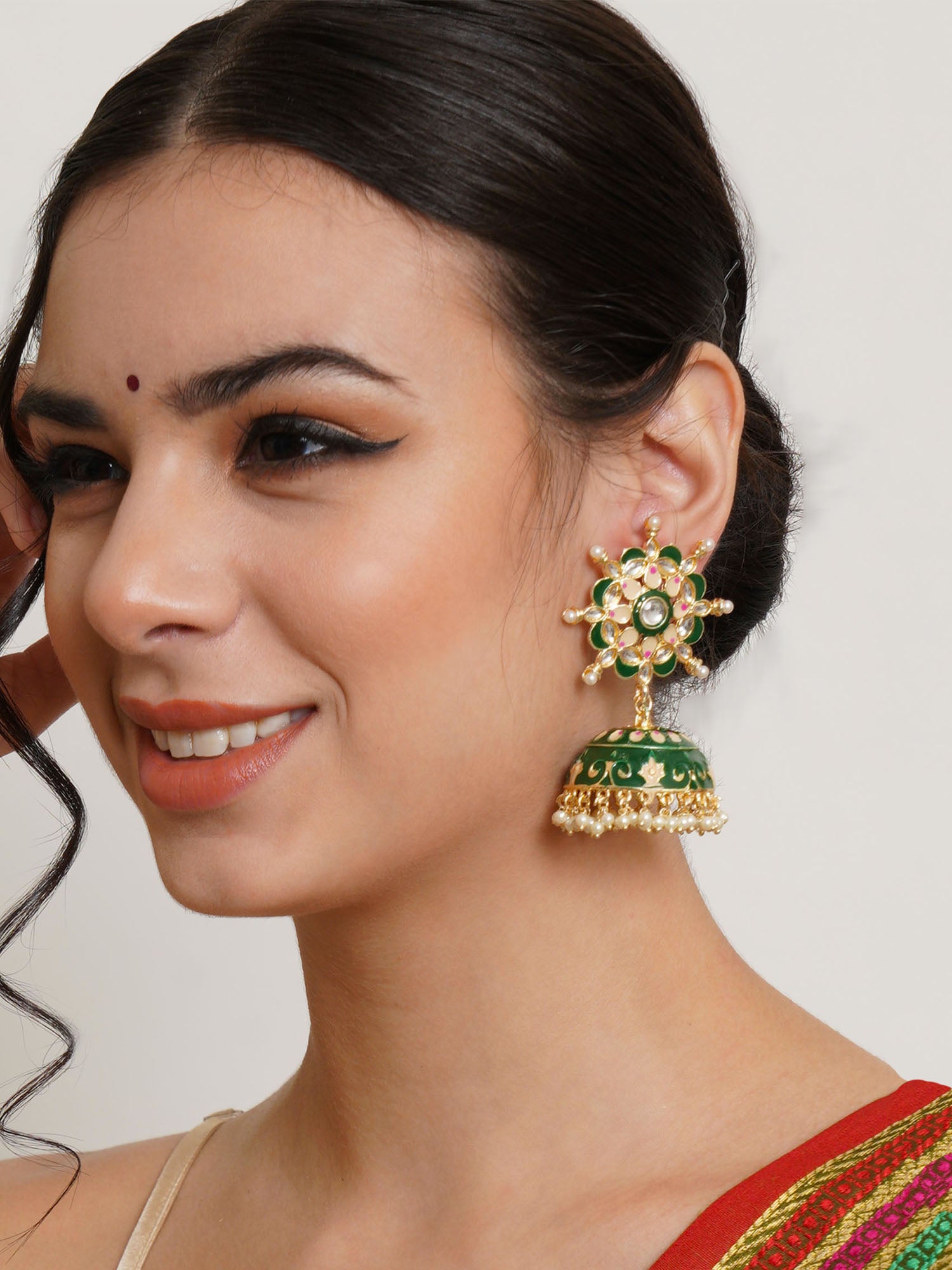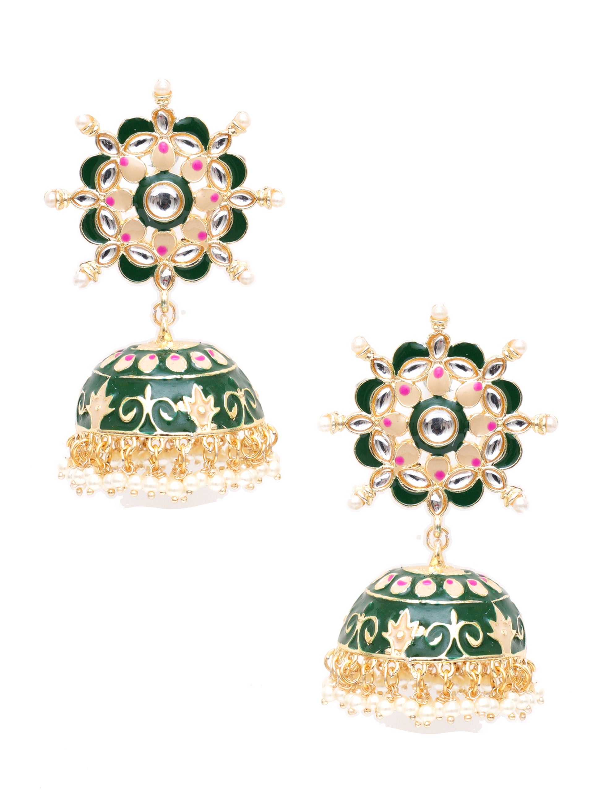 Karatcart Gold Plated Floral Design Green Meena and Pearl Jhumki Earrings for Women. Our products are designed with high-quality material and these products are enhanced with plating that are skin-friendly & with love to reach your heart.