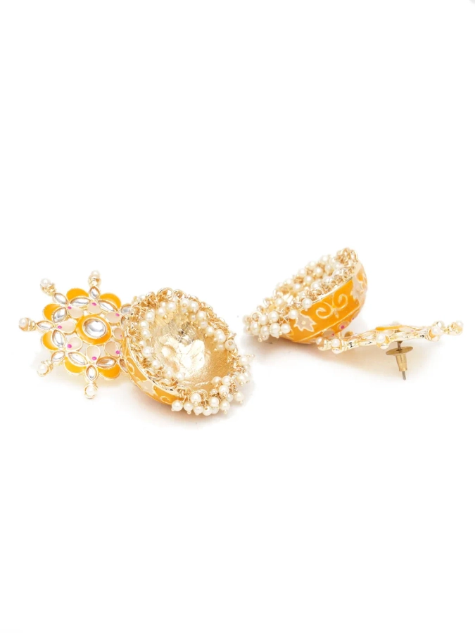 Karatcart Gold Plated Floral Design Yellow Meena and Pearl Jhumki Earrings for Women. Our products are designed with high-quality material and these products are enhanced with plating that are skin-friendly & with love to reach your heart.