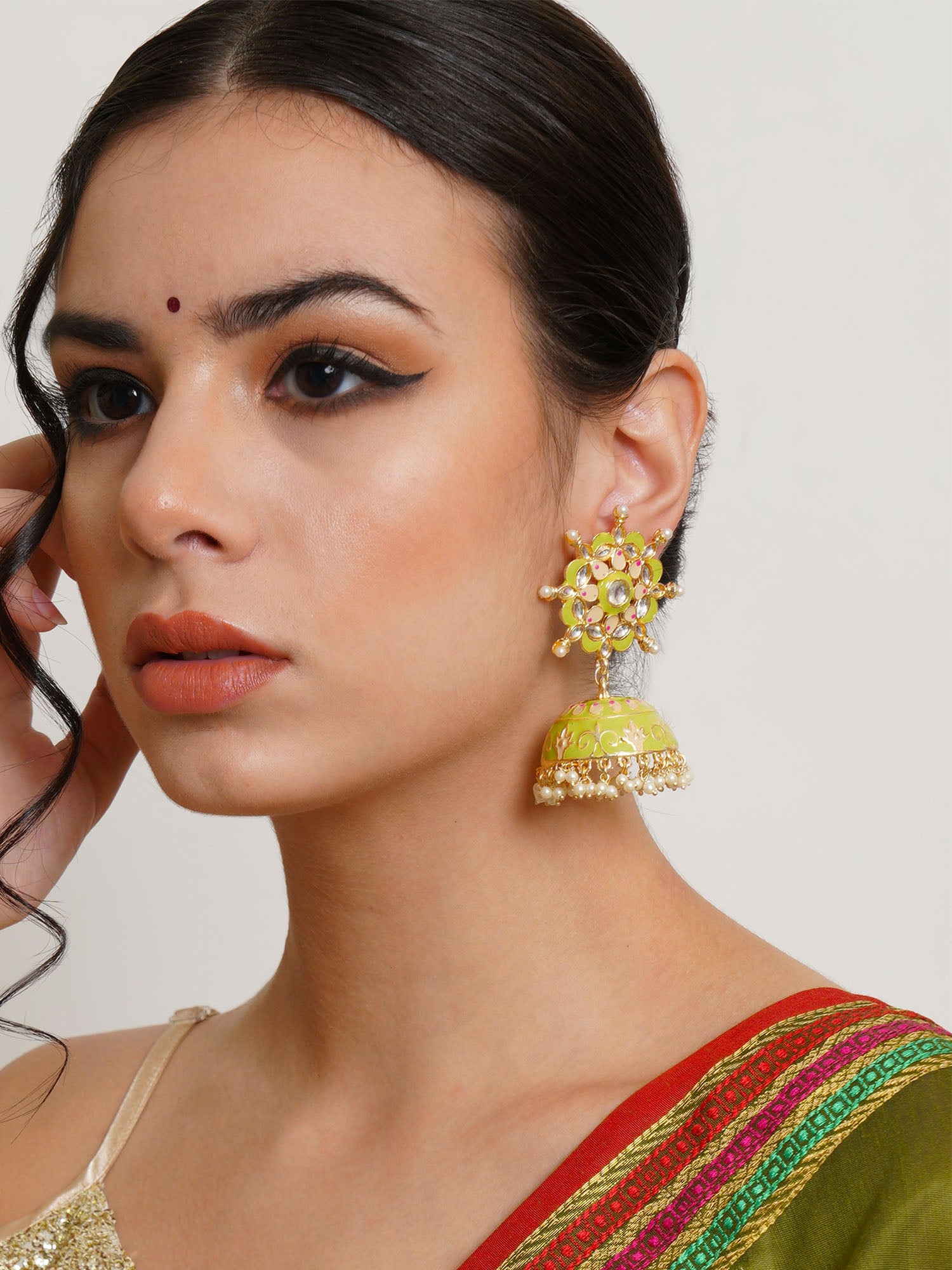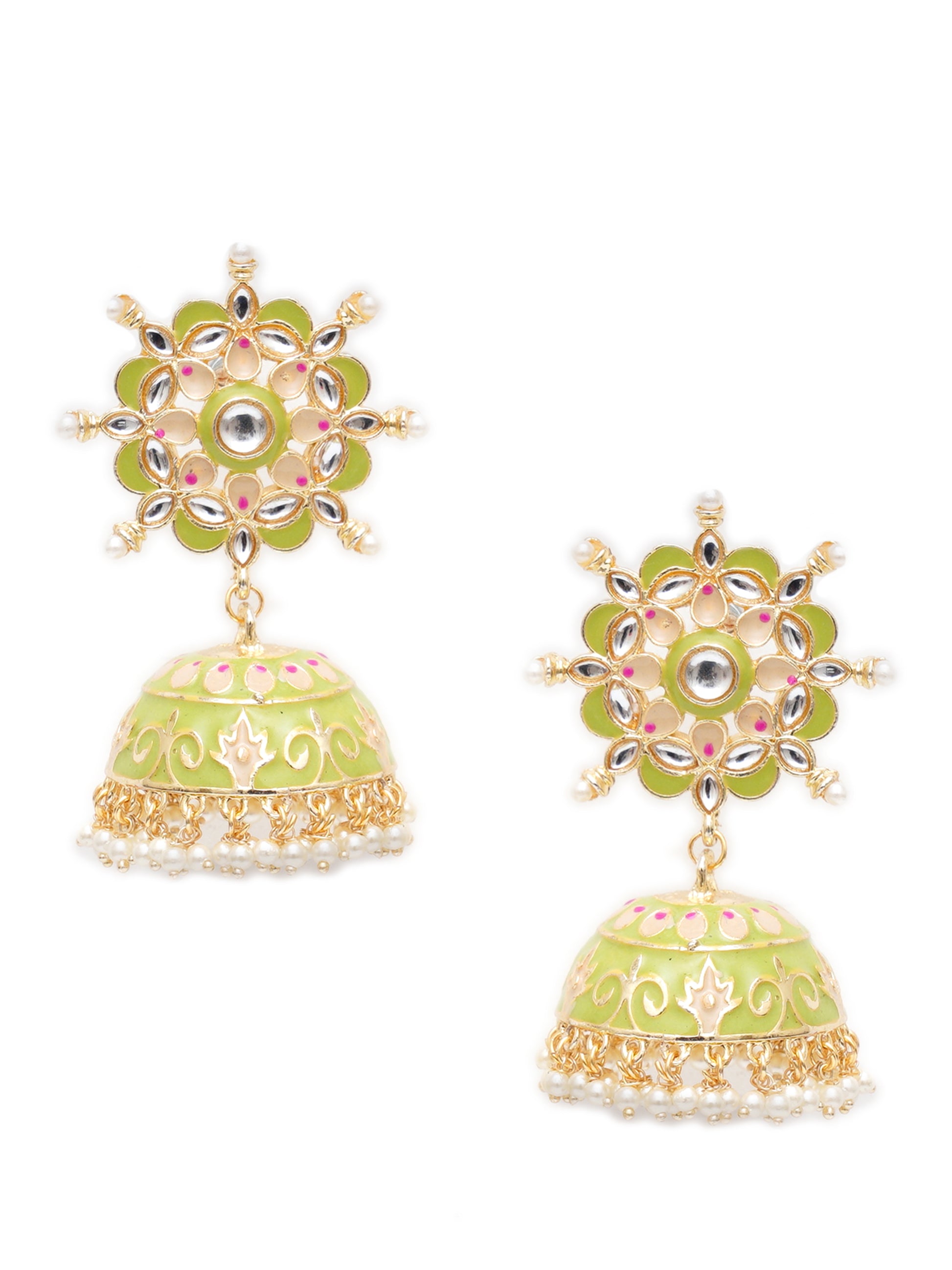 Karatcart Gold Plated Floral Design Light Green Meena and Pearl Jhumki Earrings for Women. Our products are designed with high-quality material and these products are enhanced with plating that are skin-friendly & with love to reach your heart.