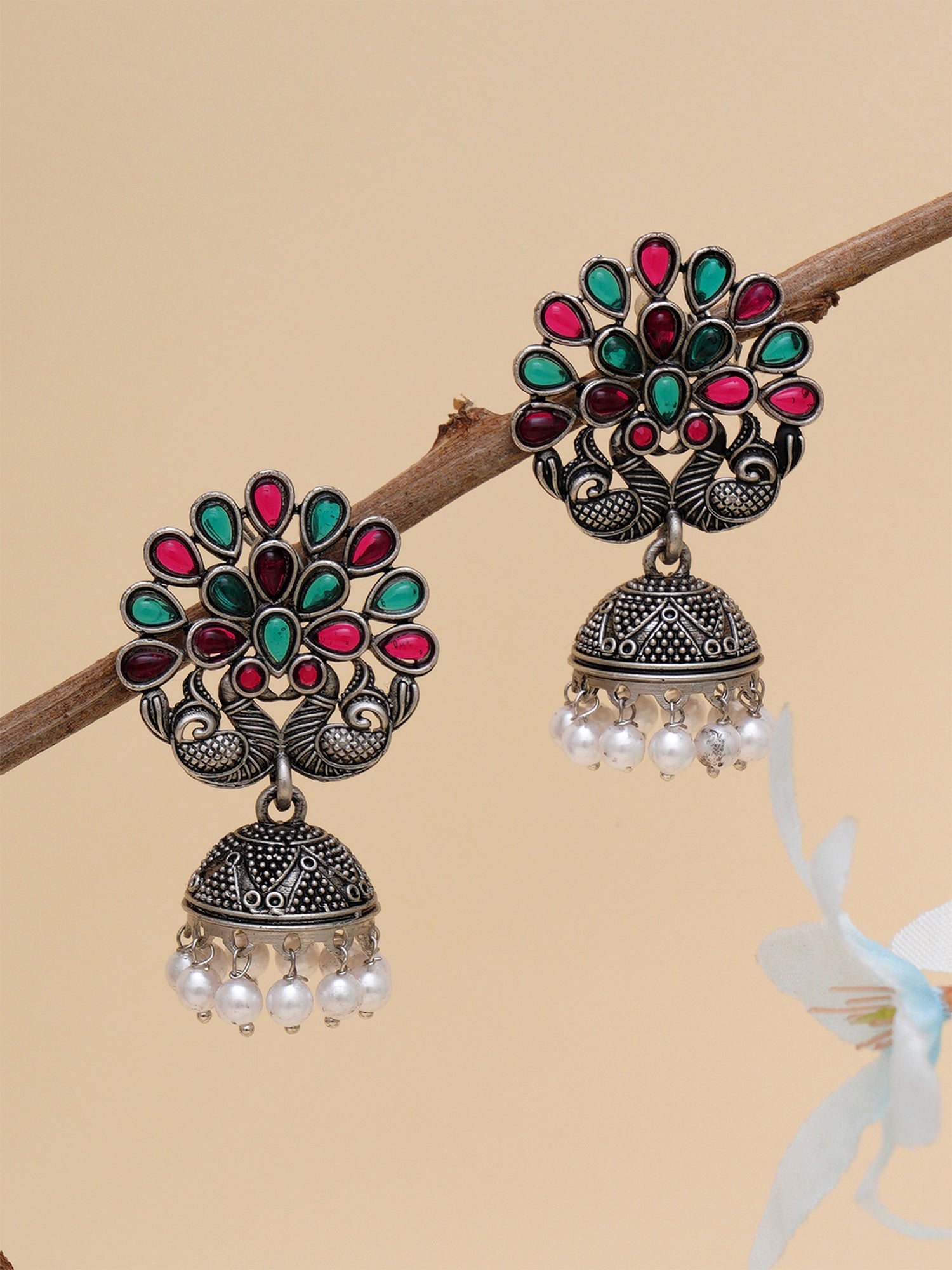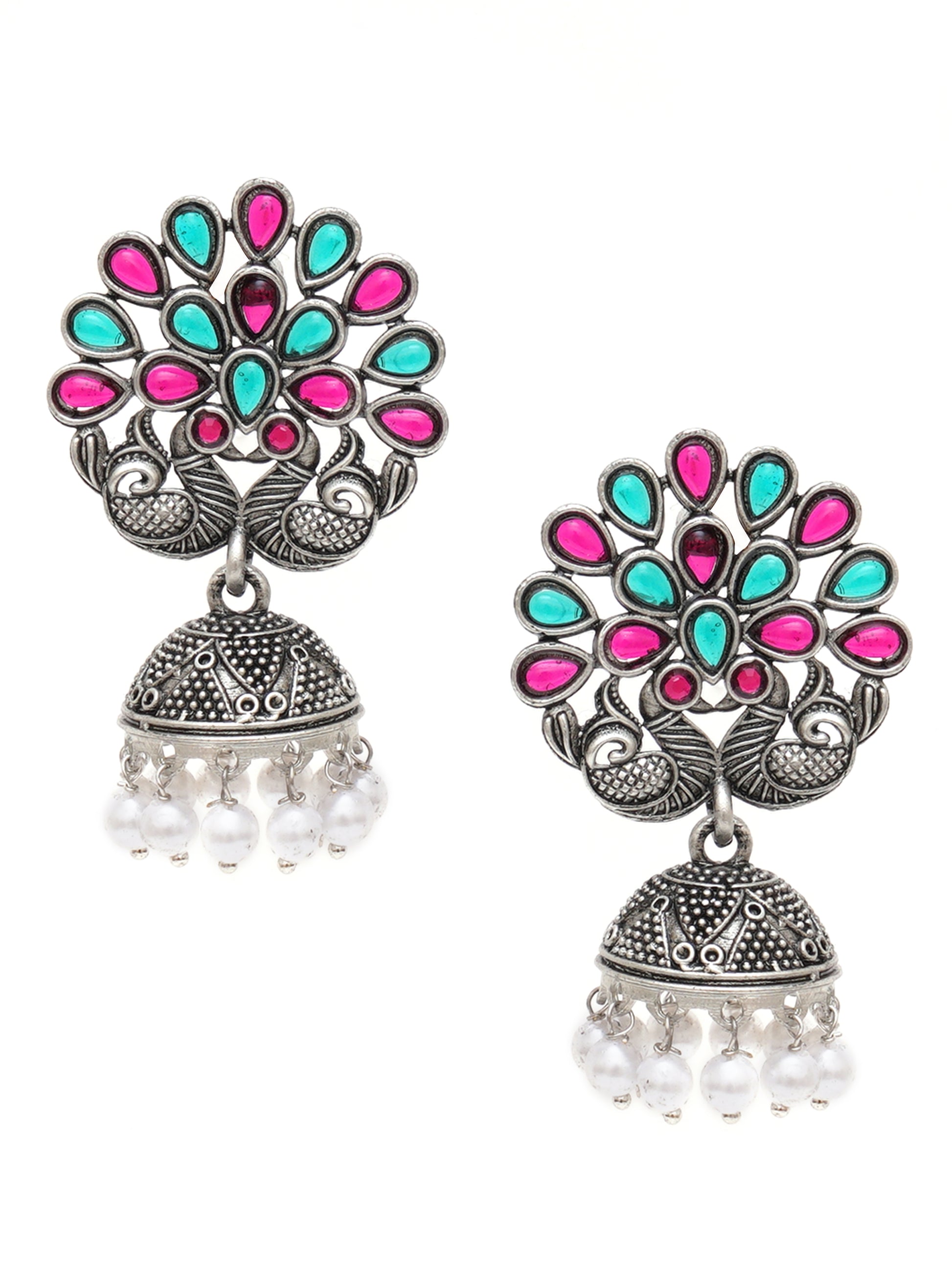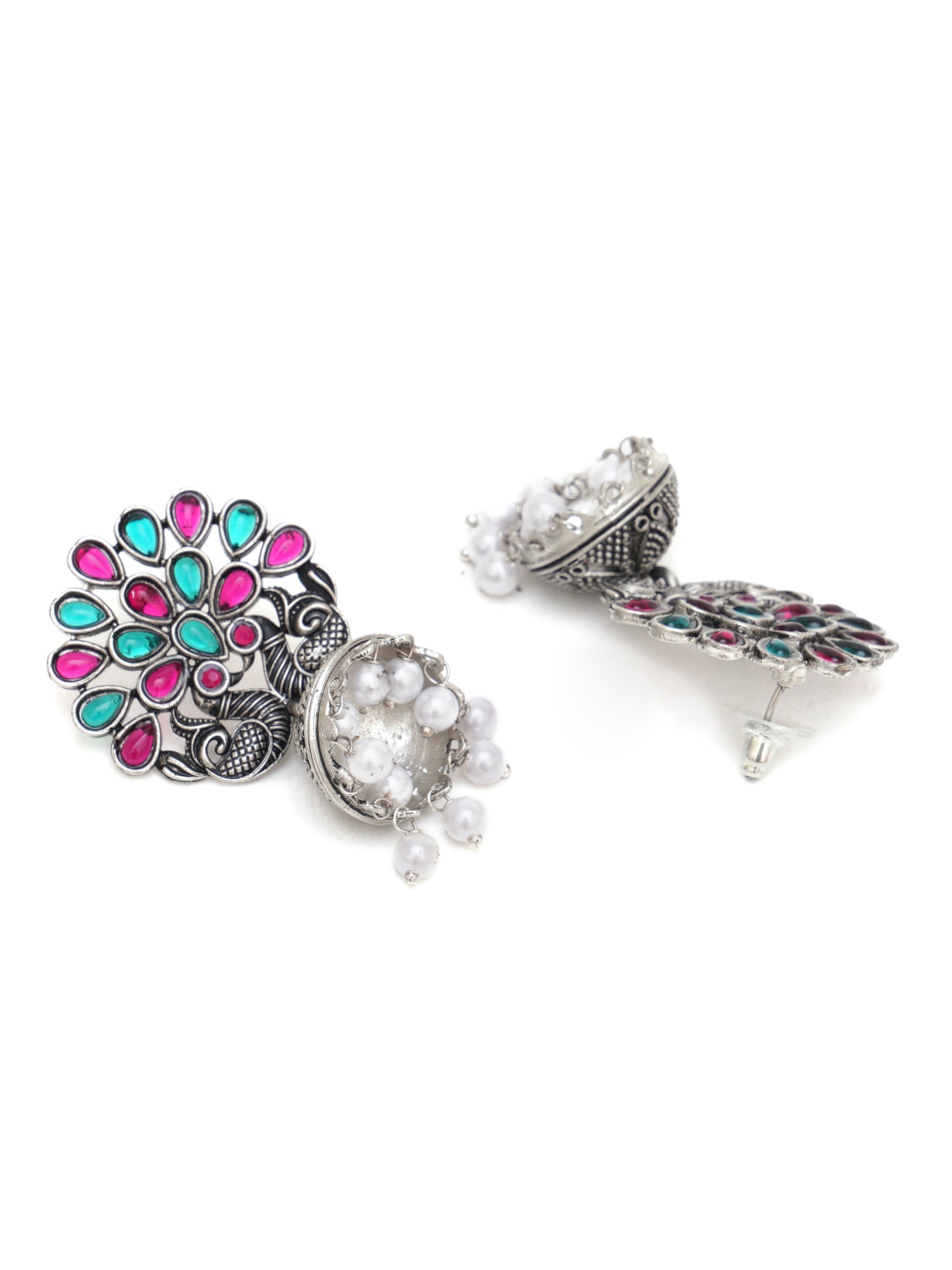 Karatcart Oxidised Silver Peacock Shape Red and Green Stone Jhumki Earrings for Women