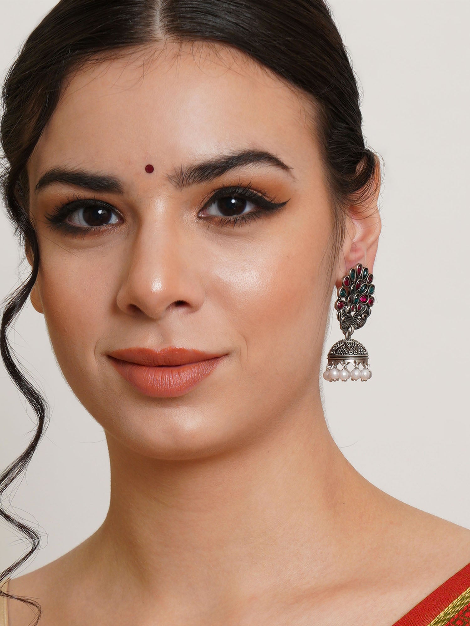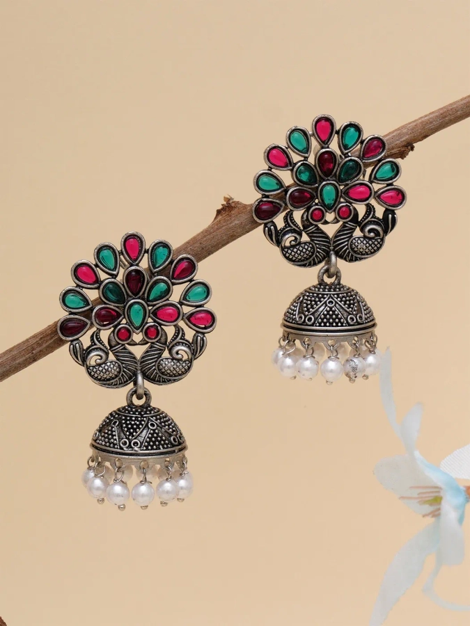 Karatcart Oxidised Silver Peacock Shape Red and Green Stone Jhumki Earrings for Women. Our products are designed with high-quality material and these products are enhanced with plating that are skin-friendly & with love to reach your heart.