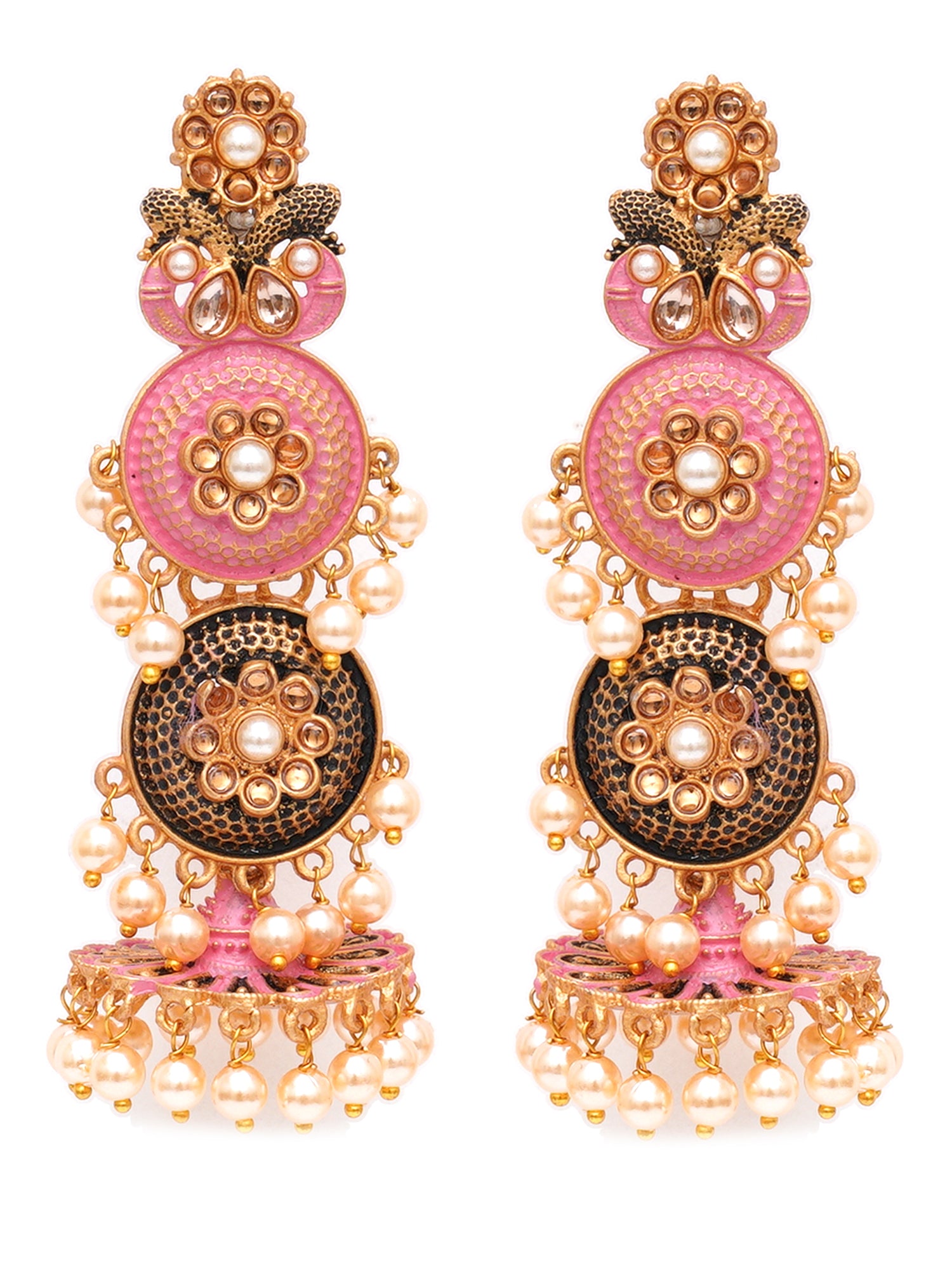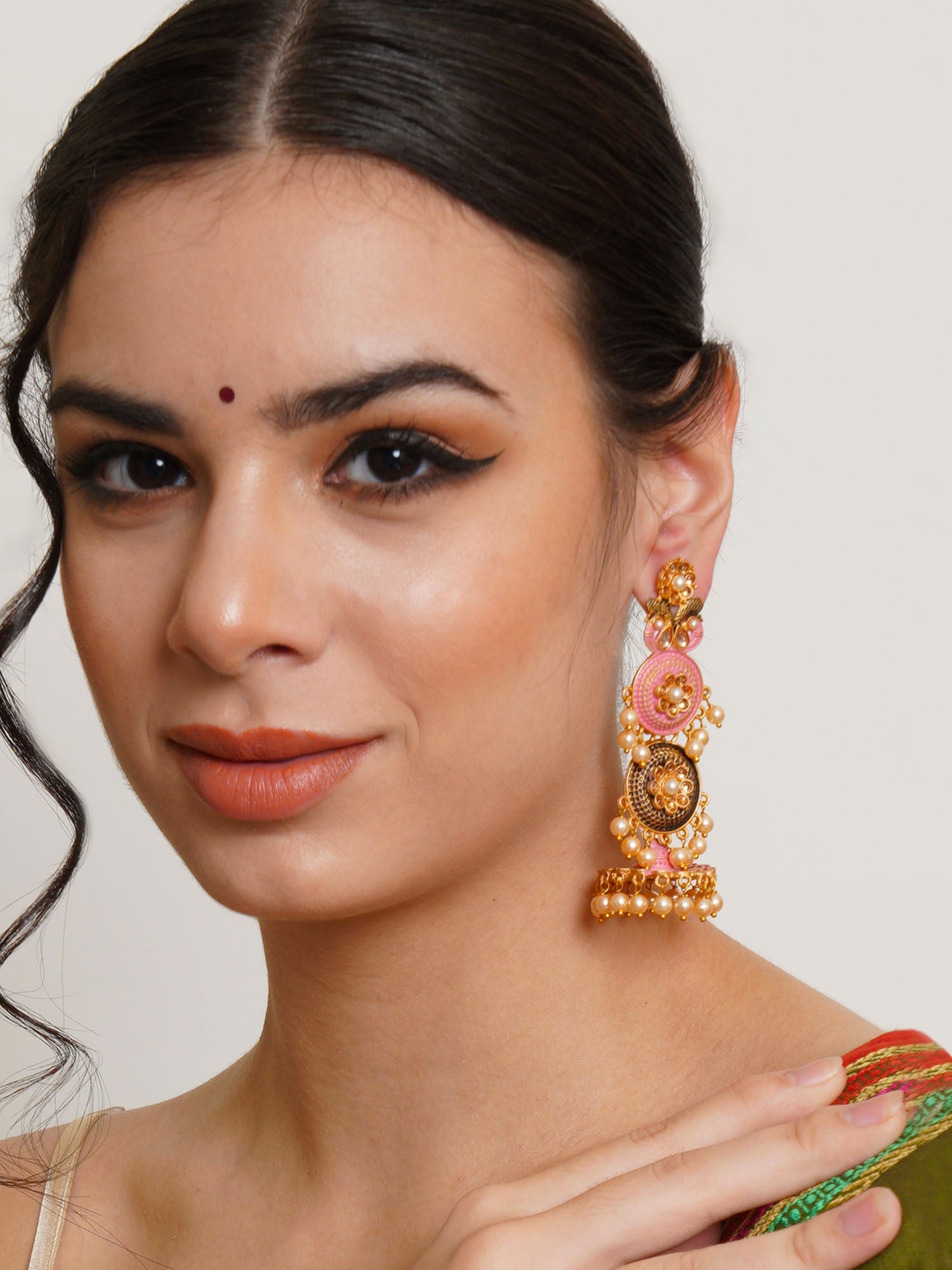 Karatcart Gold Plated Antique Floral Design Pink Drop Earrings for Women. Our products are designed with high-quality material and these products are enhanced with plating that are skin-friendly & with love to reach your heart.
