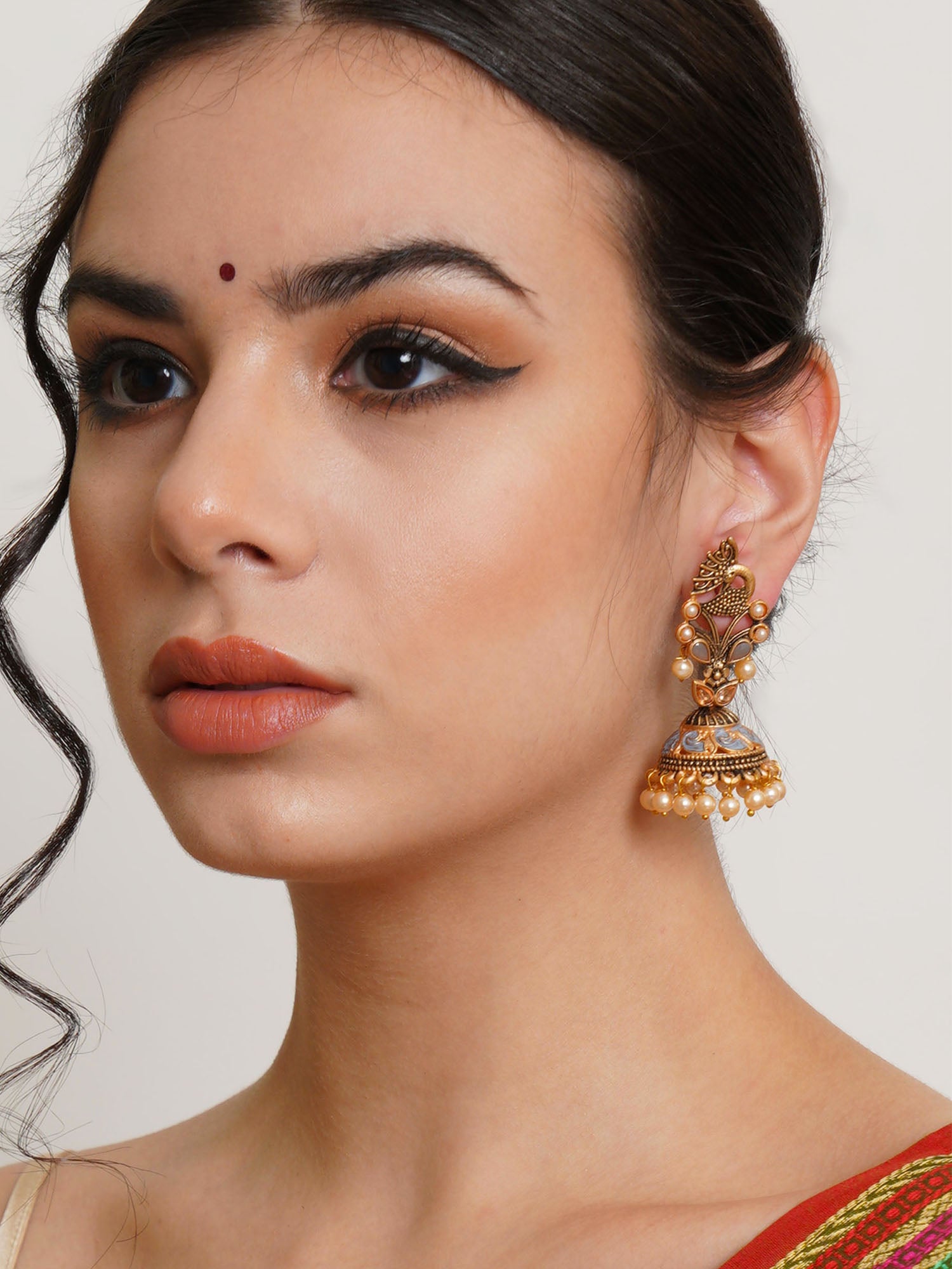 Karatcart Gold Plated Grey Stone Studded Peacock Shape Jhumki Earrings for Women. Our products are designed with high-quality material and these products are enhanced with plating that are skin-friendly & with love to reach your heart.
