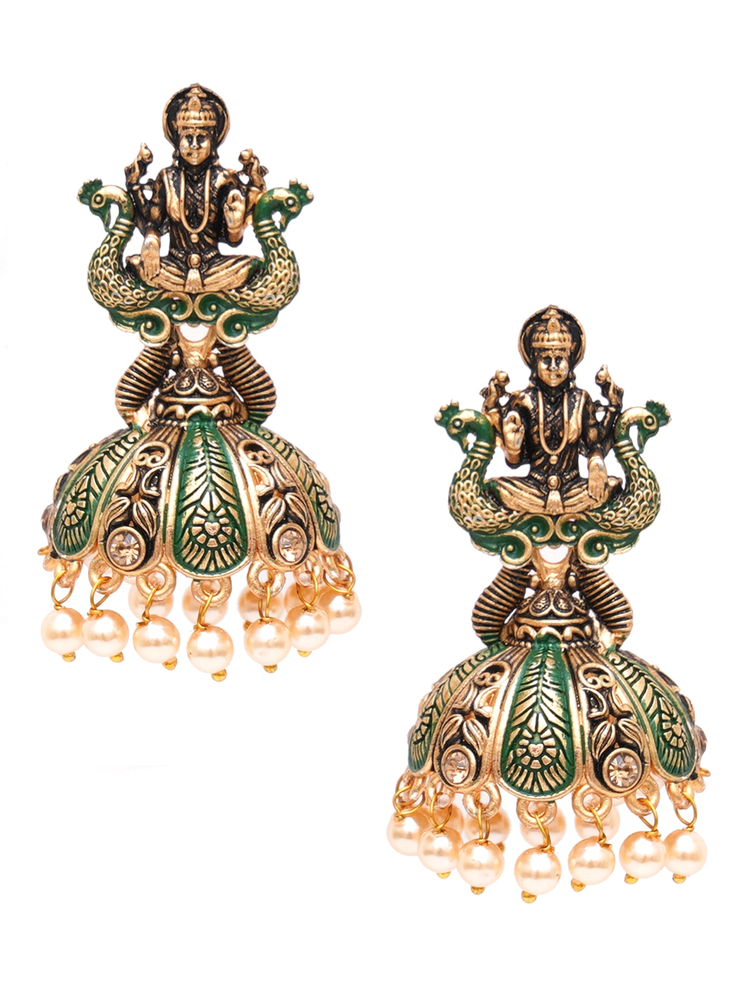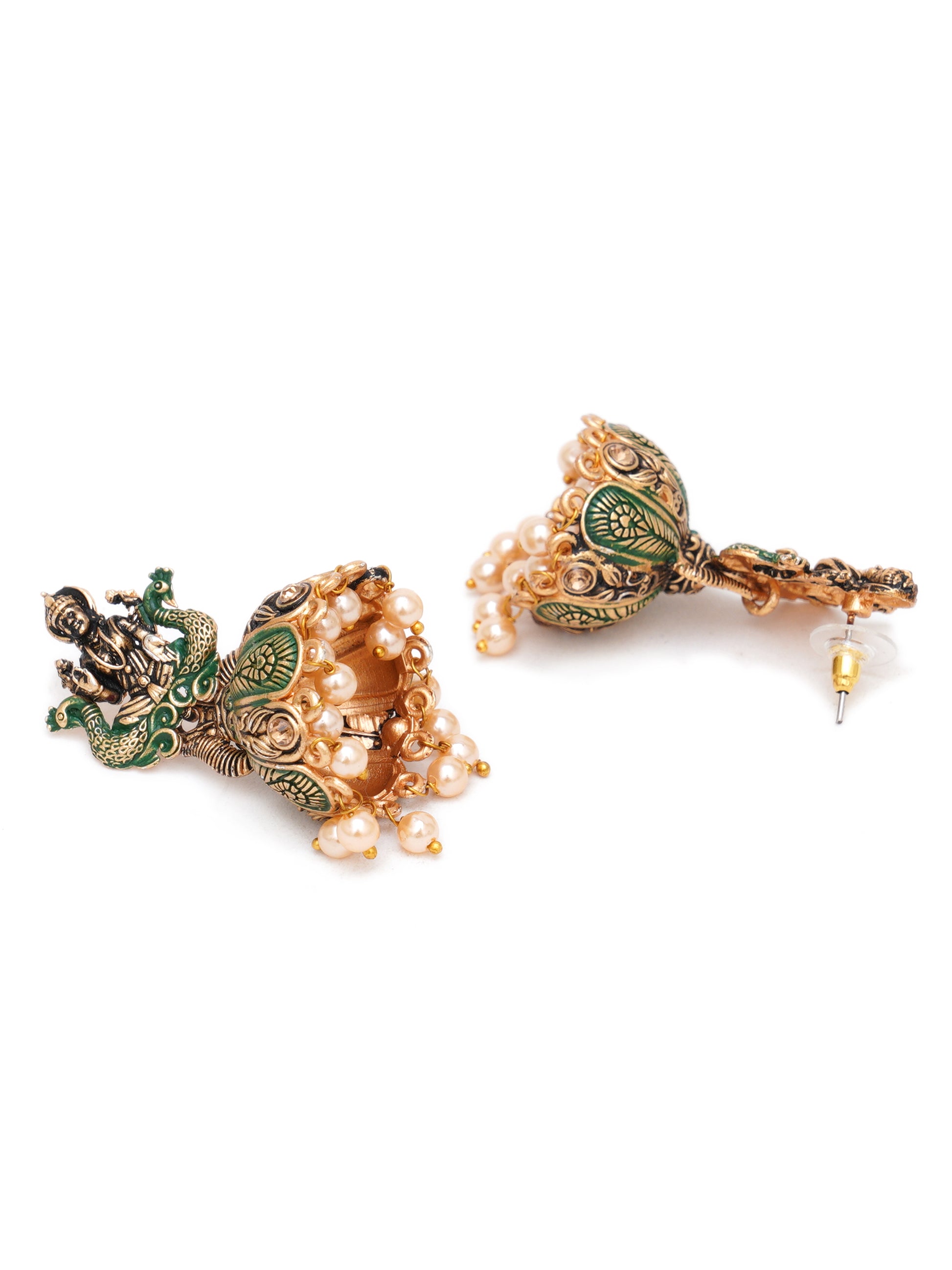 Karatcart Antique Gold Plated Green Mata Laxmi Jhumki Earrings for Women. Our products are designed with high-quality material and these products are enhanced with plating that are skin-friendly & with love to reach your heart.