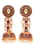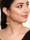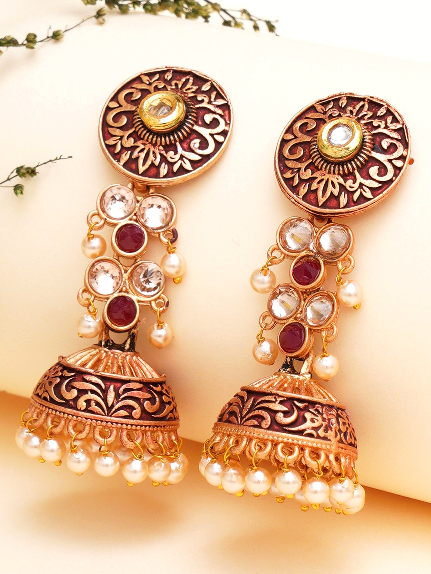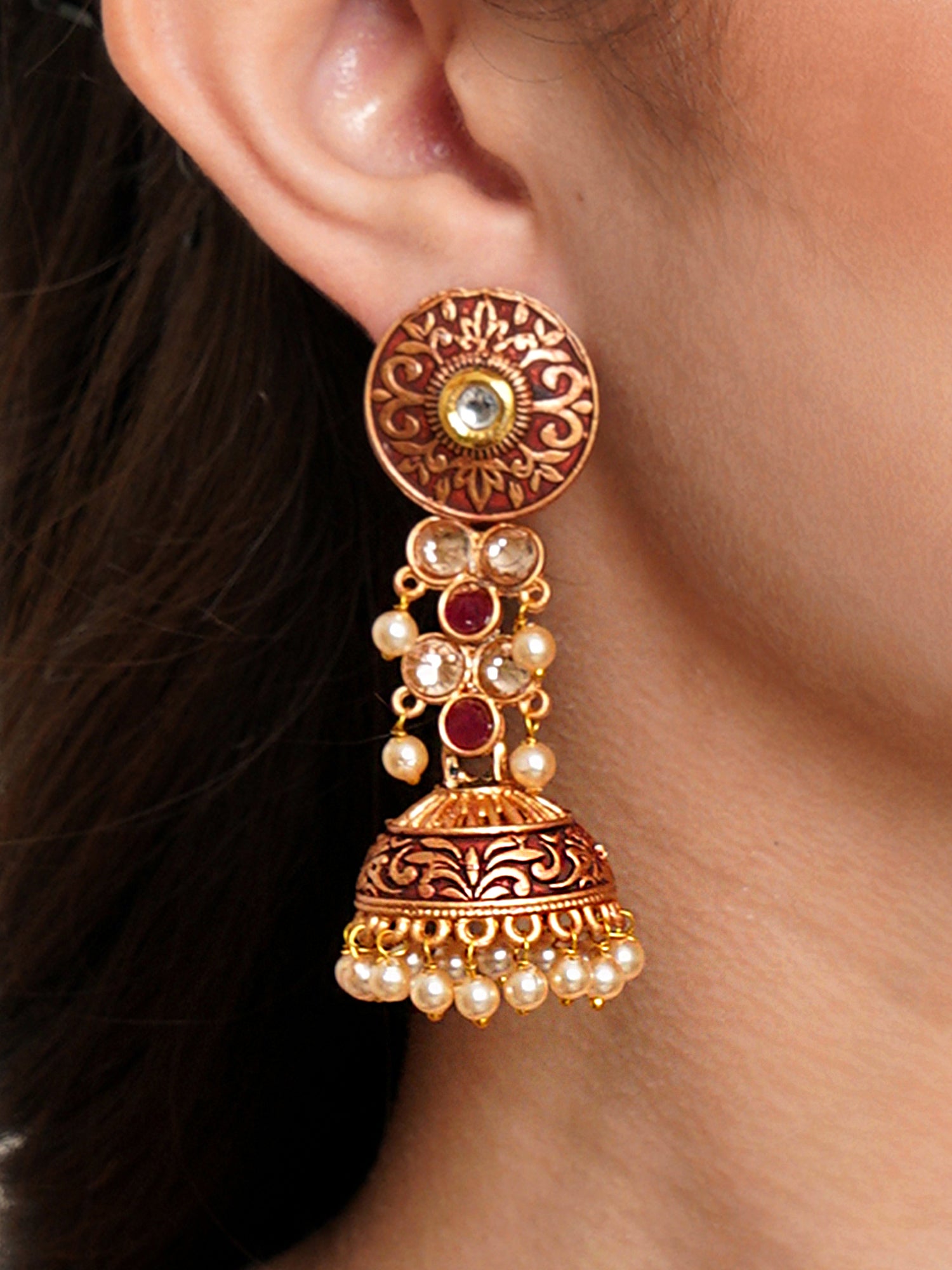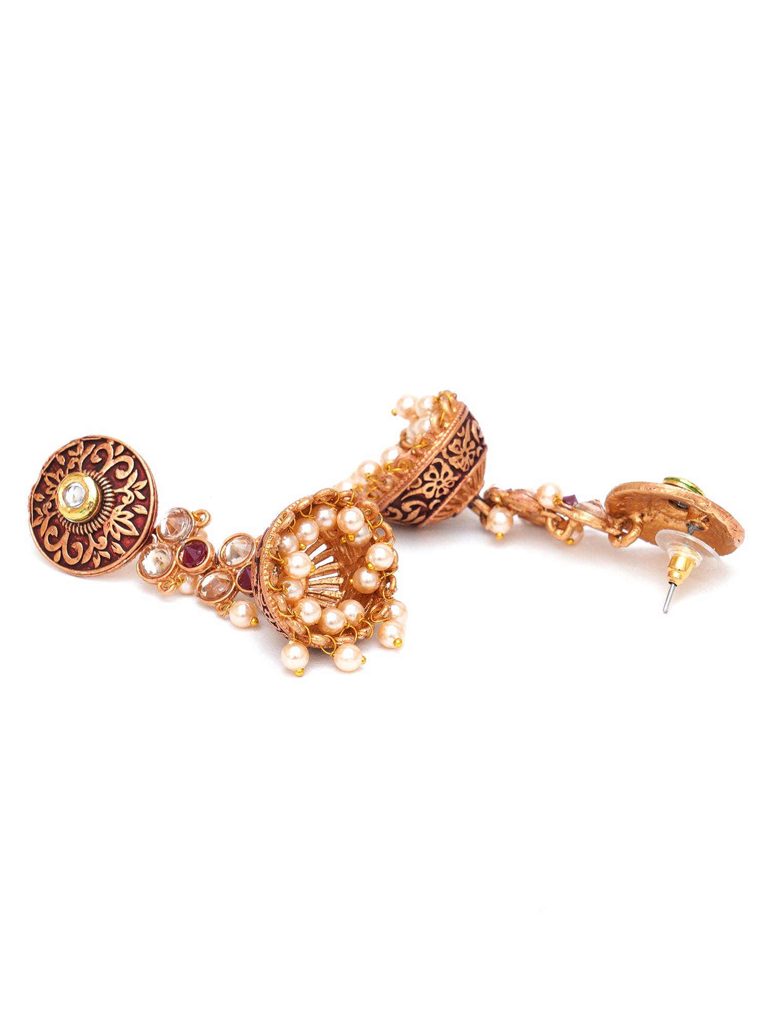 Karatcart Gold Plated Maroon Meena and Pearl Studded Jhumki Earrings for Women