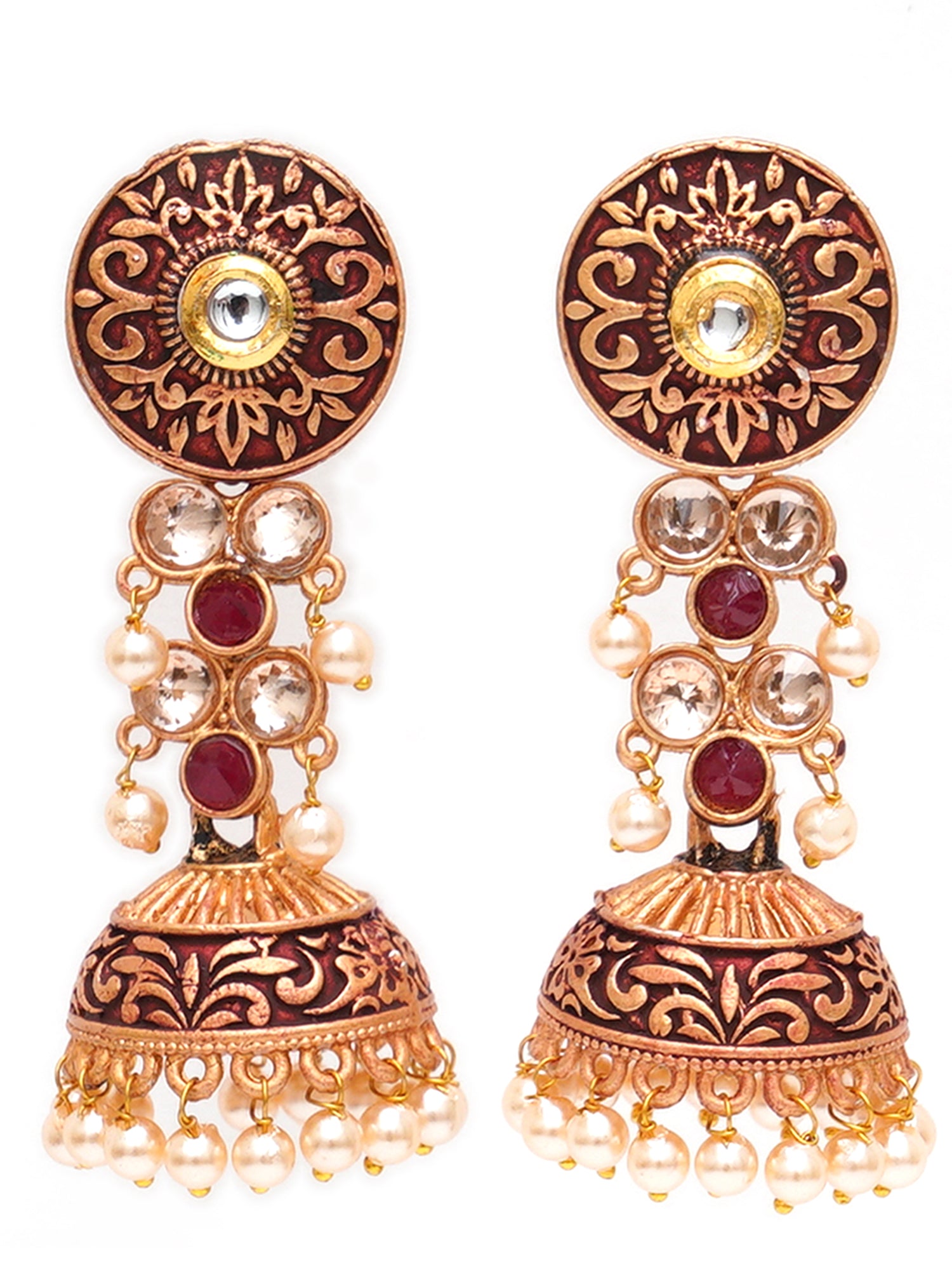 - This is a Maroon Earrings by Brand Karatcart which has Enamel stones.This is Gold Plated. We at KARATCART understand your desire to look the best on any day & we thrive in making any day an occasion. Every individual at Karatcart carries a passion for jewellery and it reflects in our beautiful designs as well as in our breathtaking craftsmanship. We create unique jewellery so you can make heads turn..