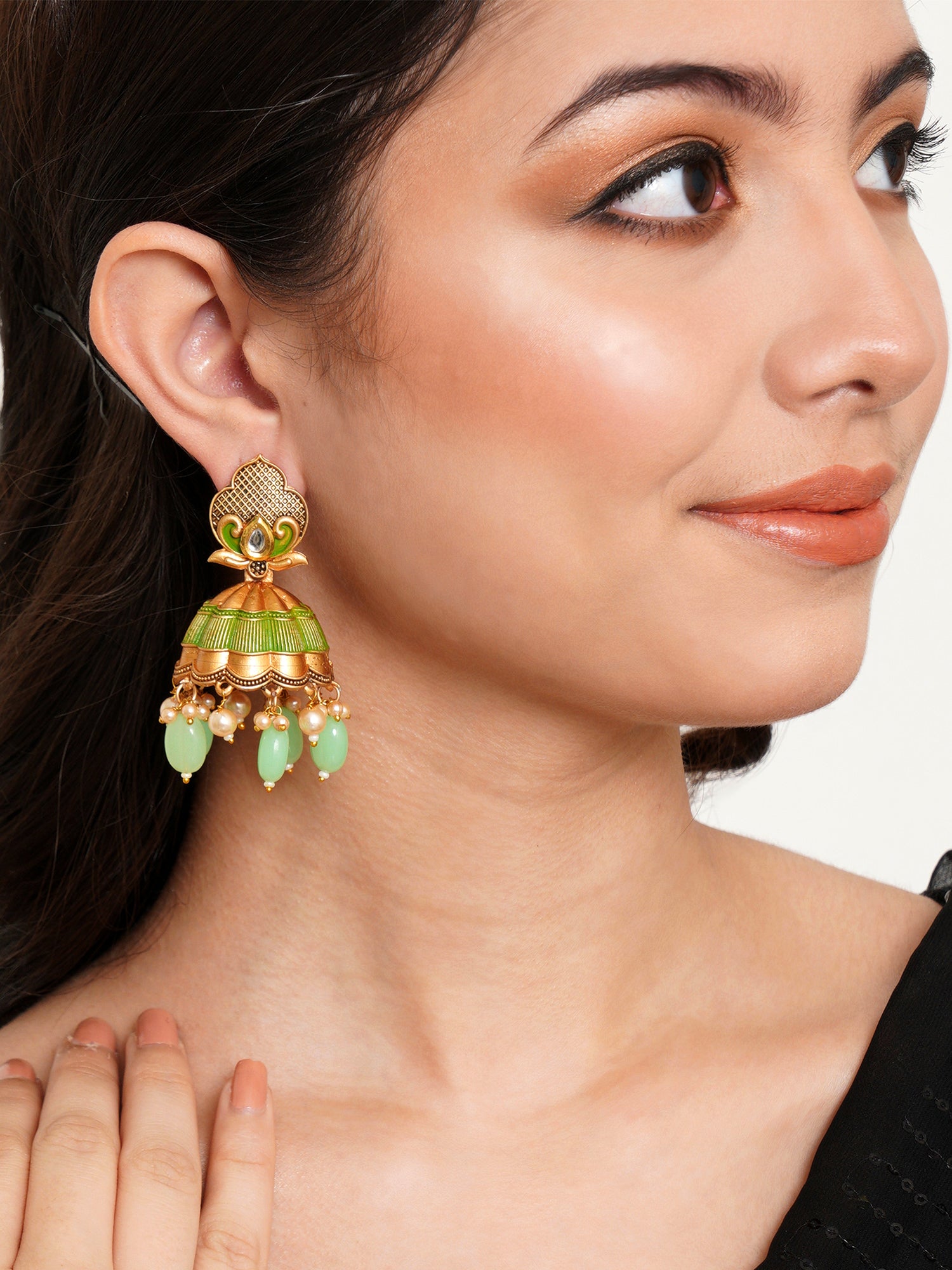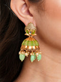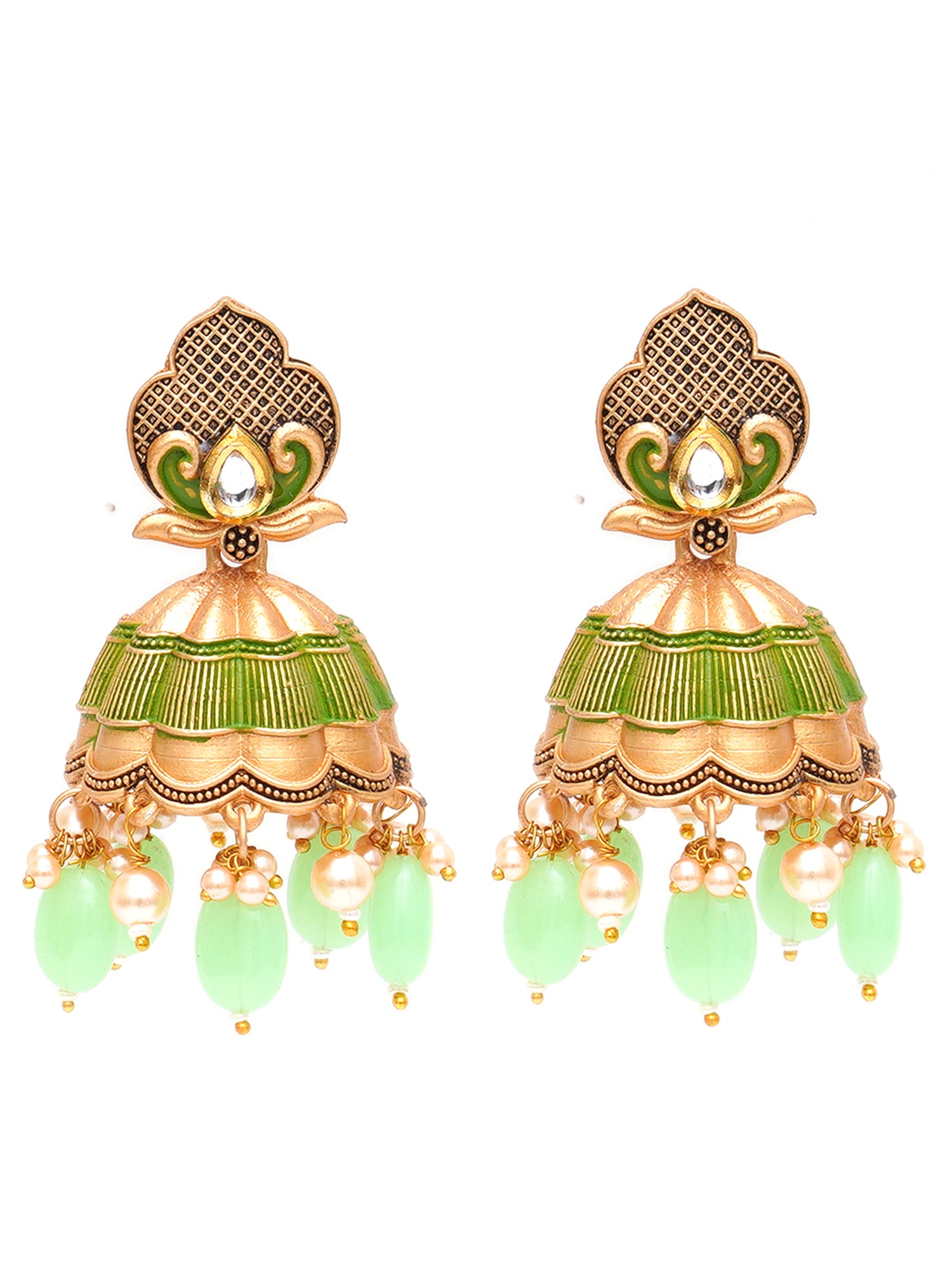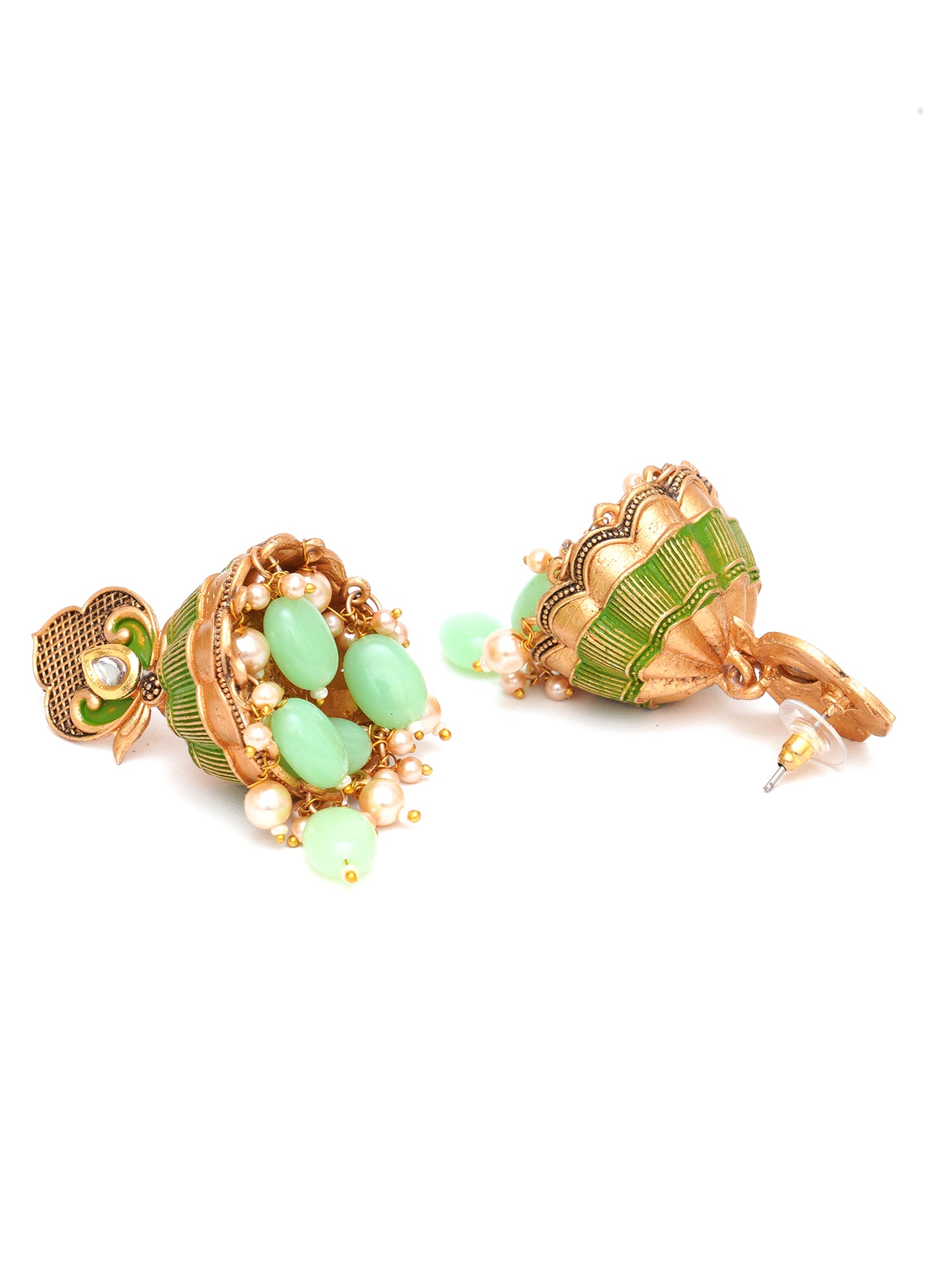 Karatcart Gold Plated Light Green Tumble and Golden Pearl Studded Jhumki Earrings for Women