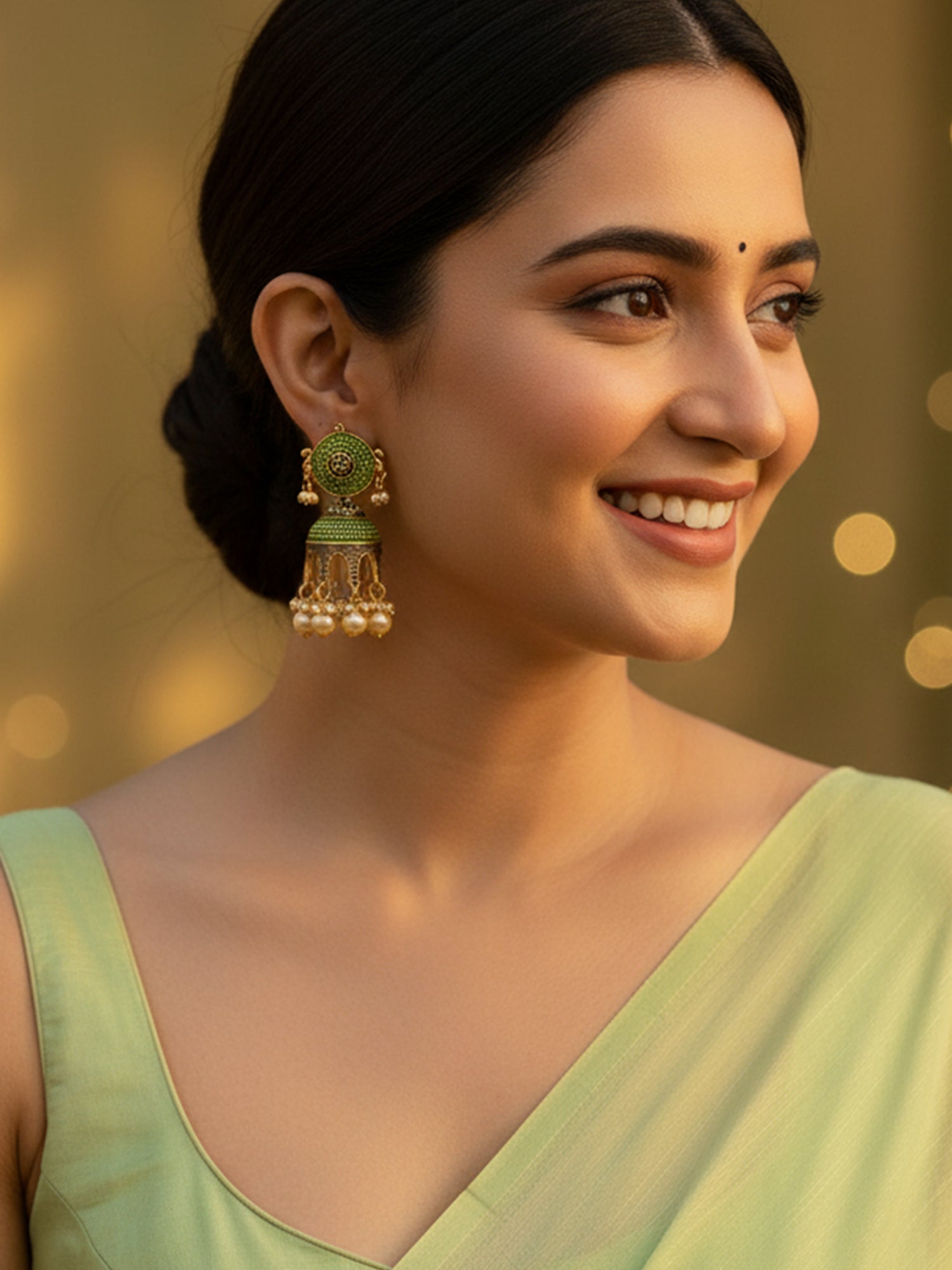- This is a Light Green Earrings by Brand Karatcart which has Enamel stones.This is Gold Plated. We at KARATCART understand your desire to look the best on any day & we thrive in making any day an occasion. Every individual at Karatcart carries a passion for jewellery and it reflects in our beautiful designs as well as in our breathtaking craftsmanship. We create unique jewellery so you can make heads turn..