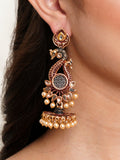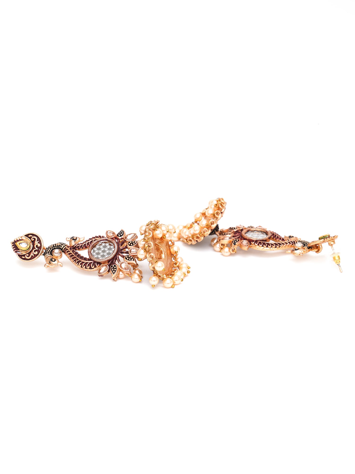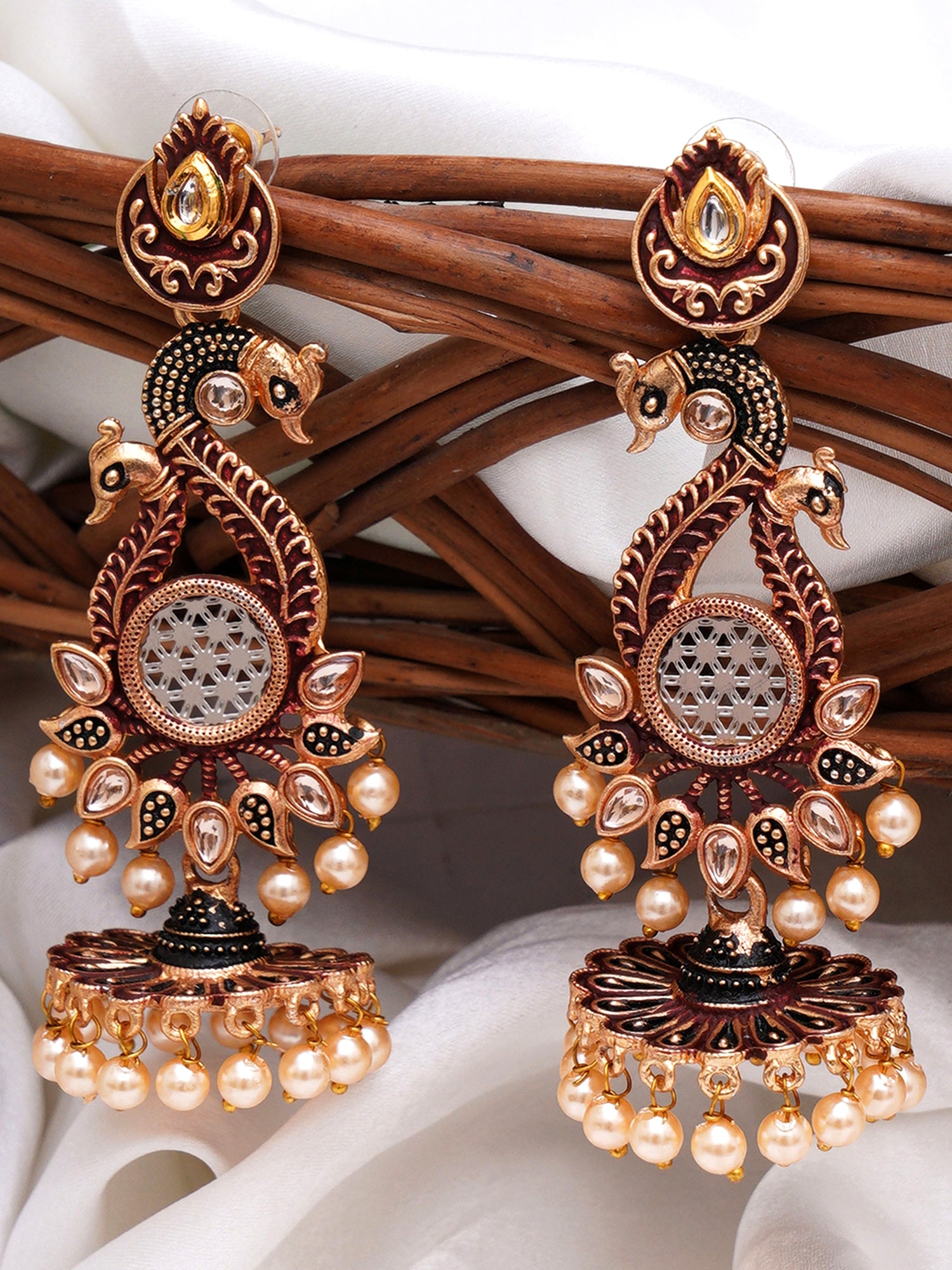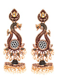 Karatcart Antique Gold Plated Kundan Studded Maroon Meena Peacock with Flat Jhumki Dangler Earrings