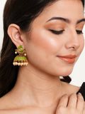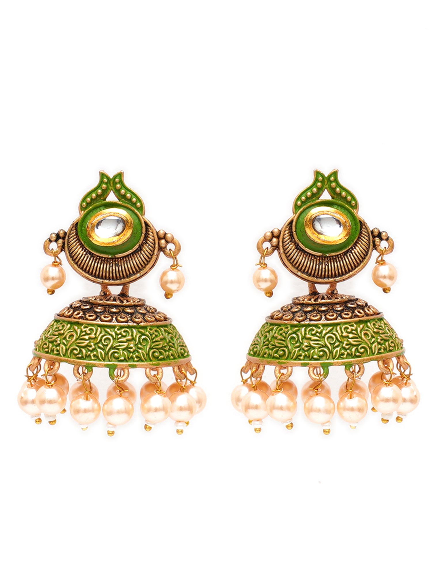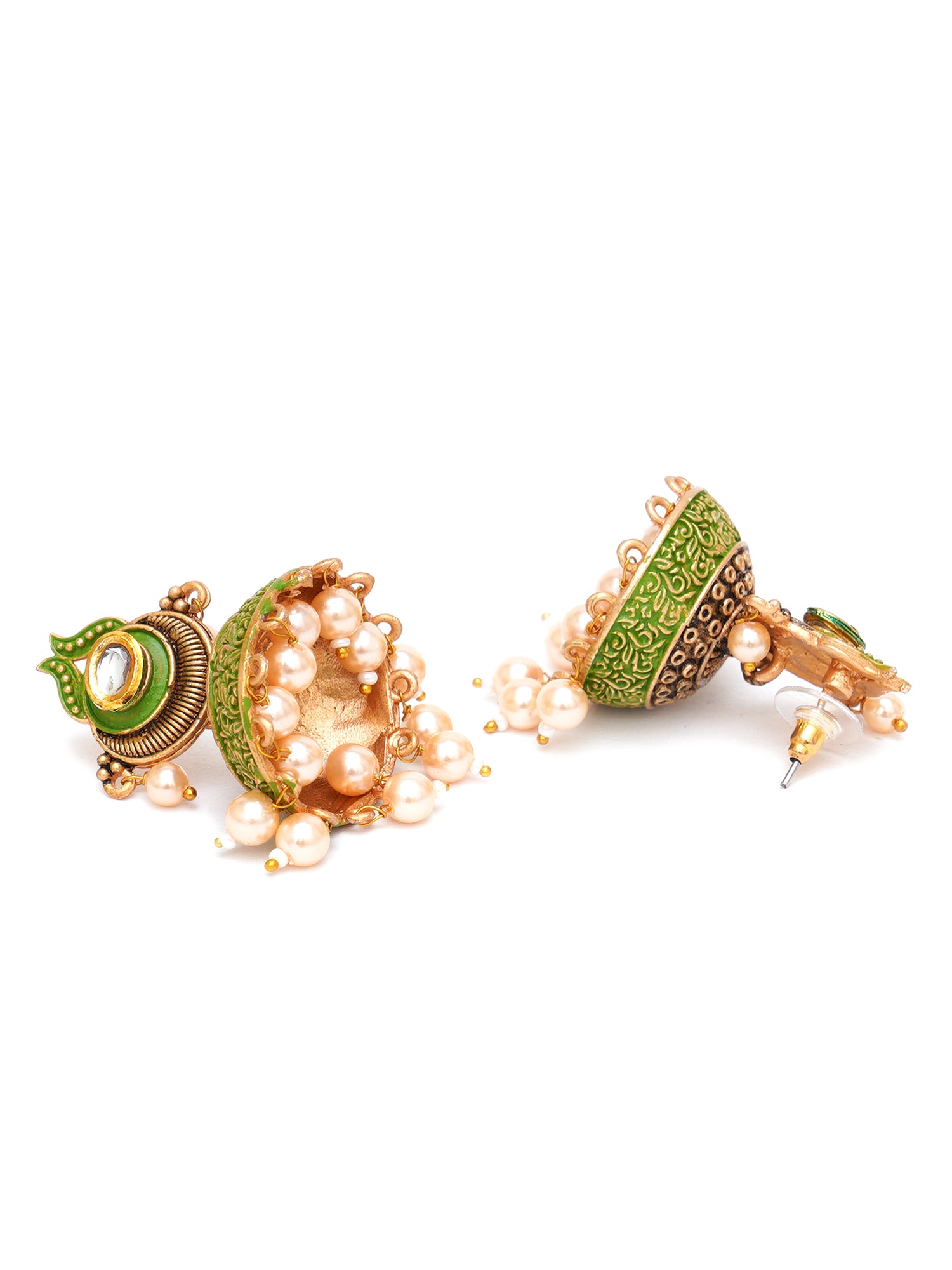 Karatcart Antique Gold Plated Polki Kundan Studded Light Green Meena Jhumki Earrings for Women