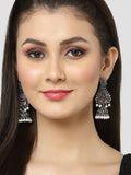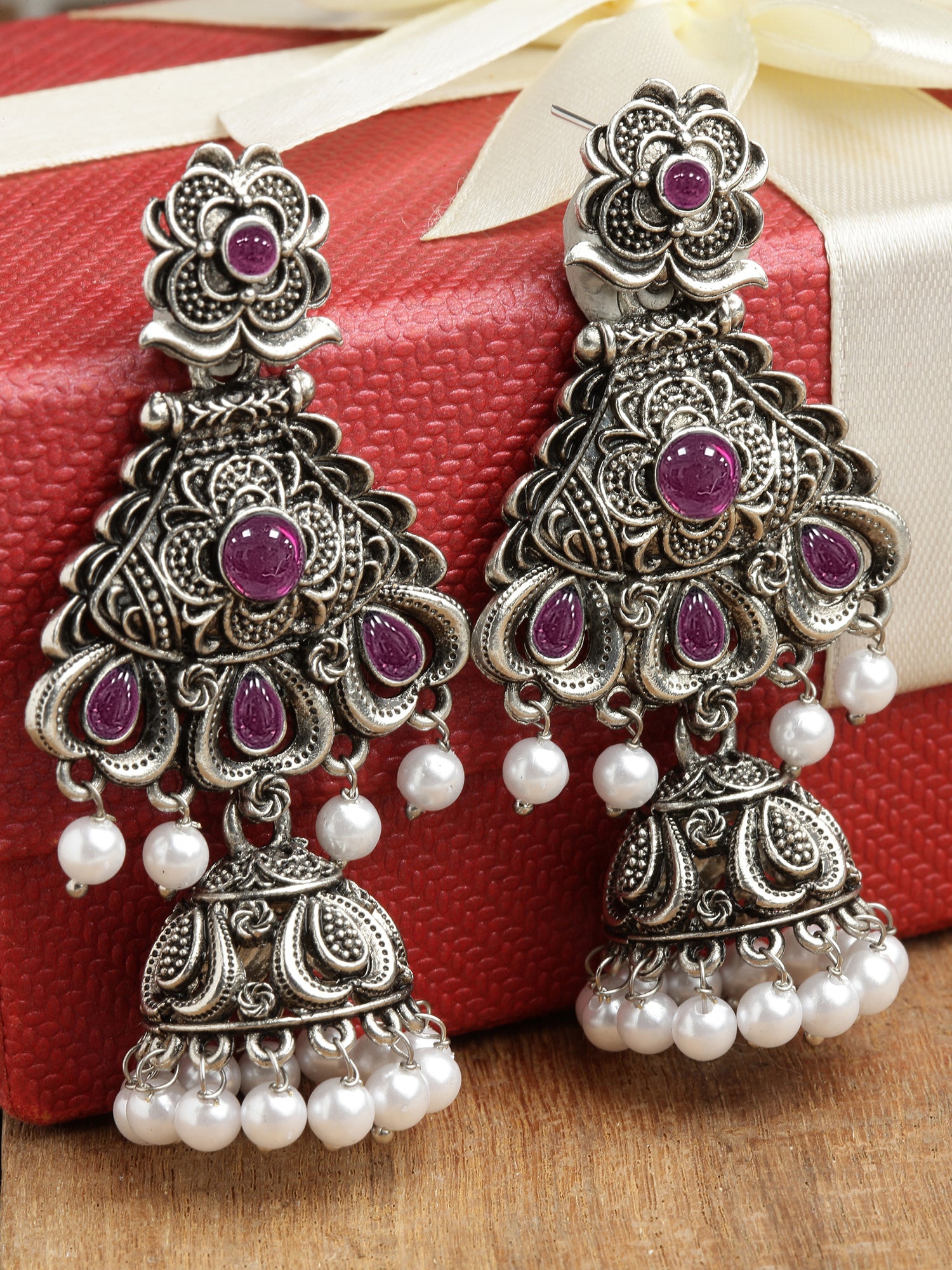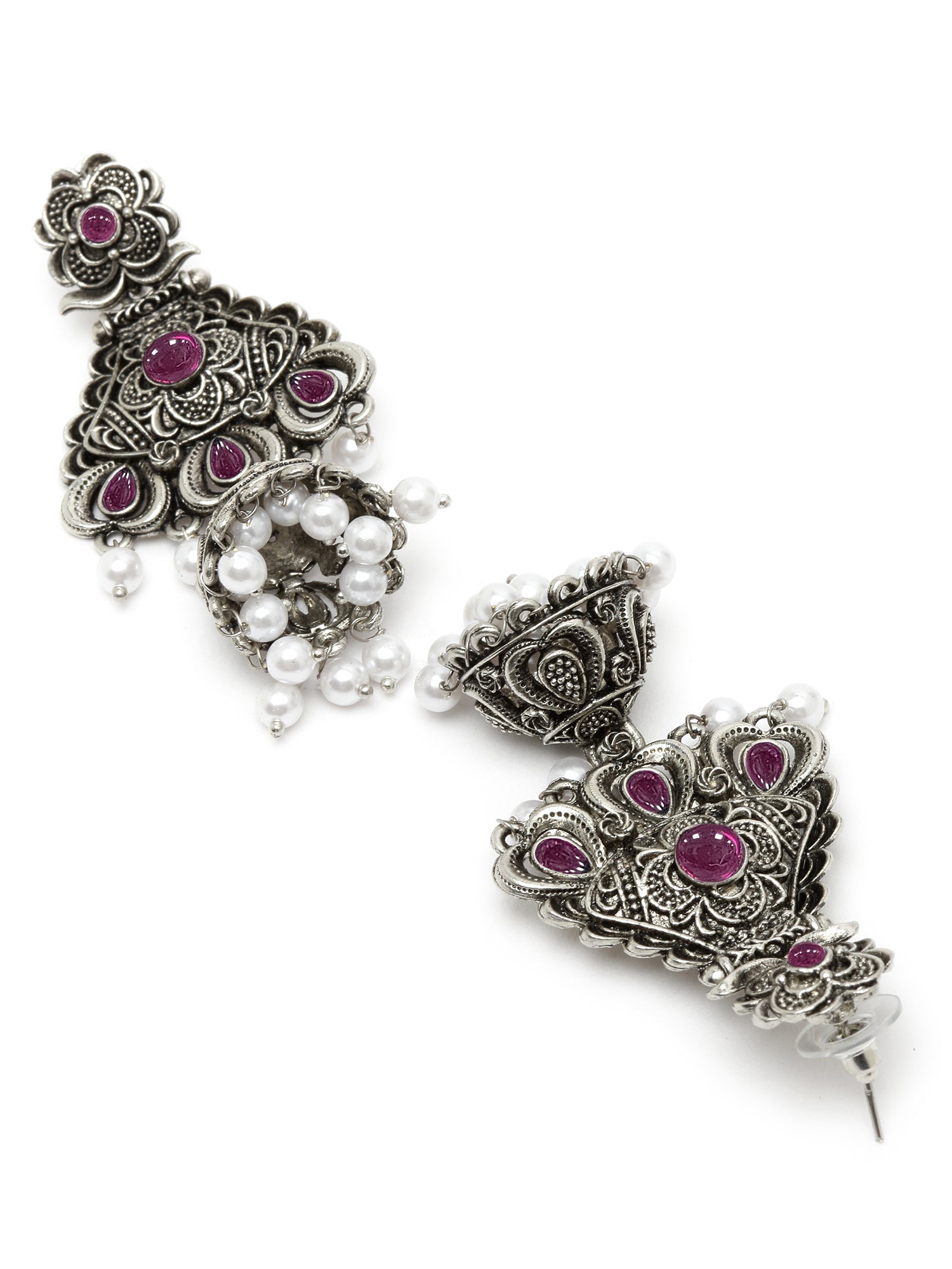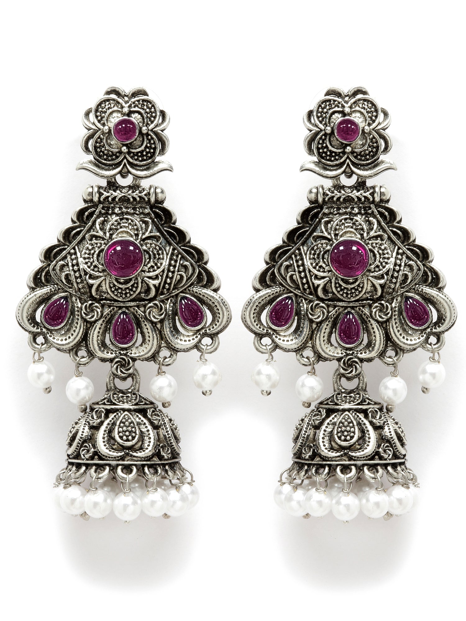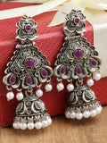 Karatcart Oxidised Silver Red Stone Studded Dangler Jhumki Earrings for Women
