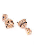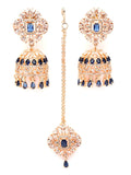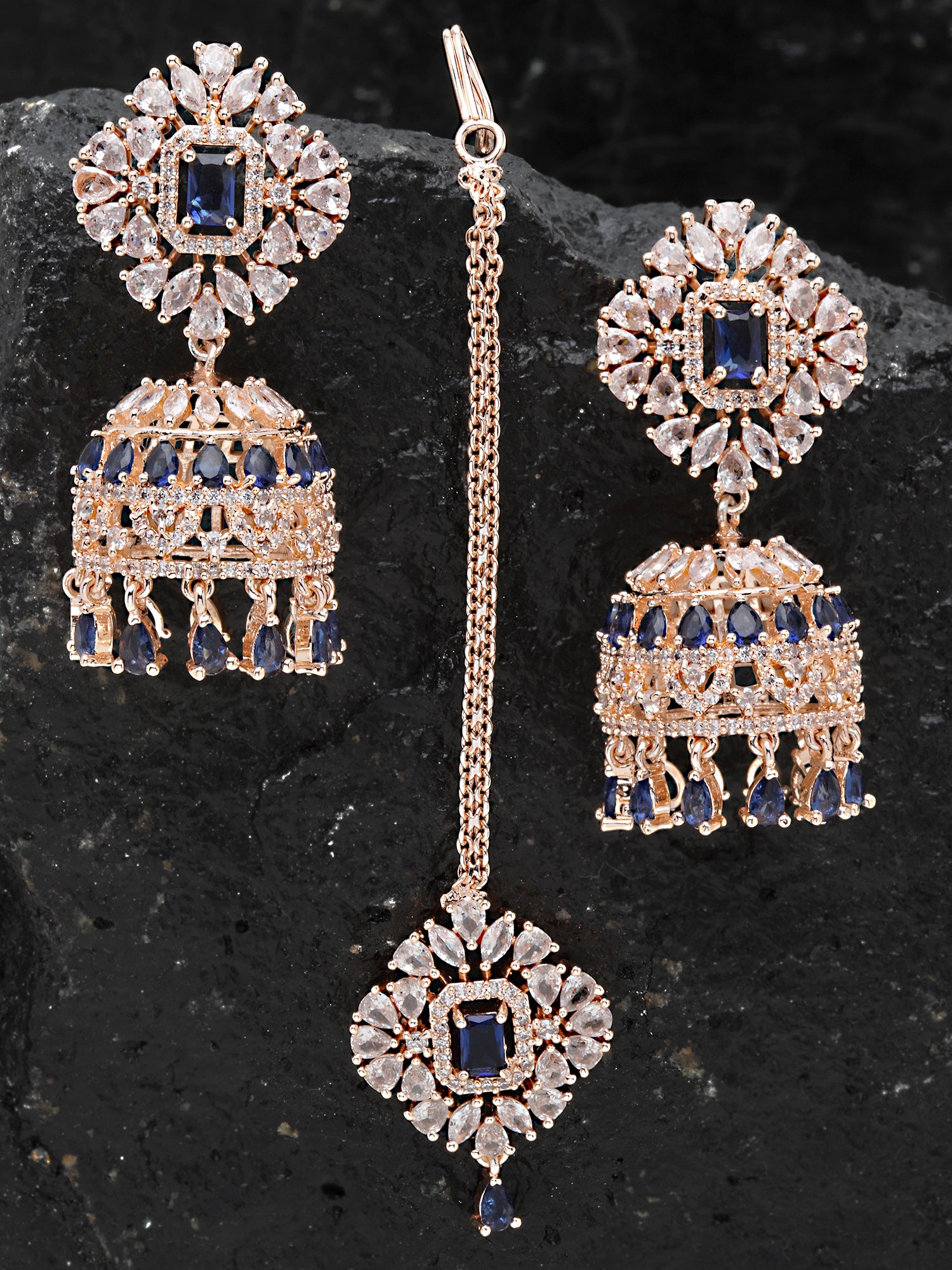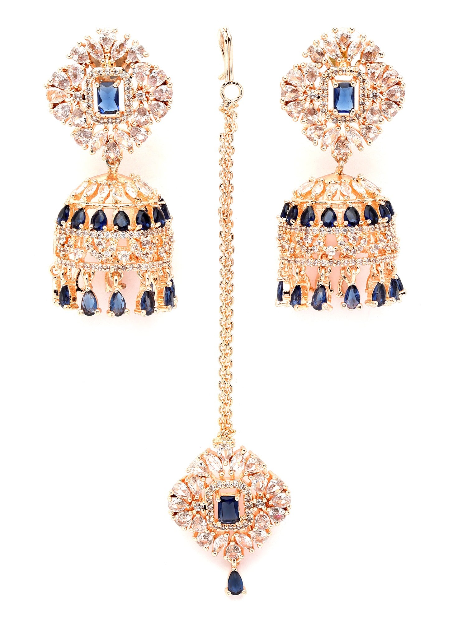 Karatcart Rose Gold Plated Blue and White CZ Studded Earrings with Maangtikka for Women