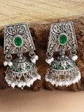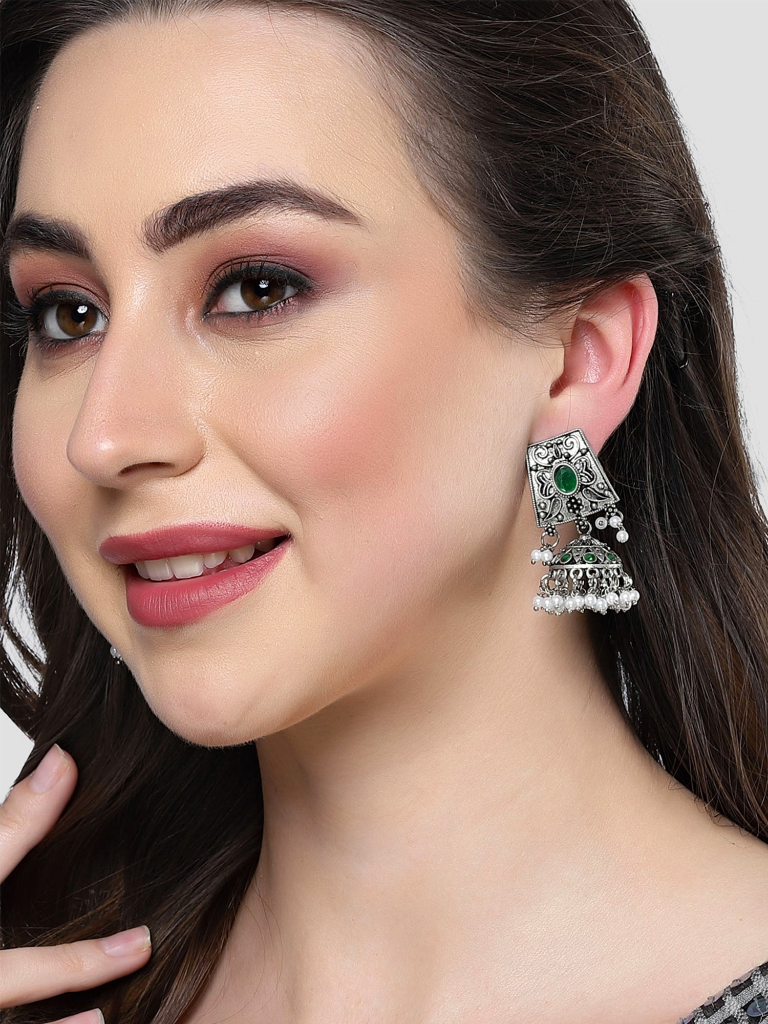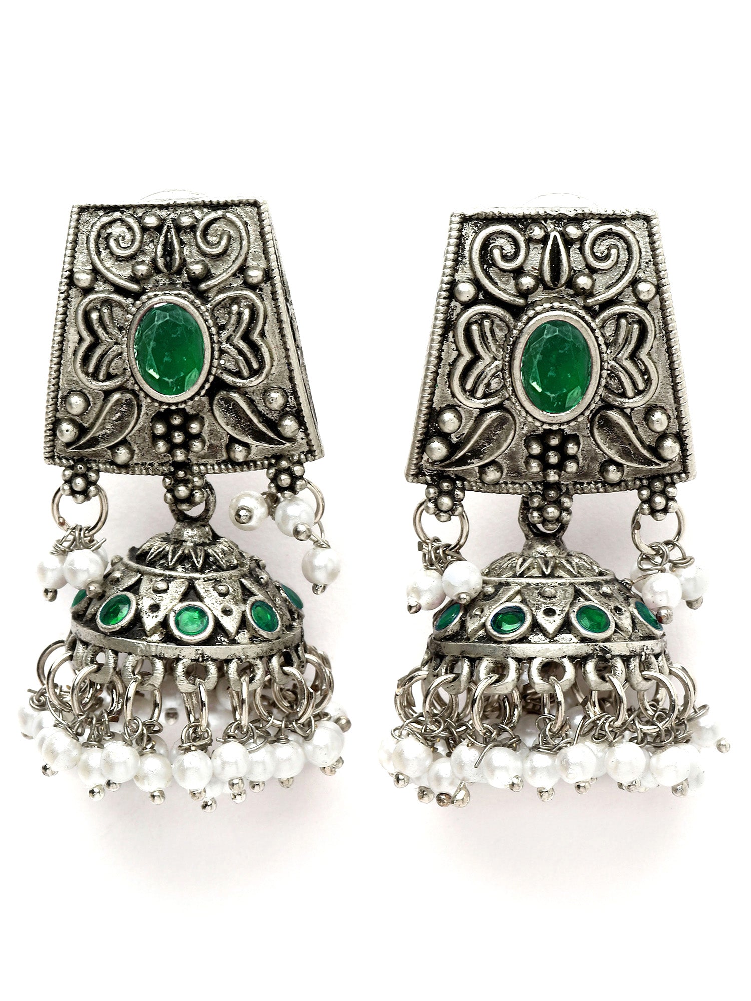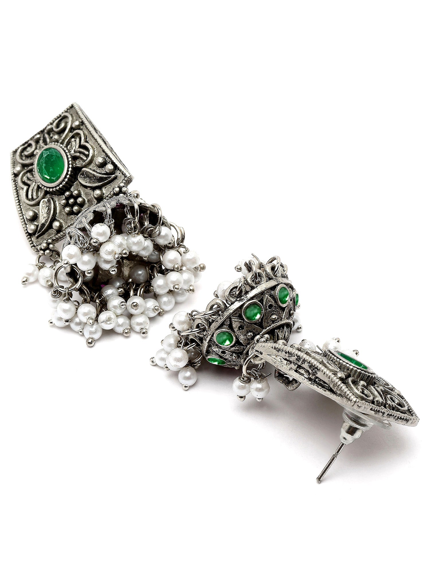 Karatcart Oxidised Silver Green Kundan Studded Jhumki Earrings for Women
