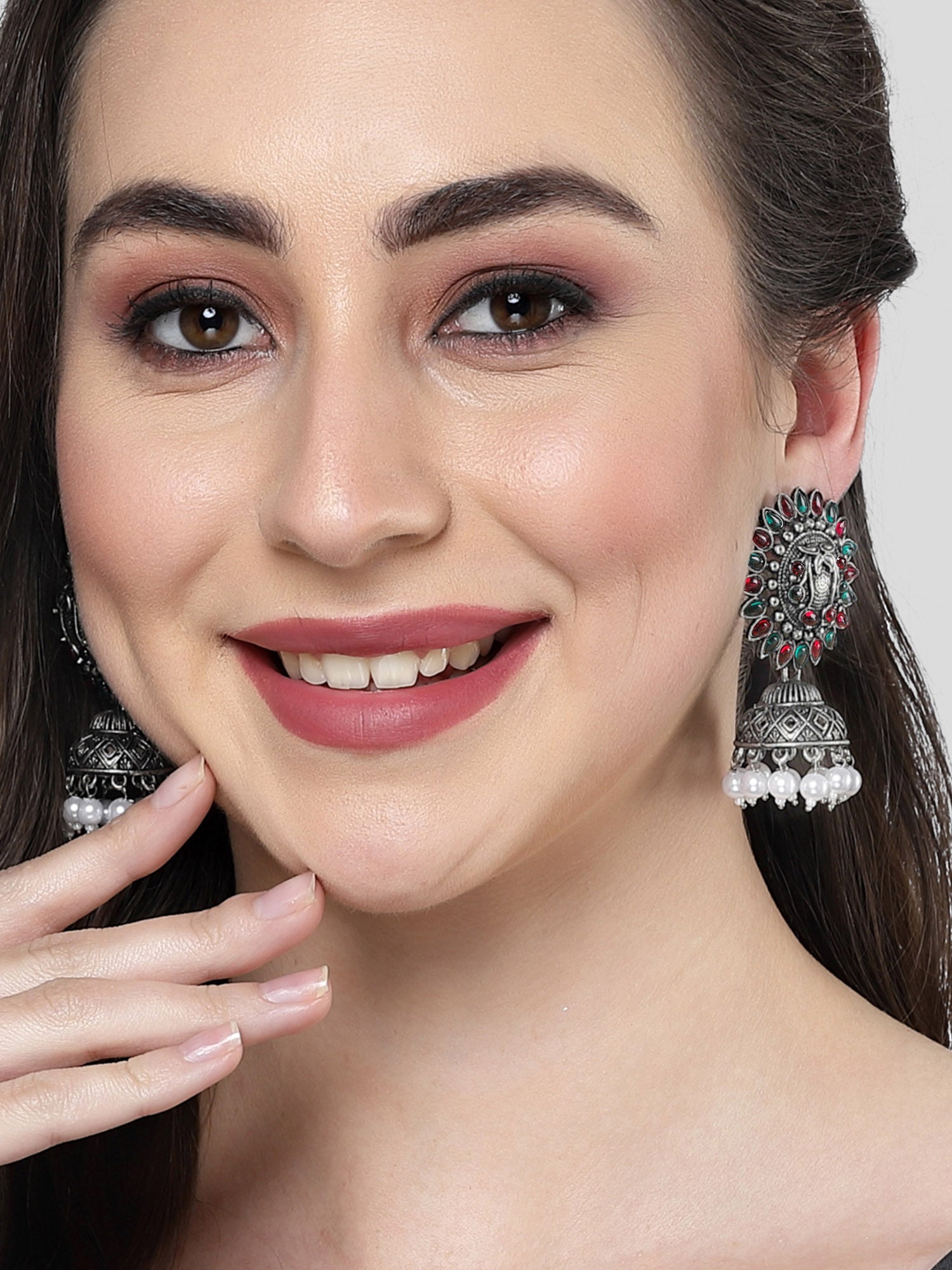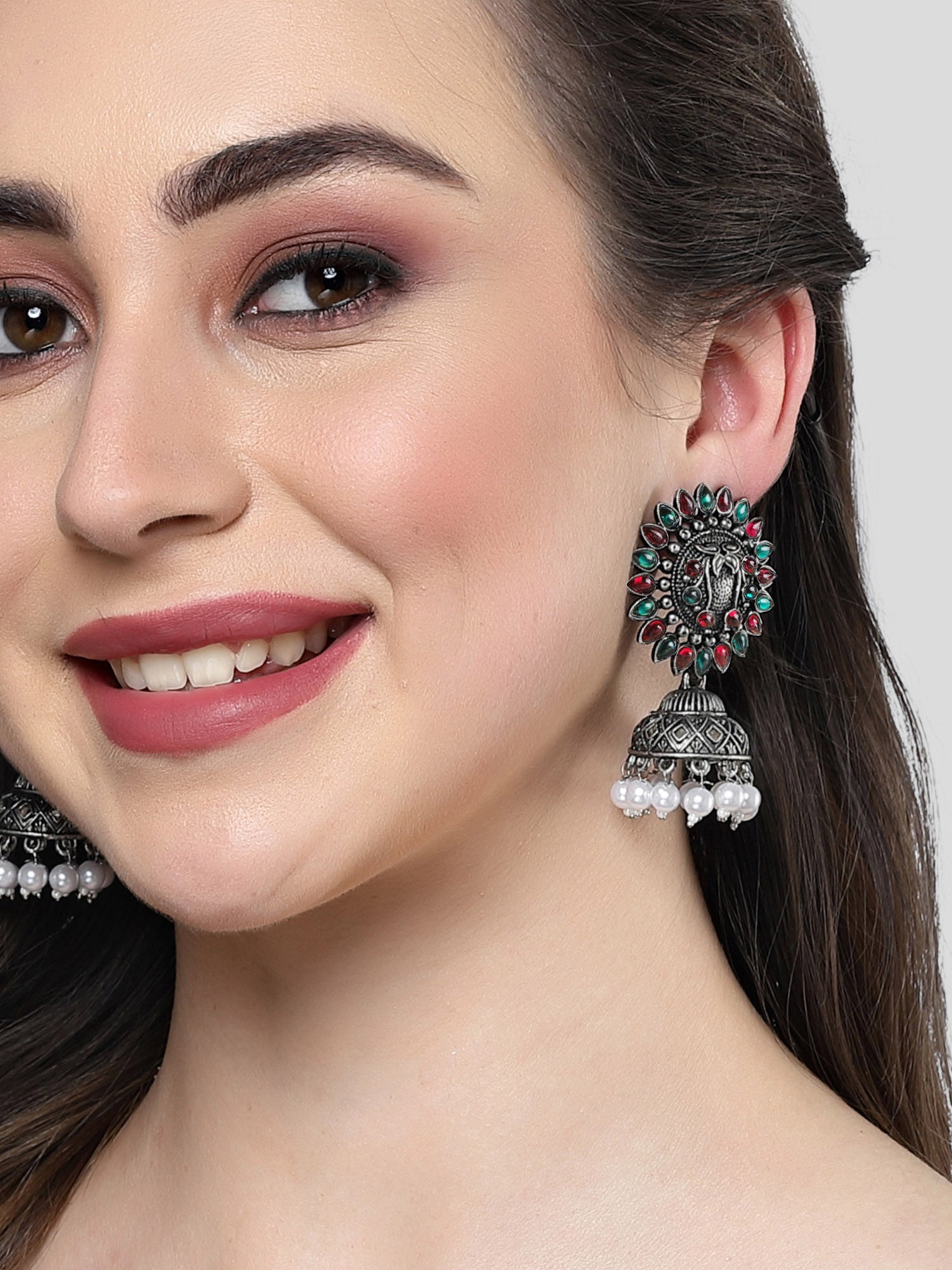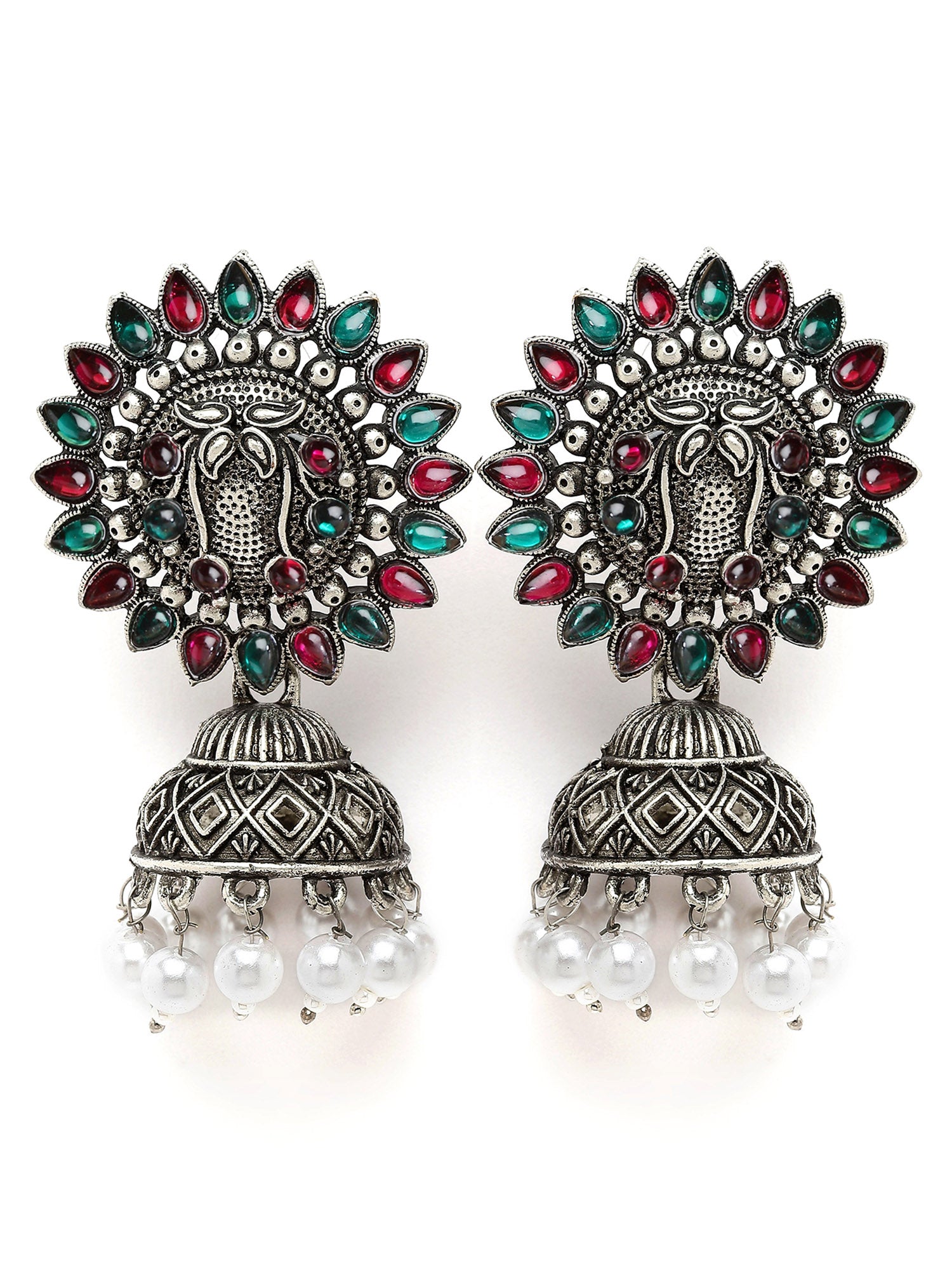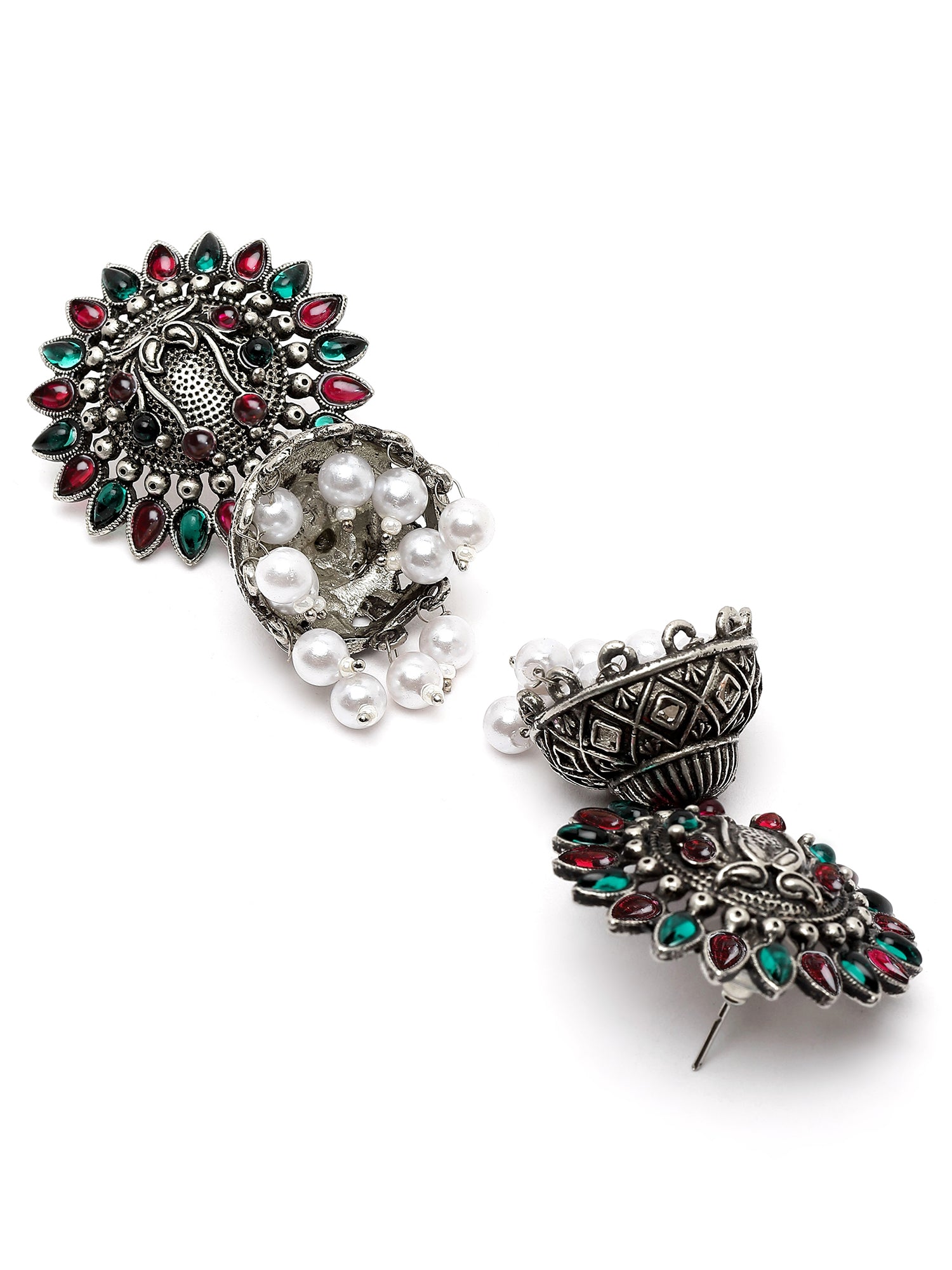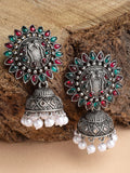 Karatcart Oxidised Silver Red and Green Stone Jhumki Earring for Women