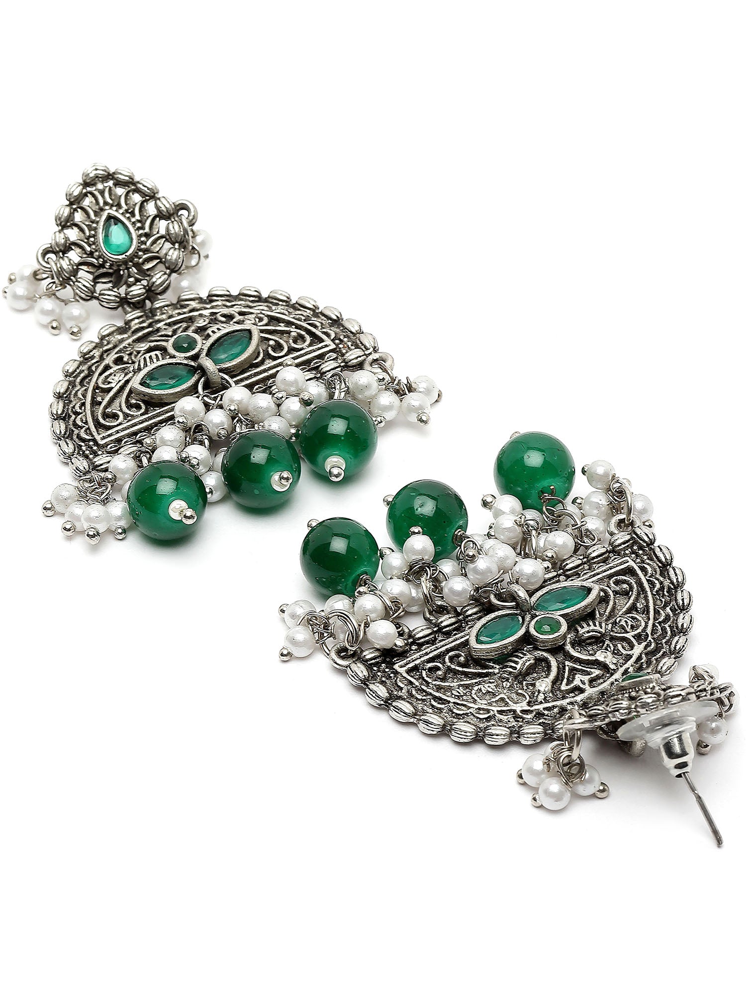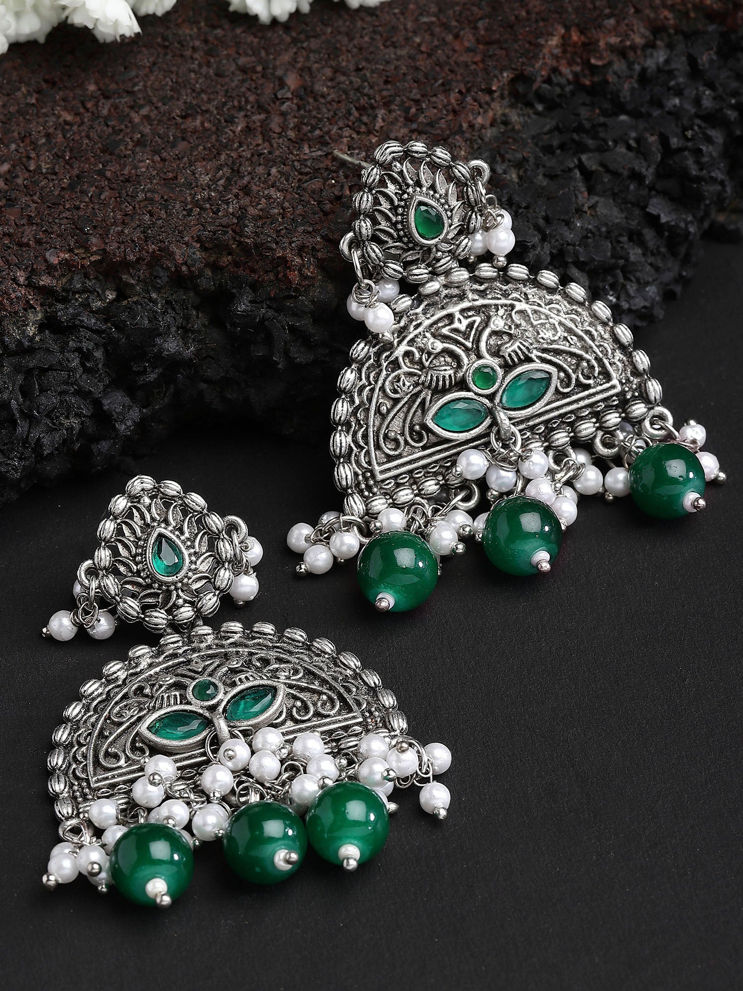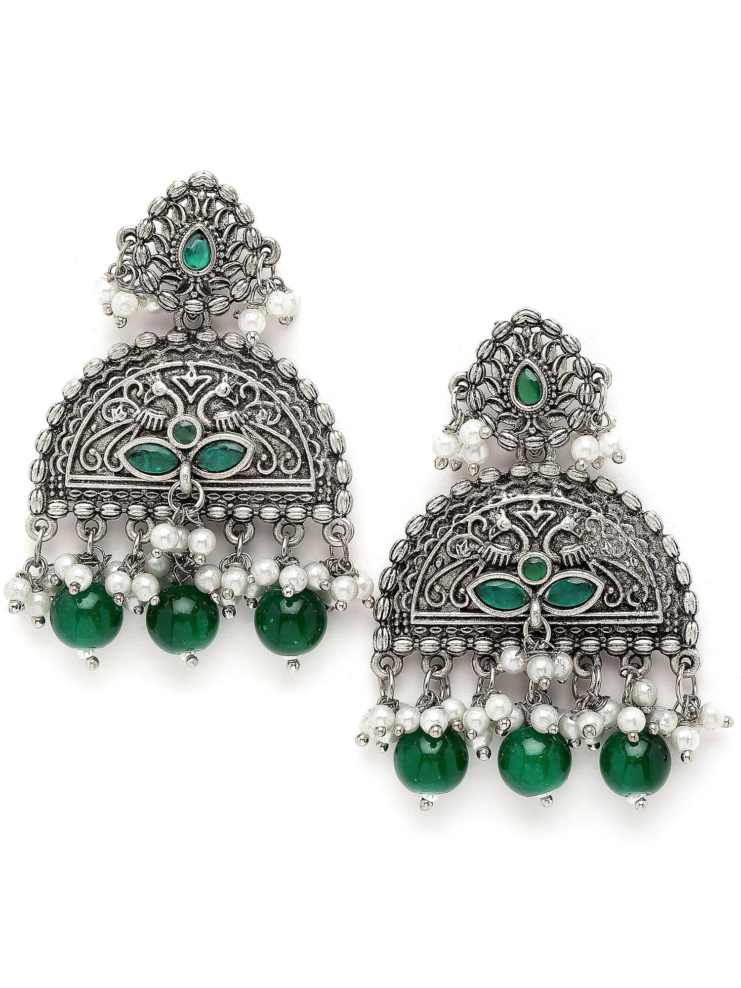 Karatcart Oxidised Silver Green Beads Peacock Design Dangler Earrings for Women