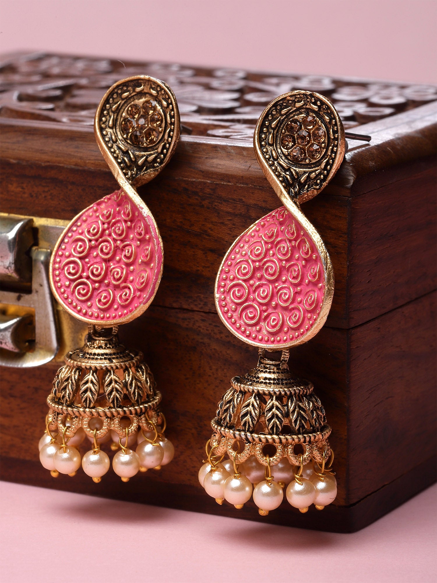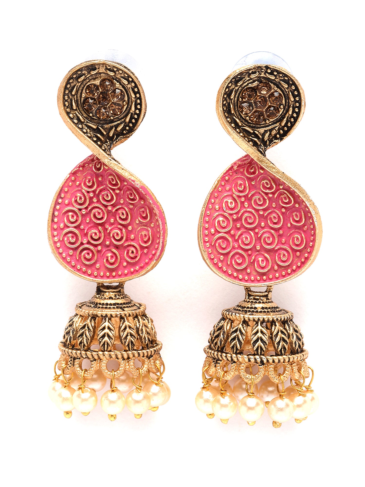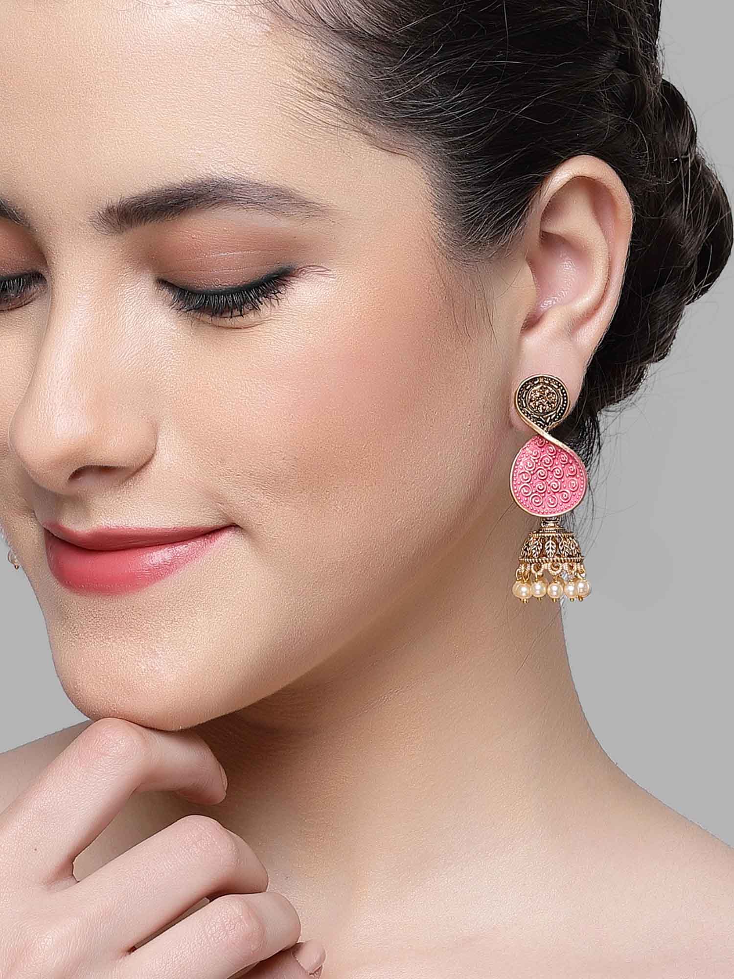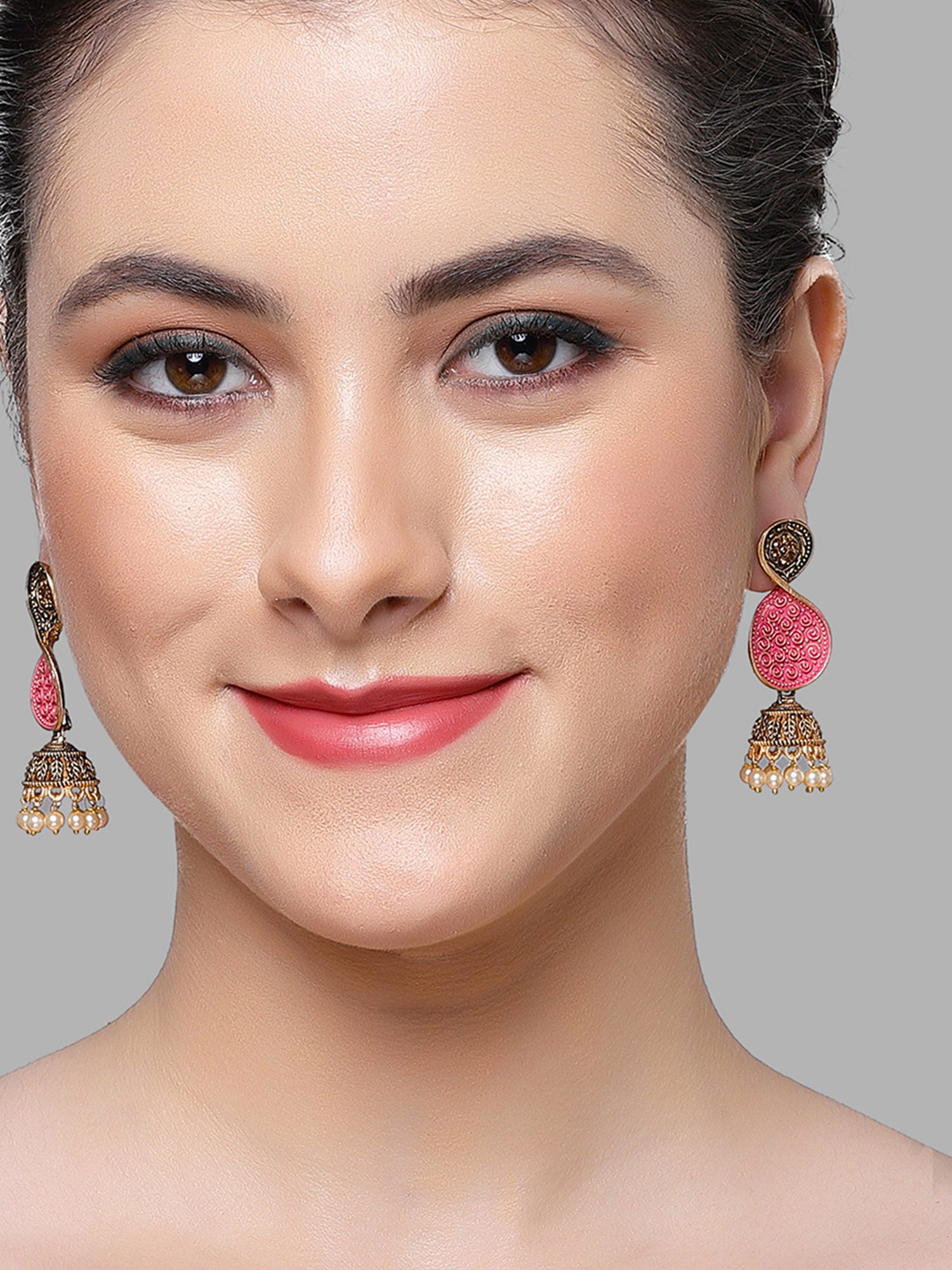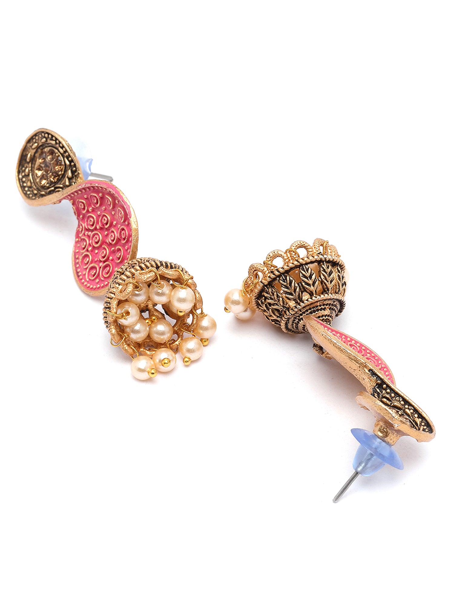 Karatcart Antique Gold Plated Pink Meena Dangler Earrings for Women