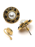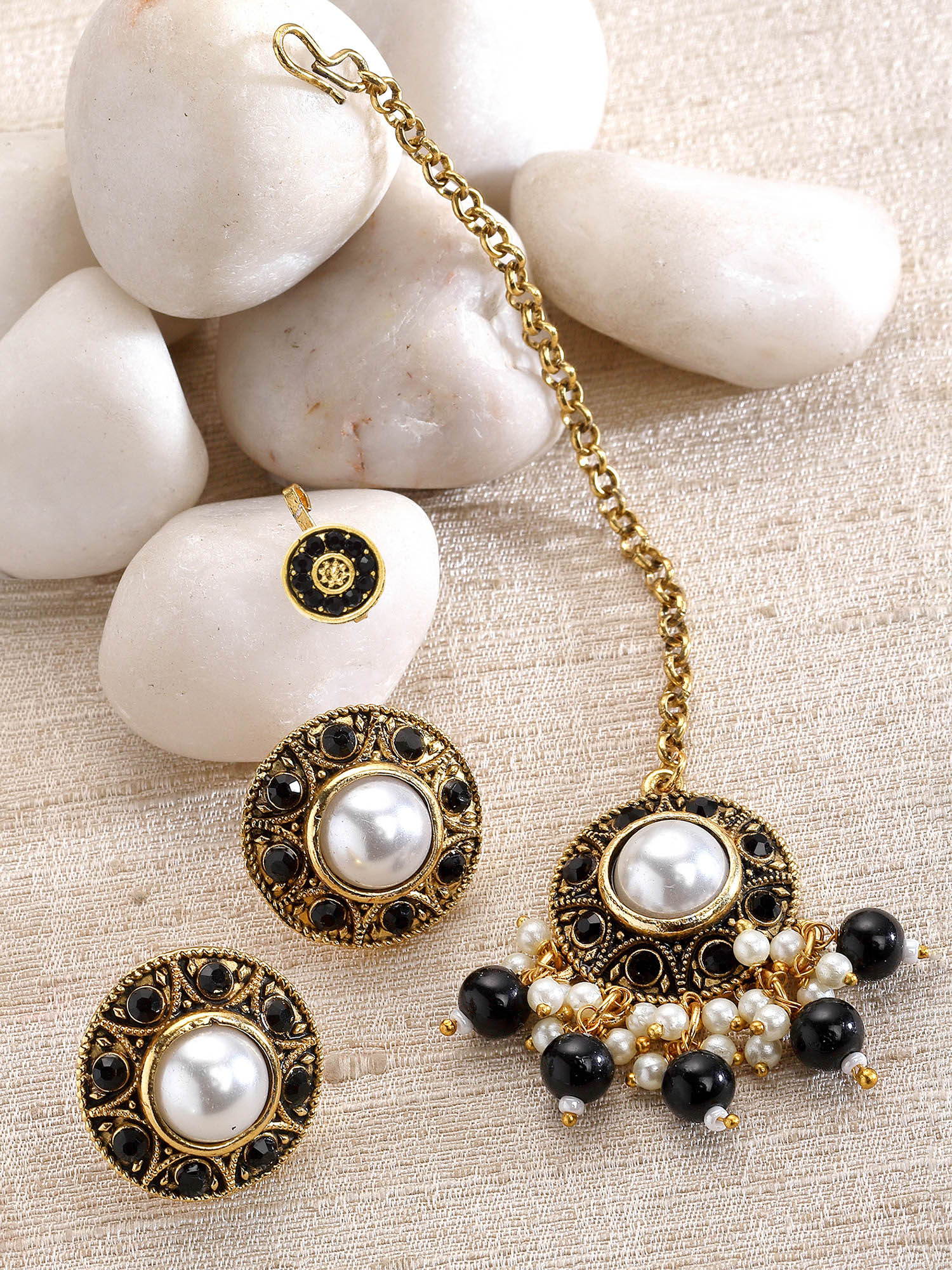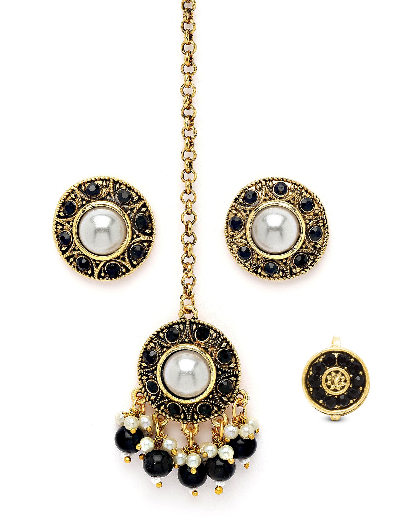 Karatcart Gold Plated Black Stone and Beads Studded Earrings with Maangtikka and Nath Combo