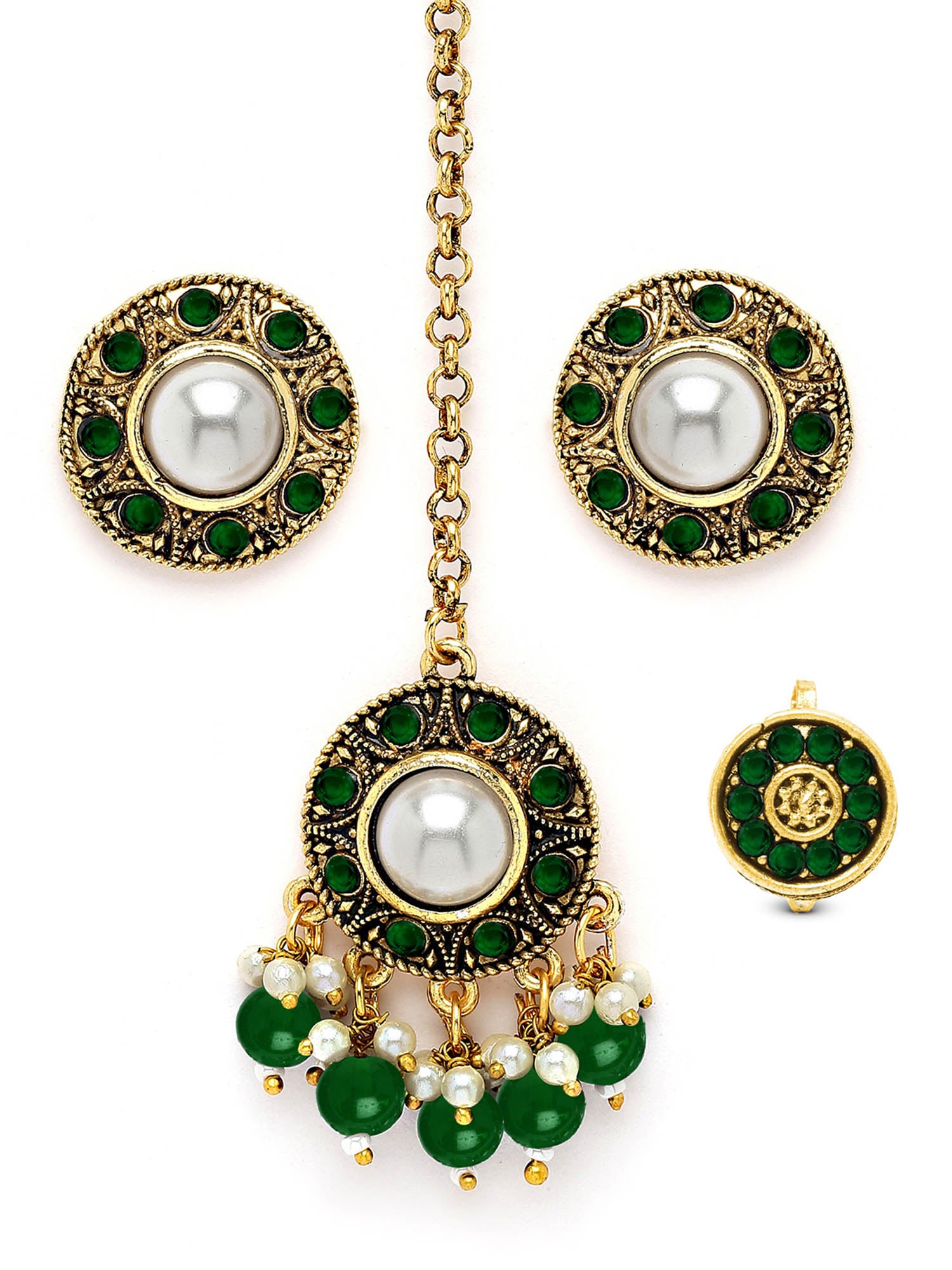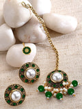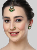 Karatcart Gold Plated Green Stone and Beads Studded Earrings with Maangtikka and Nath Combo
