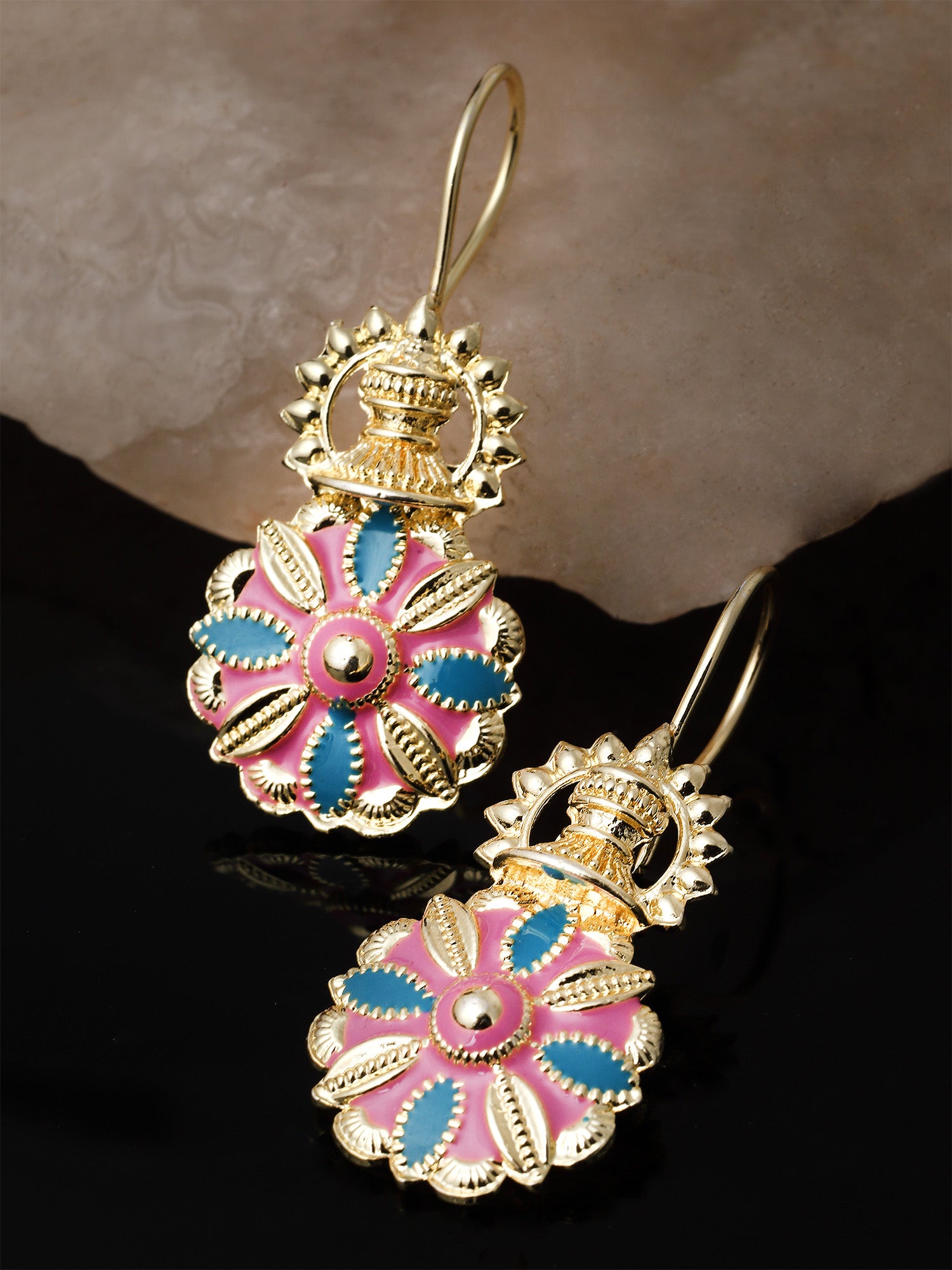 - This is a Blue and Pink Earrings by Brand Karatcart which has Enamel stones.This is Gold Plated. We at KARATCART understand your desire to look the best on any day & we thrive in making any day an occasion. Every individual at Karatcart carries a passion for jewellery and it reflects in our beautiful designs as well as in our breathtaking craftsmanship. We create unique jewellery so you can make heads turn..