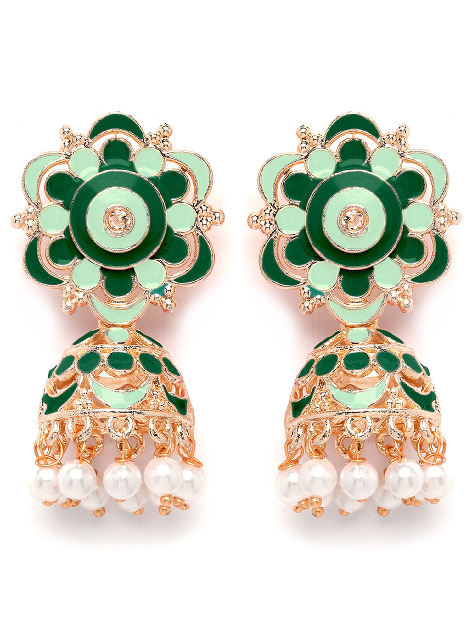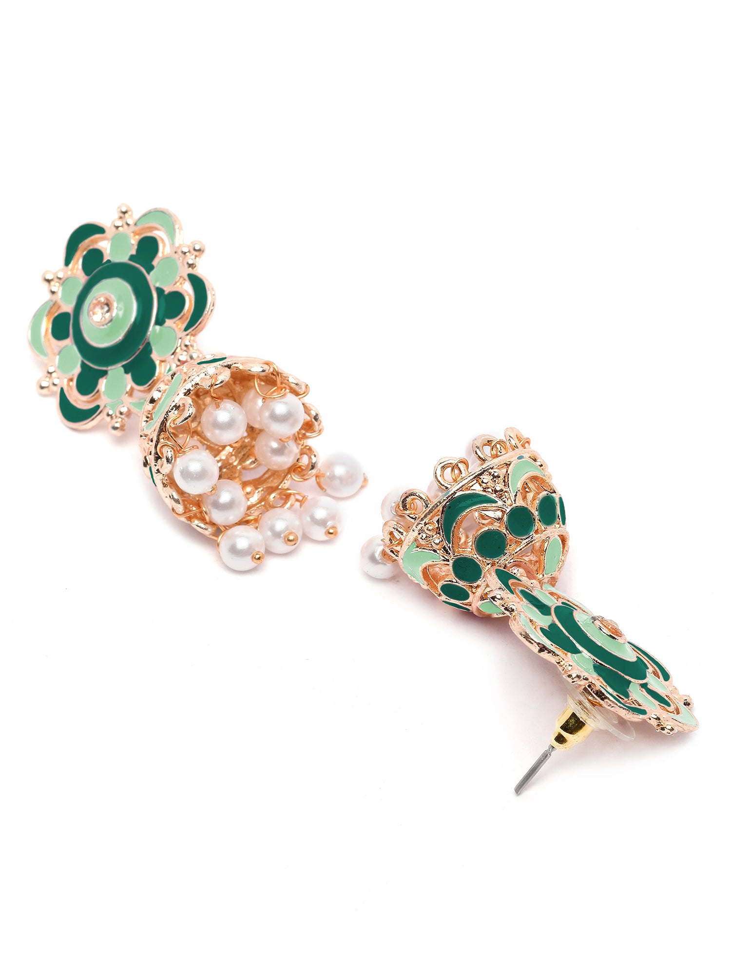 Karatcart Rose Gold Plated Floral Design Green and Lime Green Meena Jhumki Earrings for Women