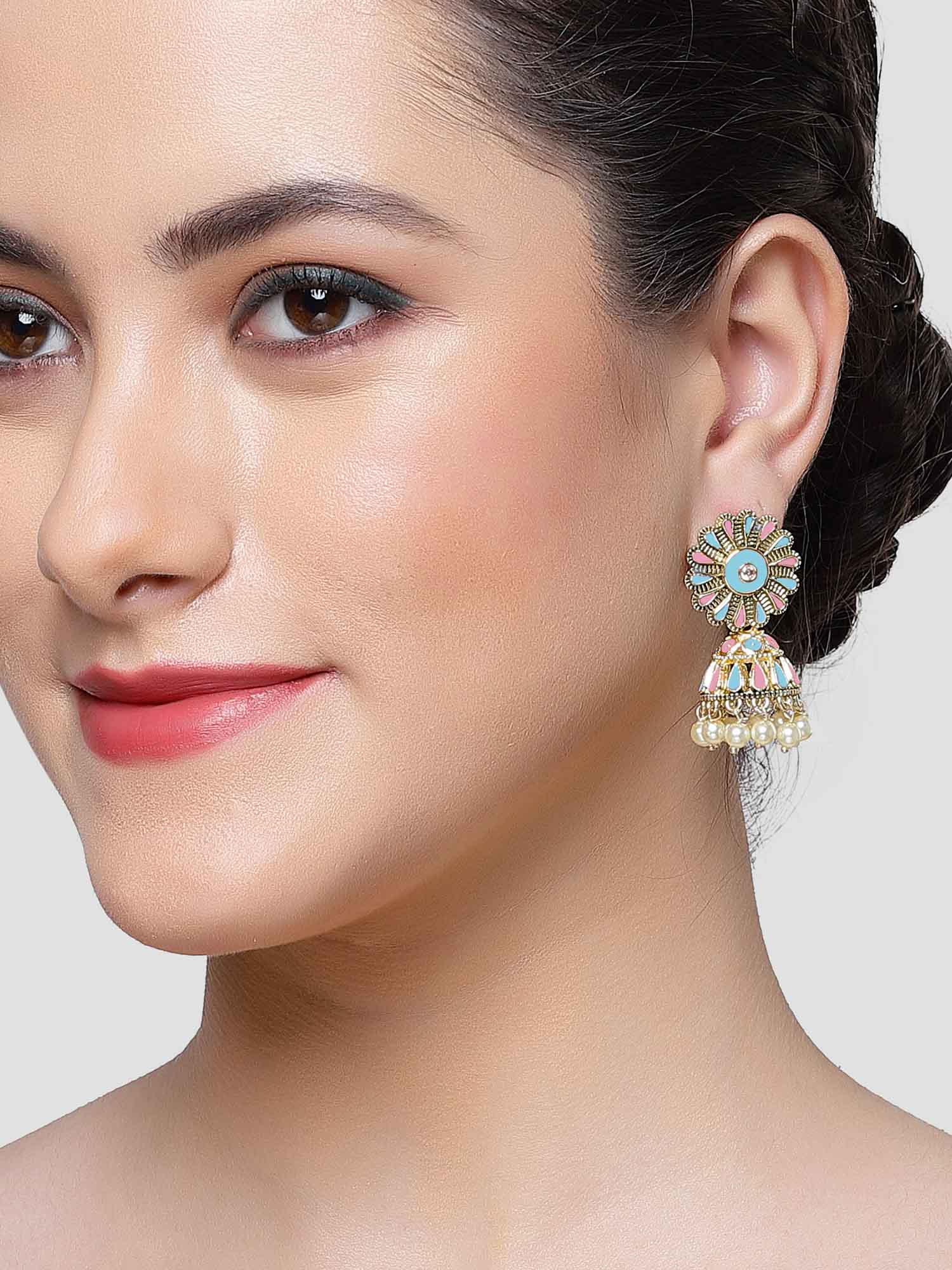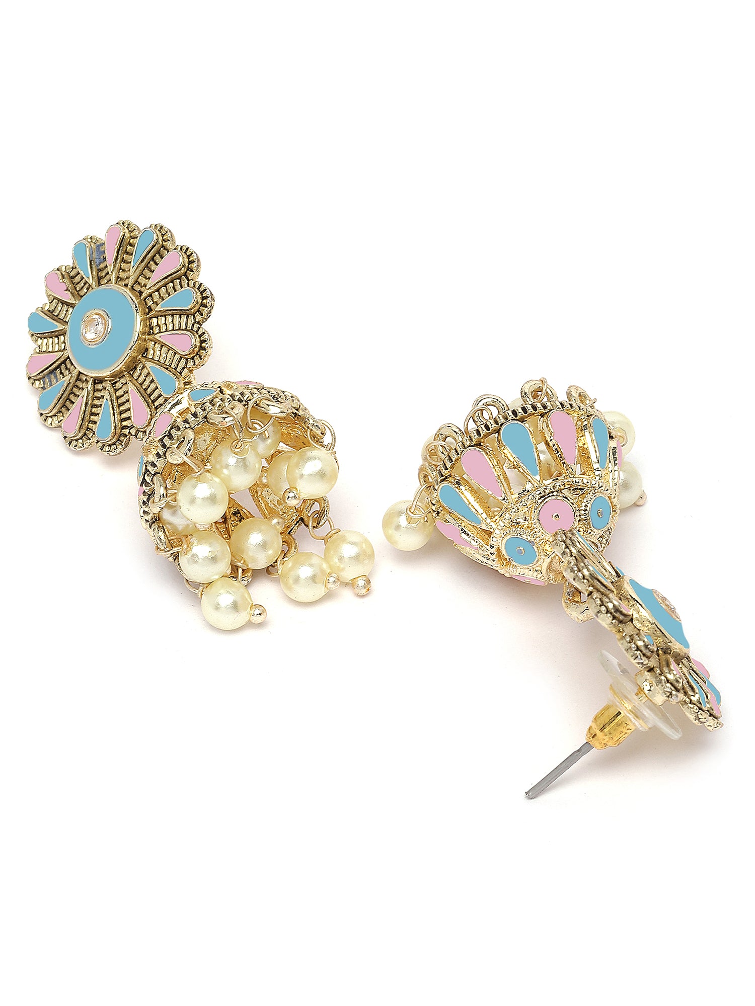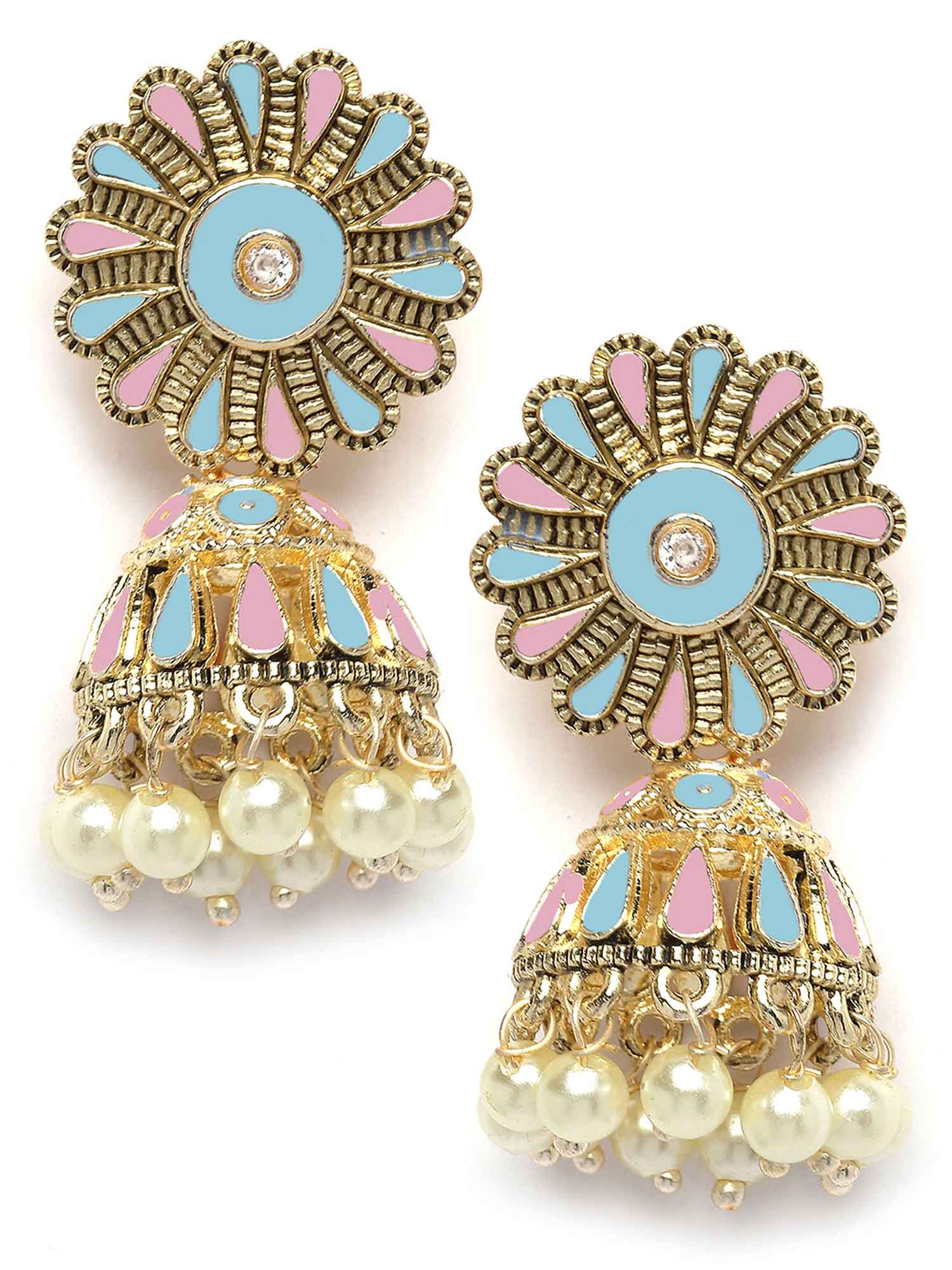 Karatcart Gold Plated Floral Design Pink and Light Blue Meena Jhumki Earrings for Women